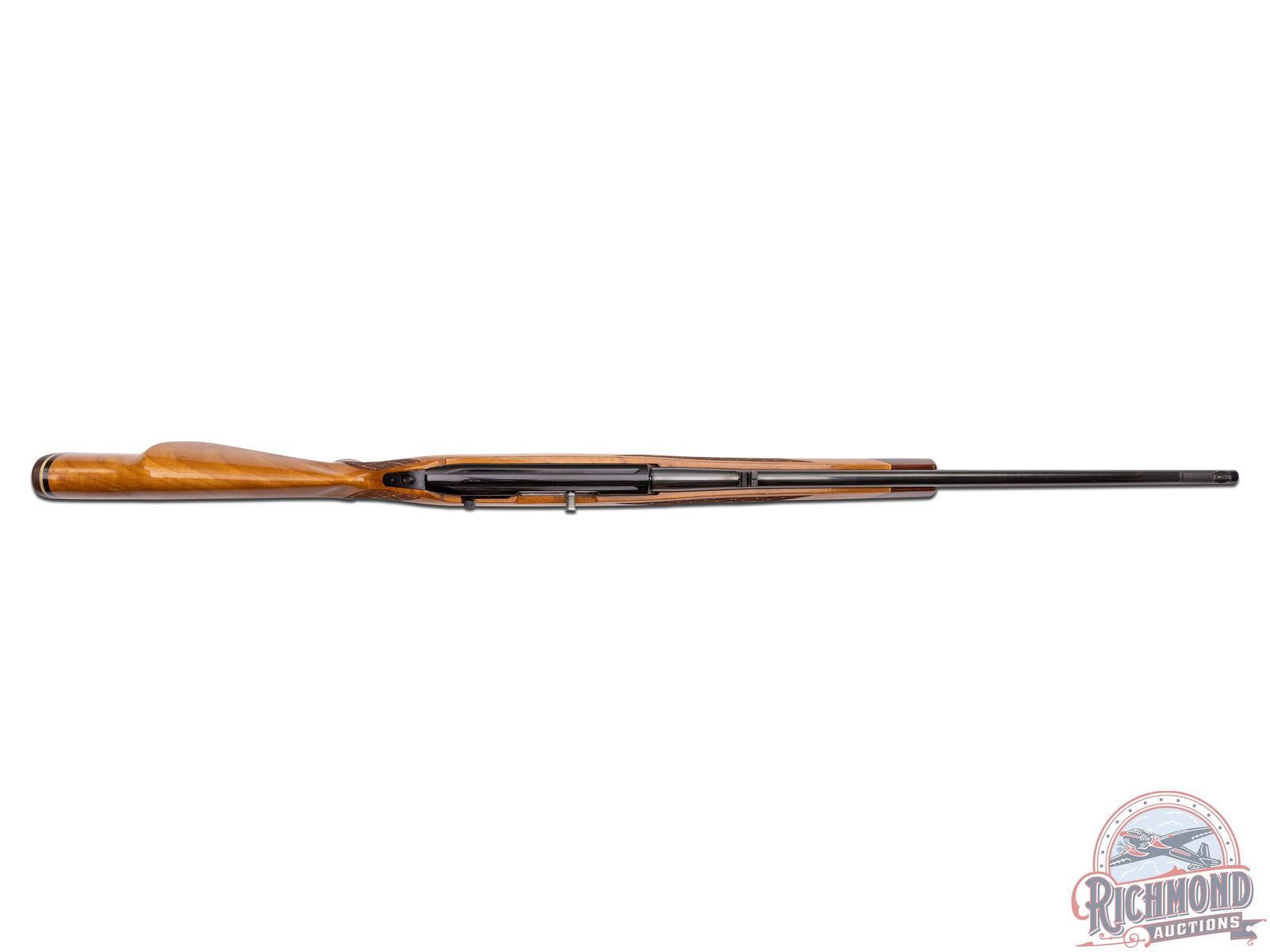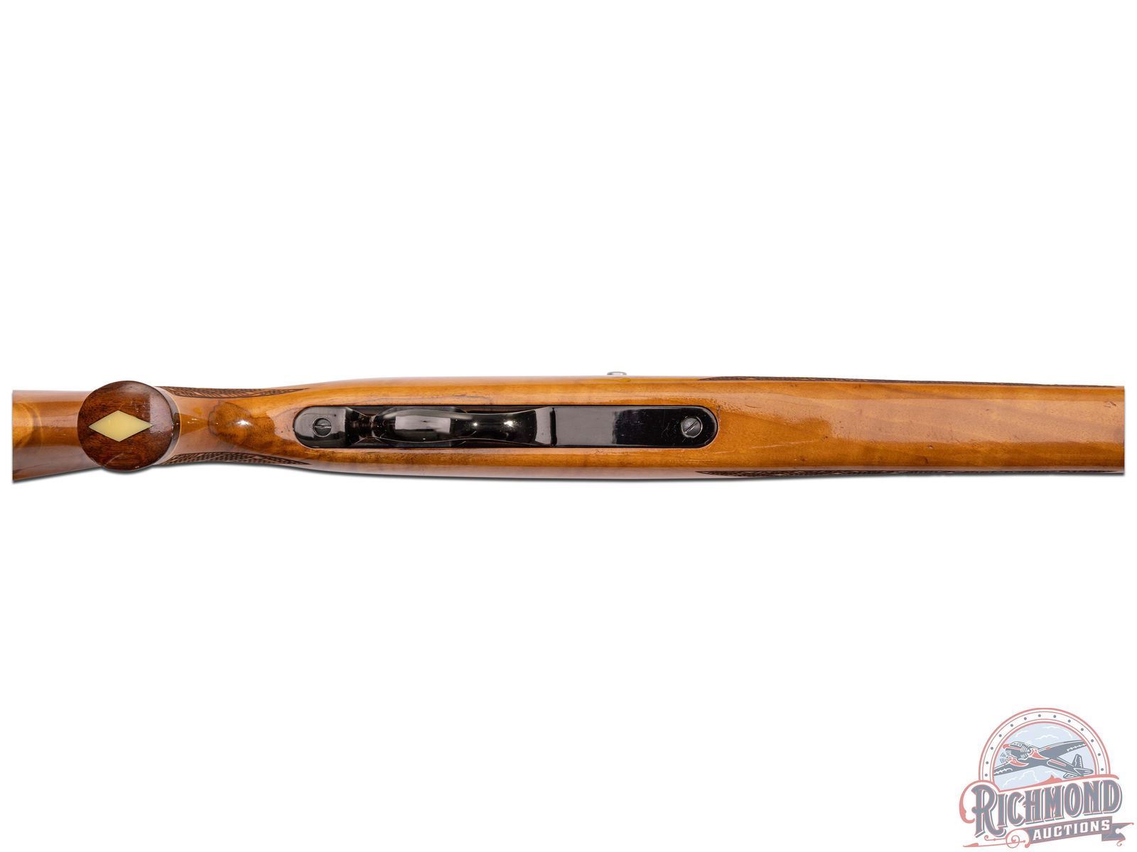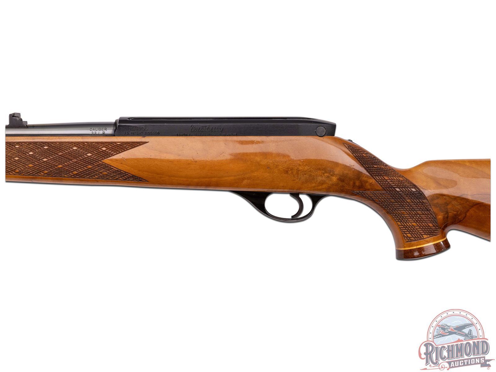 Manufactured circa 1975 by Weatherby in Japan. Features a 24" blued tapered barrel with 3-range leaf flip-up rear notch and blade with brass bead front sight. Tubular magazine feeds a semi-automatic action with half jeweled bolt. Blued receiver with dovetail groove. Tang mounted manual thumb safety and blued steel trigger guard. High gloss wood birch stock with skip-line hand checkering on pistol grip and forearm. Right side cheekpiece. White lined Rosewood tip and pistol grip cap with white diamond inlay. Black and white lined factory brown recoil pad and equipped with sling swivels. LOP: 13-1/2". CALIBER: 22 LR. S/N: T07889. FFL STATUS: Modern.