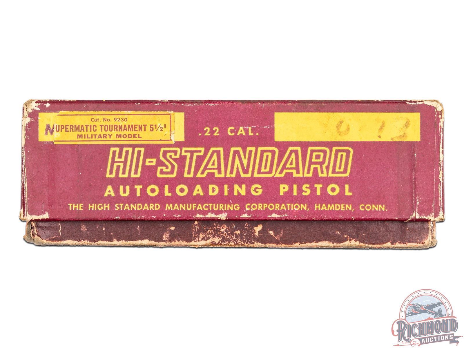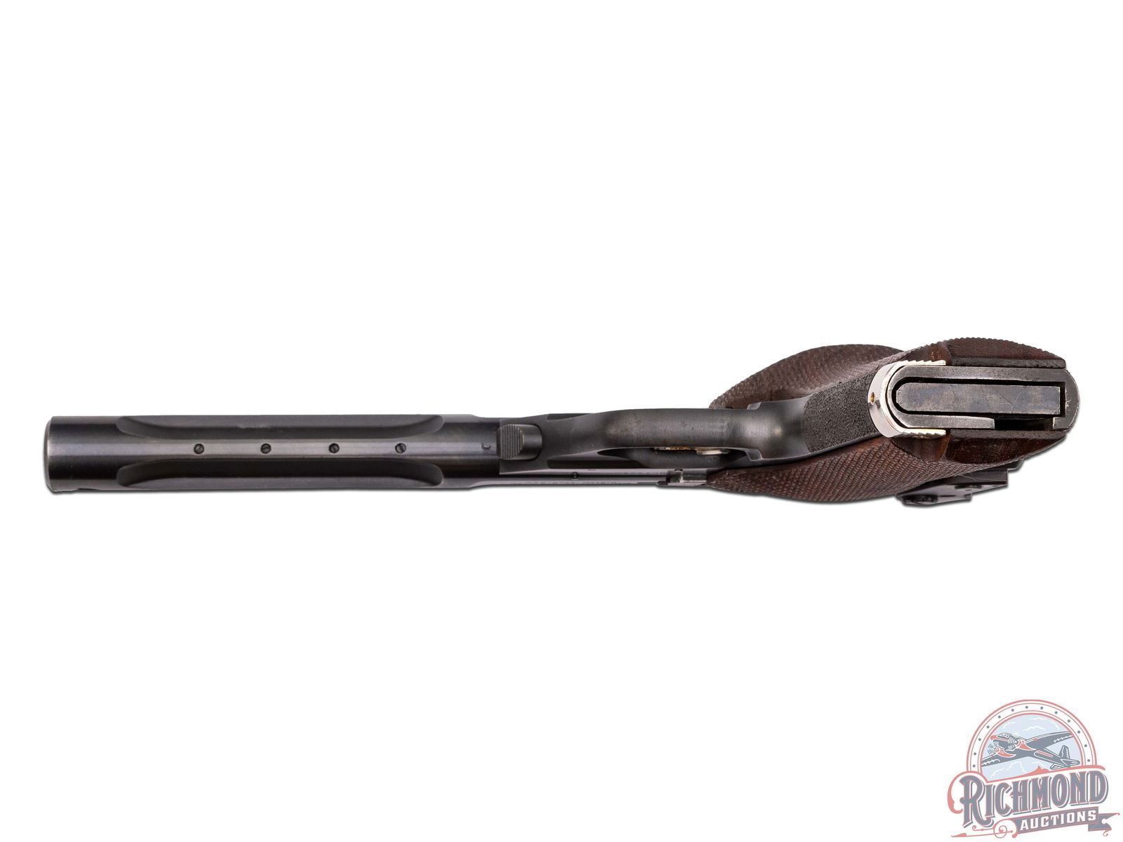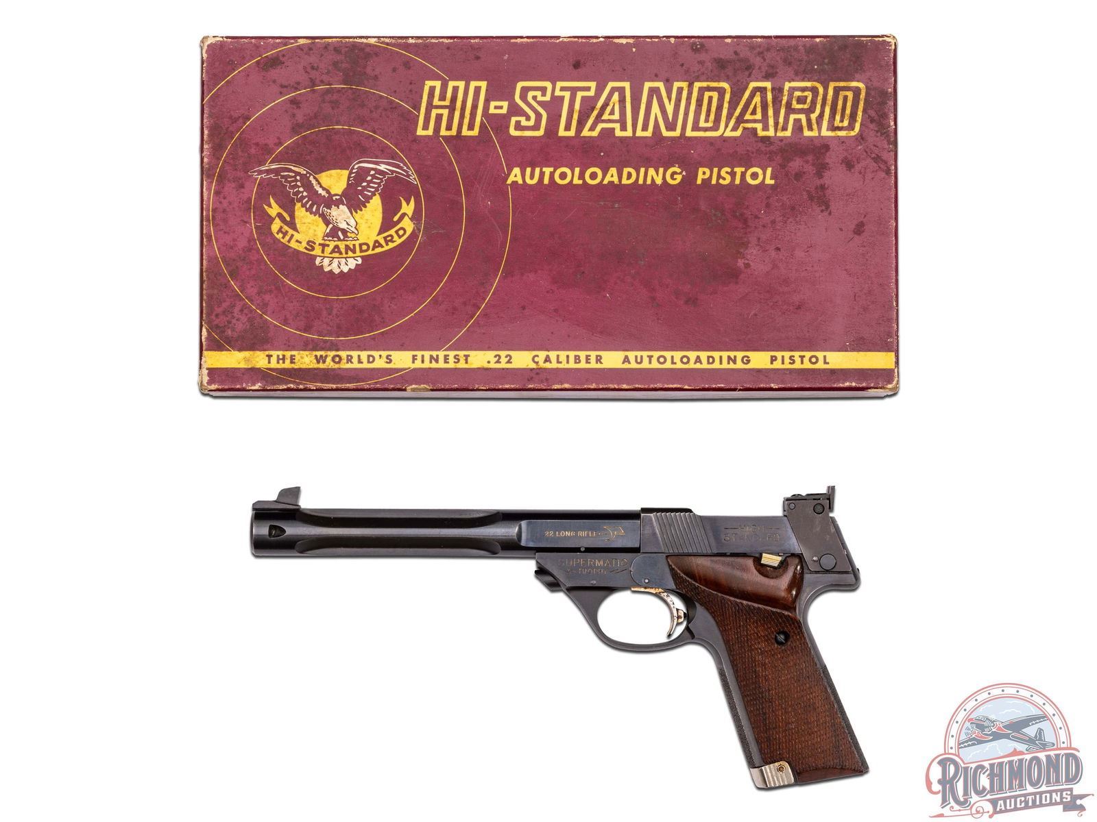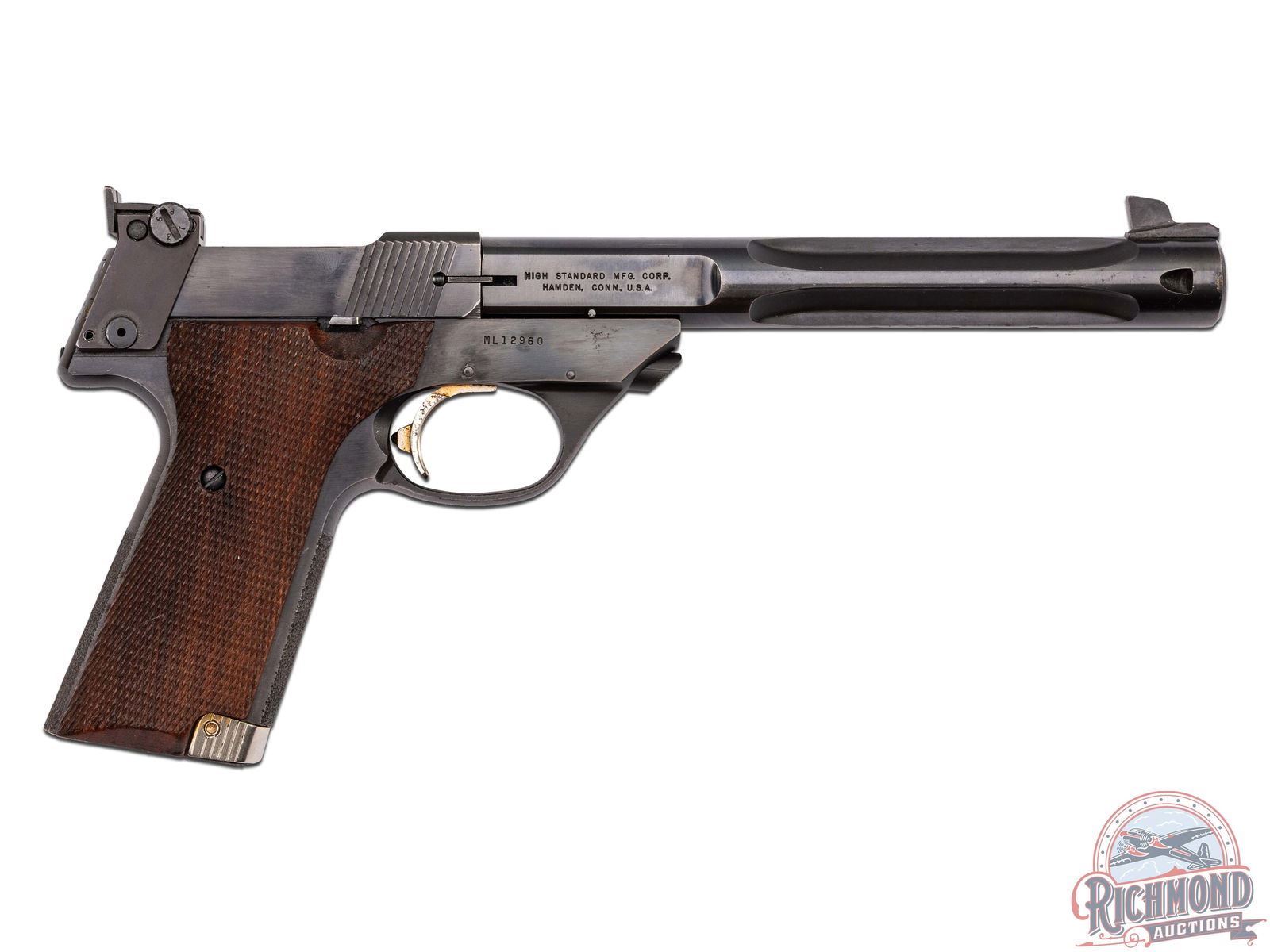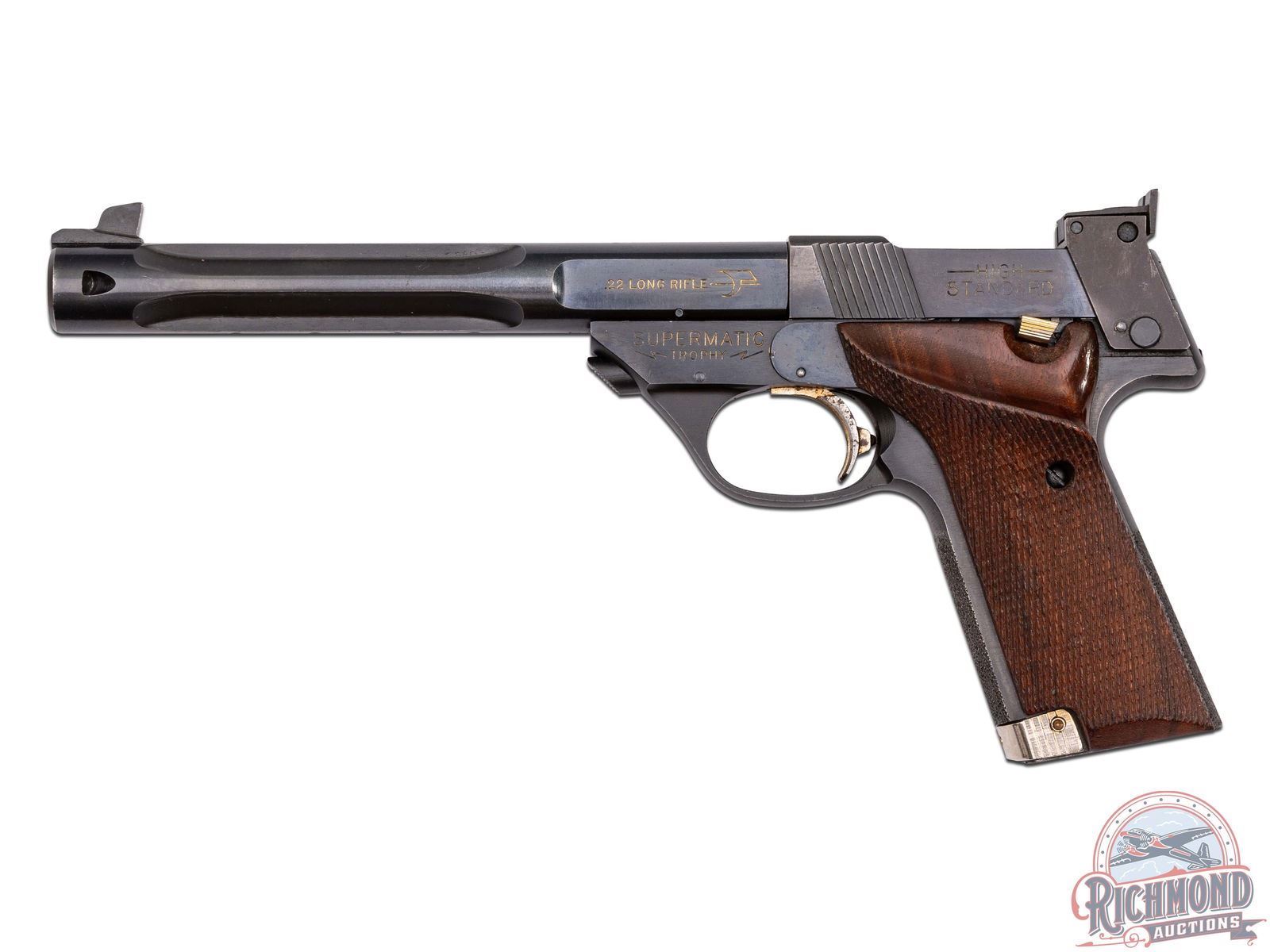 Manufactured in 1976. This great target pistol features a 7-1/4" fluted blued barrel with tapped and drilled bottom for weights and recessed muzzle. Frame mounted rear adjustable notch sight and ramped blade front sight. Left side of the slide is stamped in gold wash lettering ".22 LONG RIFLE" with the Eagle logo and "- HIGH - / STANDARD". Left side of the frame is stamped "SUPERMATIC / TROPHY". Right side of the slide is stamped with the two-line High Standard address and serial number stamped on the frame below. Gold wash trigger, safety and magazine release. Fitted with walnut checkered target style grips with right hand thumb rest. Stippled front and rear grip straps. Includes a 10 round magazine and factory box. CALIBER: 22 LR. S/N: ML12960. FFL STATUS: Modern.