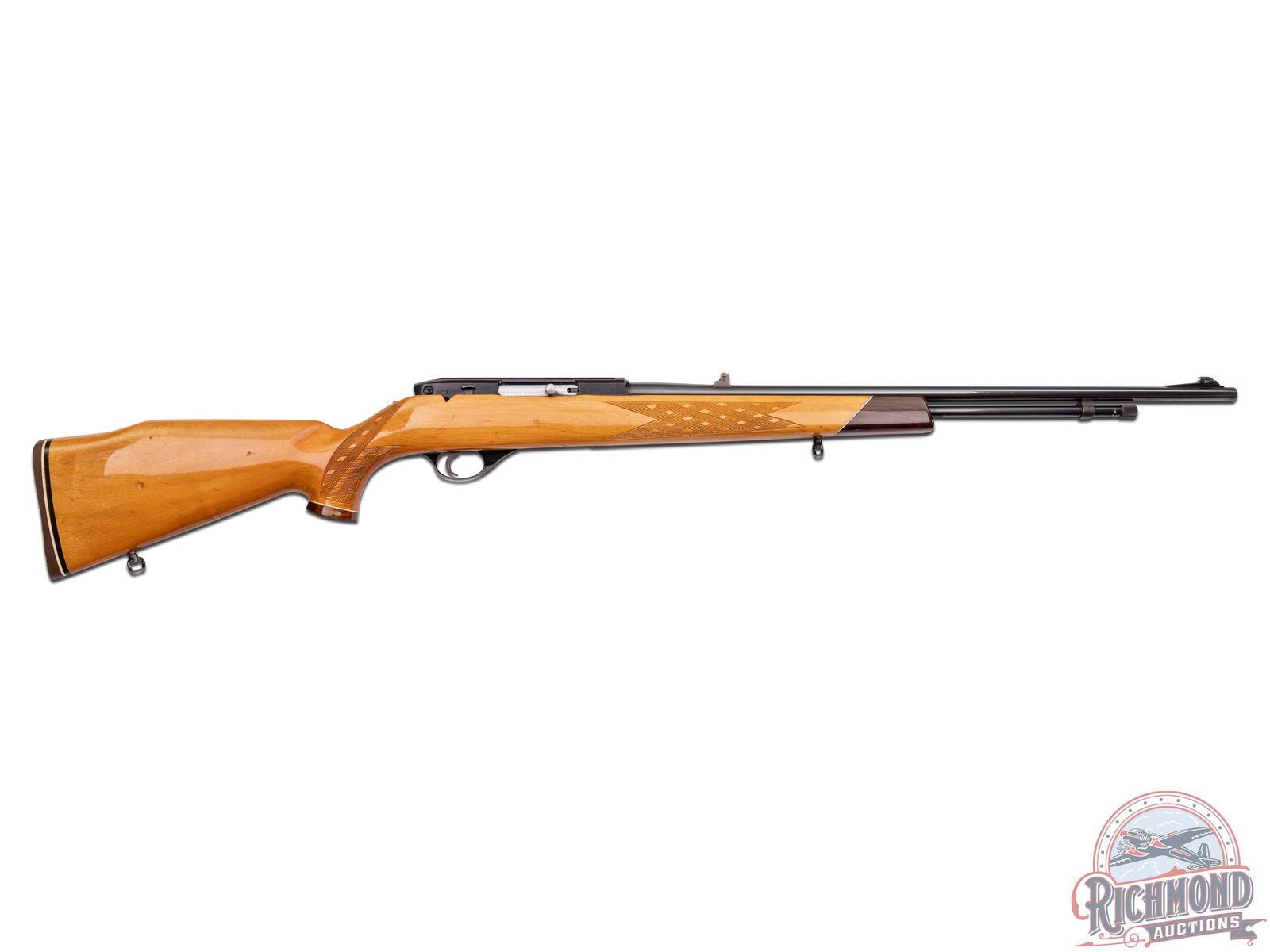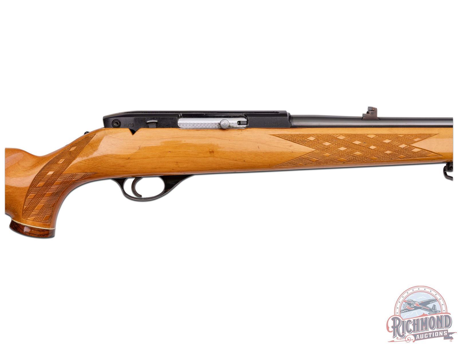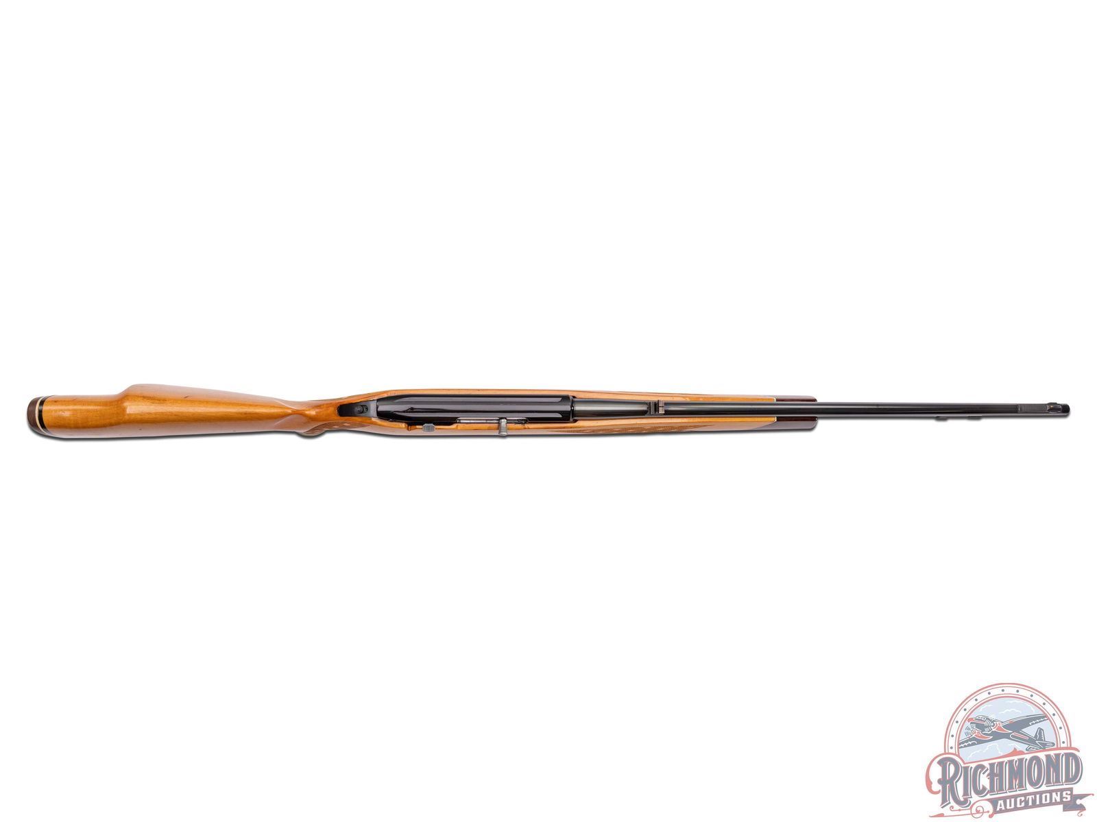 Manufactured circa 1978 by Weatherby in Japan. Features a 24" blued tapered barrel with 3-range leaf flip-up rear notch and front blade with brass bead sight. Tubular magazine feds a semi-automatic action with half jeweled bolt. Blued receiver with dovetail groove. Tang mounted manual thumb safety and blued steel trigger guard. High gloss wood stock with skip-line checkering on pistol grip and forearm. Right side cheekpiece. White lined Rosewood tip and pistol grip cap with white diamond inlay. Fitted with a black and white lined factory brown recoil pad. Equipped with sling swivels. LOP: 13-1/2". CALIBER: 22 LR. S/N: T11503. FFL STATUS: Modern.