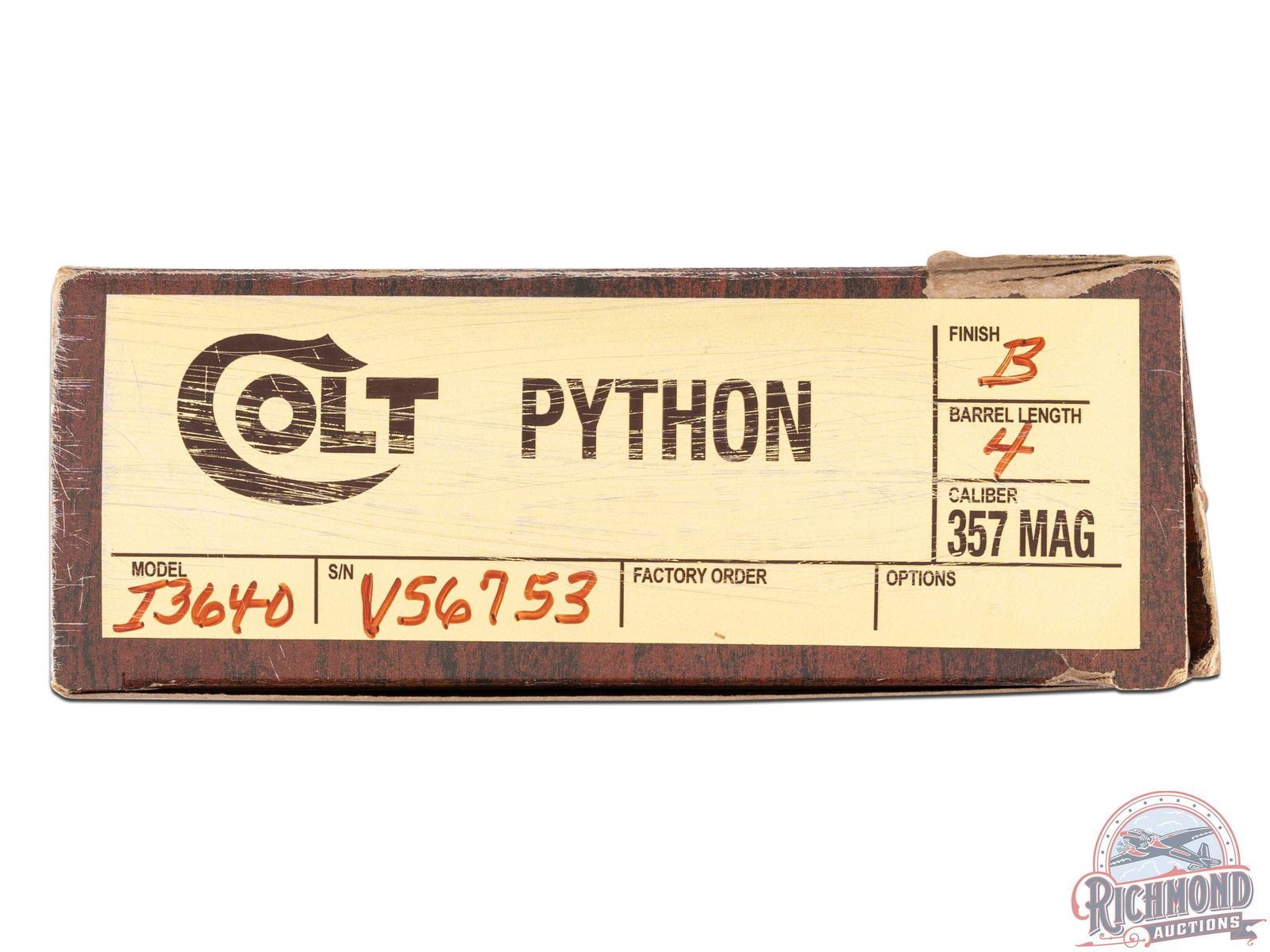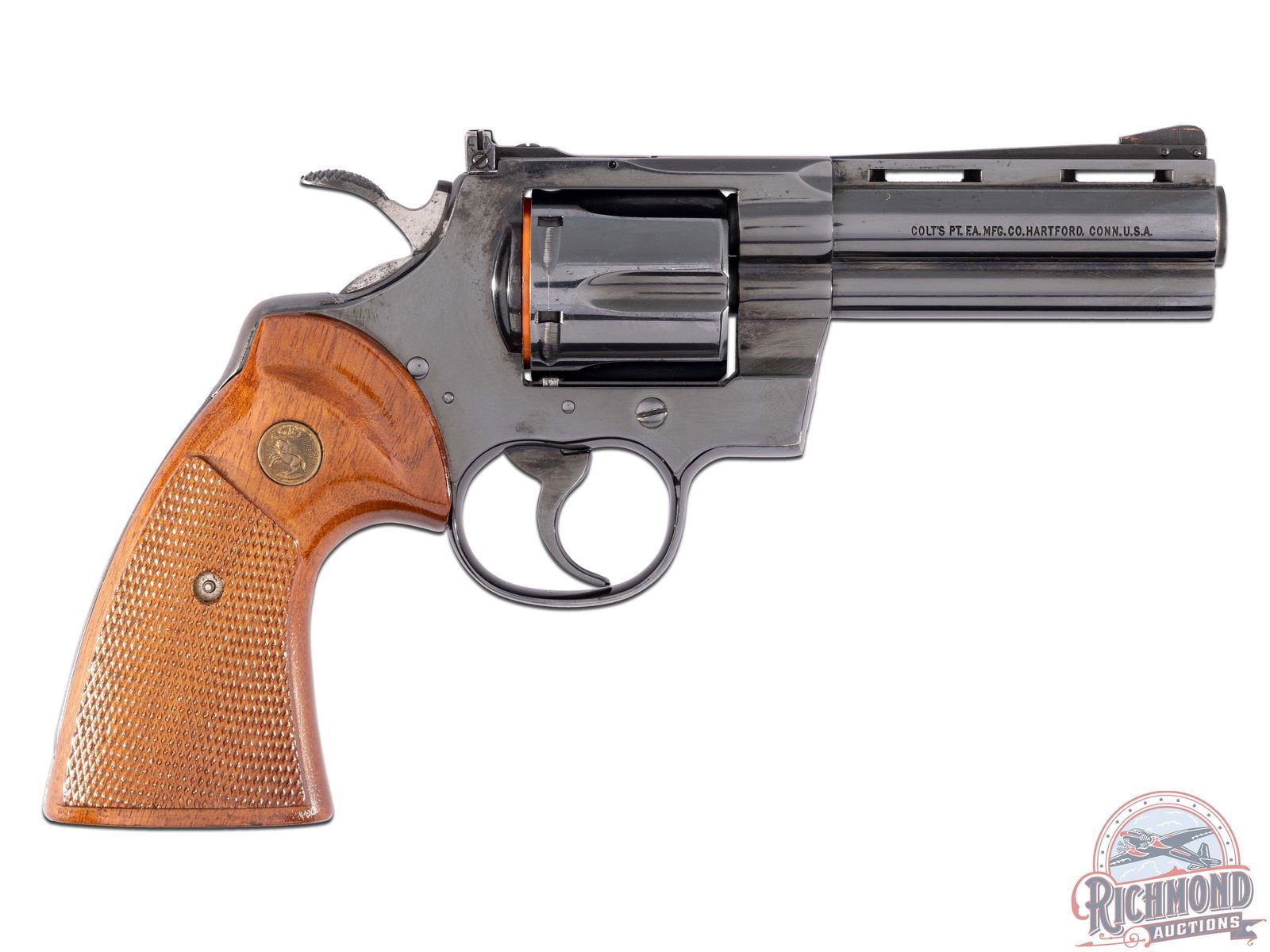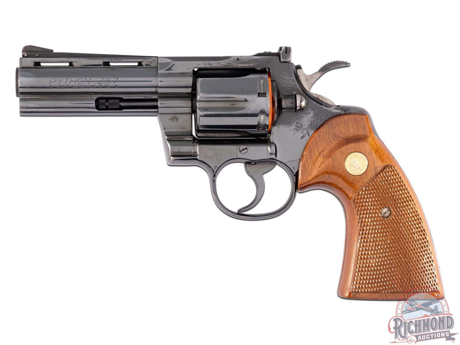 Manufactured in 1979. This early snake gun features a 4" ventilated rib barrel with full length ejector shroud. Rear adjustable notch with front ramp sights. Left side of the barrel is stamped "PYTHON .357 /* 357 MAGNUM CTG*". Right side of barrel is stamped with a single line Colt address. Left side of the frame is stamped with the Rampant Colt logo. Blued finish with a six round fluted, swing-out cylinder chambered for 357 Magnum or 38 Special cartridges. Fitted with factory Colt checkered walnut wood grips with gold tone Colt medallions. Includes original Colt box with hang tag and factory paperwork. CALIBER: 357 MAG. S/N: V56753. FFL STATUS: Modern.