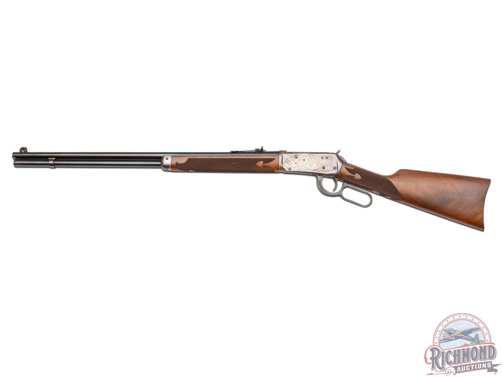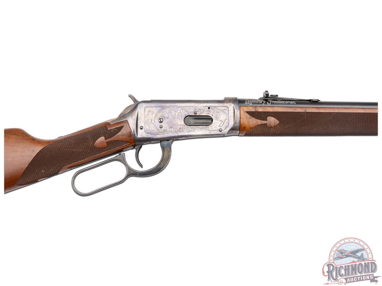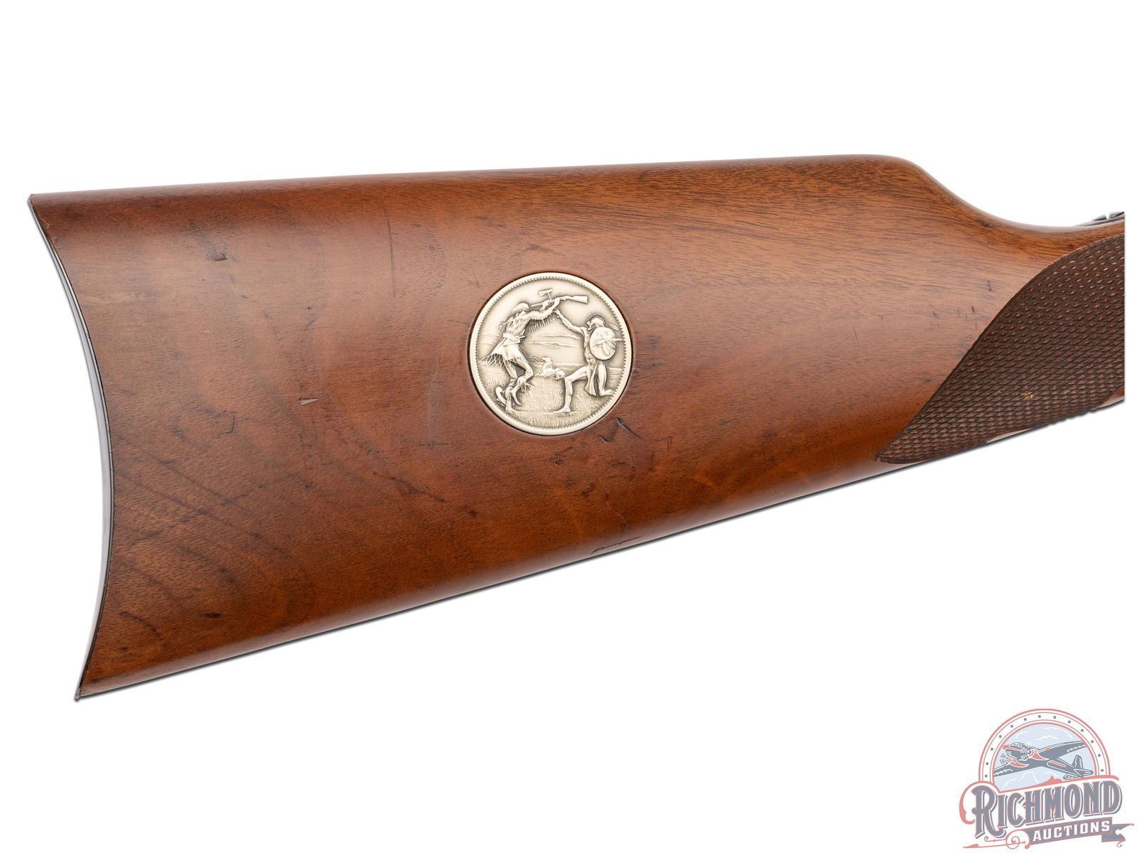 Manufactured in 1979. This commemorative features a 24" blued round barrel with full length 7-round magazine tube. Rear flat top semi-buckhorn adjustable notch sight and brass bead front blade. Antique silver plated receiver features frontiersman engraving on both sides. The right side features a standing grizzly bear, a frontiersman in buckskin greeting two Native Americans on horseback, a rattlesnake and a beaver. The left side of the receiver features a fierce bald eagle about to grab a groundhog with its extended talons and a mounted frontiersman leading his mule pack through high country with a second mounted frontiersman following. Blued loading gate, lever and hammer. Walnut straight grip stock with grip checkering and spade design. Fitted with a blued steel butt plate. An antique silver tone medallion is inlaid on the right side of the butt stock, depicting a fight between a buckskin clad frontiersman and a Native American with a tomahawk. Matching forearm walnut stock fitted with an antique silver forearm cap. LOP: 13-1/2". CALIBER: 38-55 WIN. S/N: LF05230. FFL STATUS: Modern.