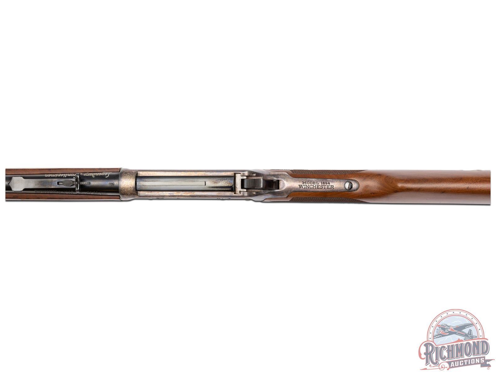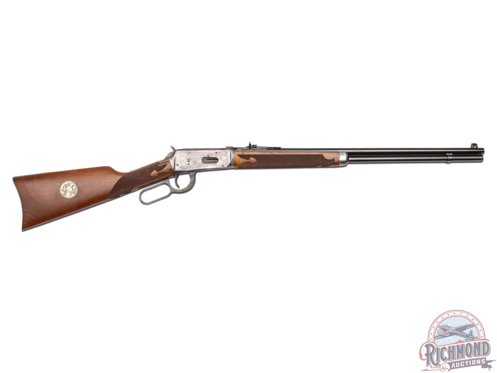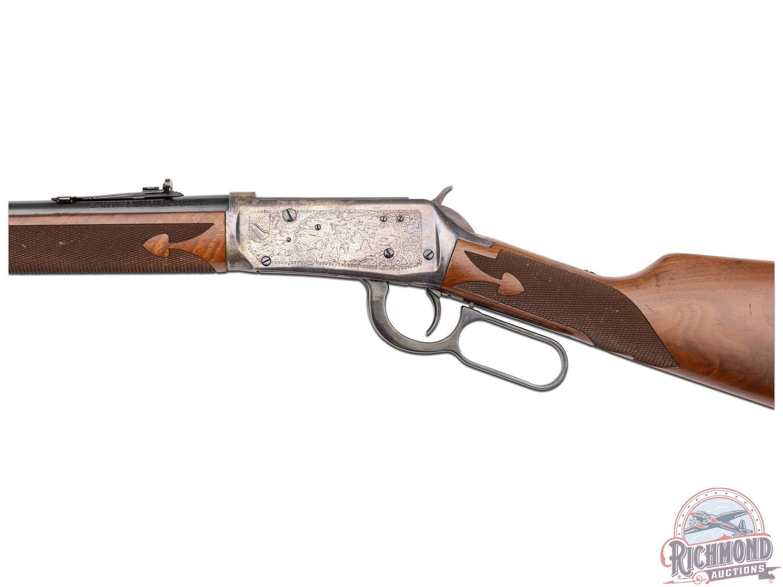 Manufactured in 1979. This commemorative features a 24" blued round barrel with full length 7-round magazine tube. Rear flat top semi-buckhorn adjustable notch sight and brass bead front blade. Antique silver plated receiver features frontiersman engraving on both sides. The right side features a standing grizzly bear, a frontiersman in buckskin greeting two Native Americans on horseback, a rattlesnake and a beaver. The left side of the receiver features a fierce bald eagle about to grab a groundhog with its extended talons and a mounted frontiersman leading his mule pack through high country with a second mounted frontiersman following. Blued loading gate, lever and hammer. Walnut straight grip stock with grip checkering and spade design. Fitted with a blued steel butt plate. An antique silver tone medallion is inlaid on the right side of the butt stock, depicting a fight between a buckskin clad frontiersman and a Native American with a tomahawk. Matching forearm walnut stock fitted with an antique silver forearm cap. LOP: 13-1/2". CALIBER: 38-55 WIN. S/N: LF05230. FFL STATUS: Modern.