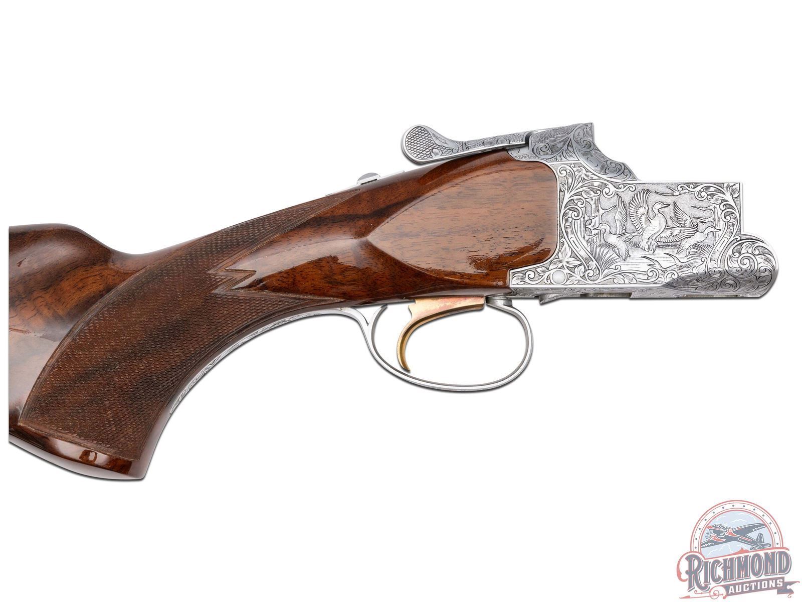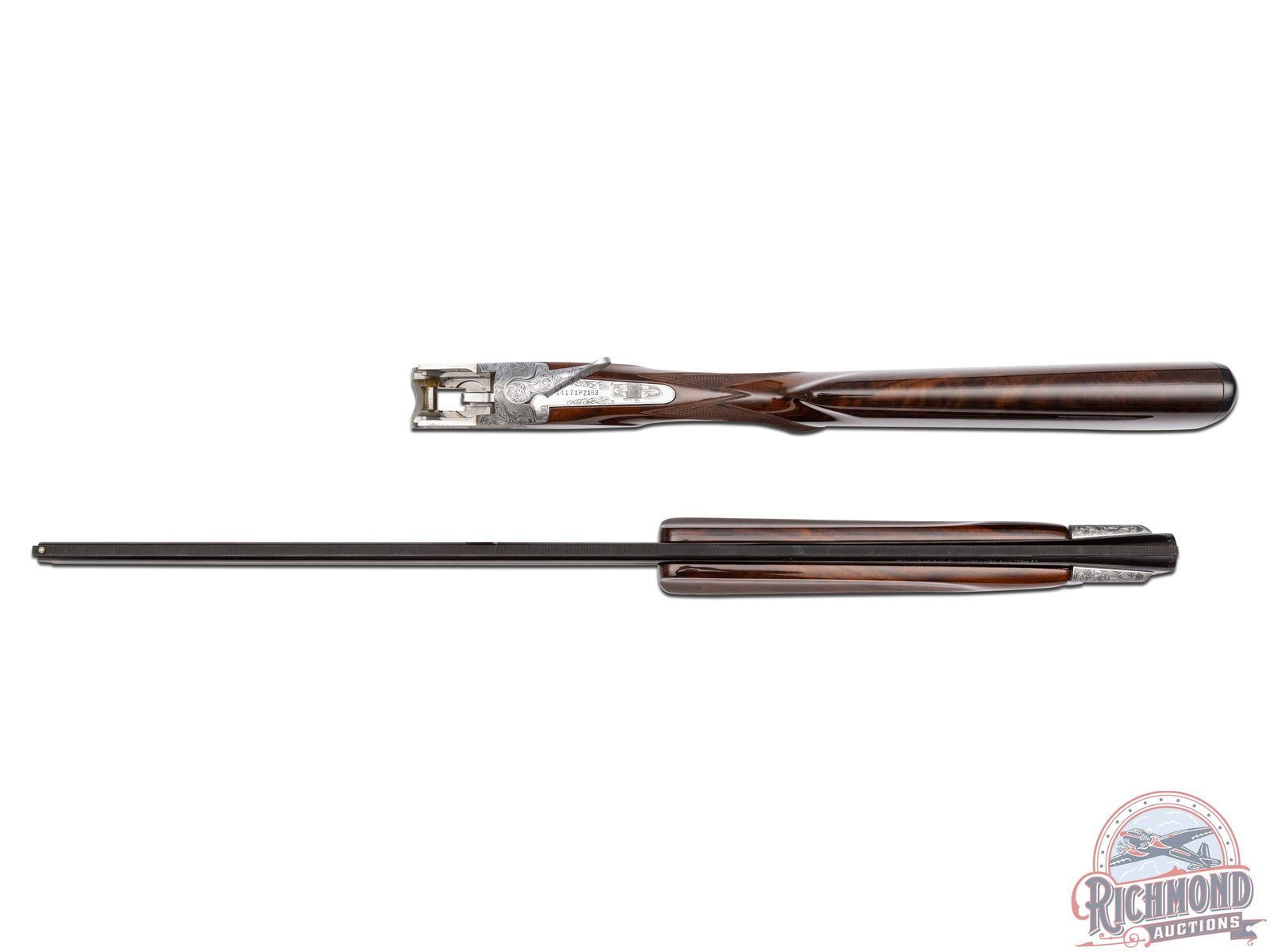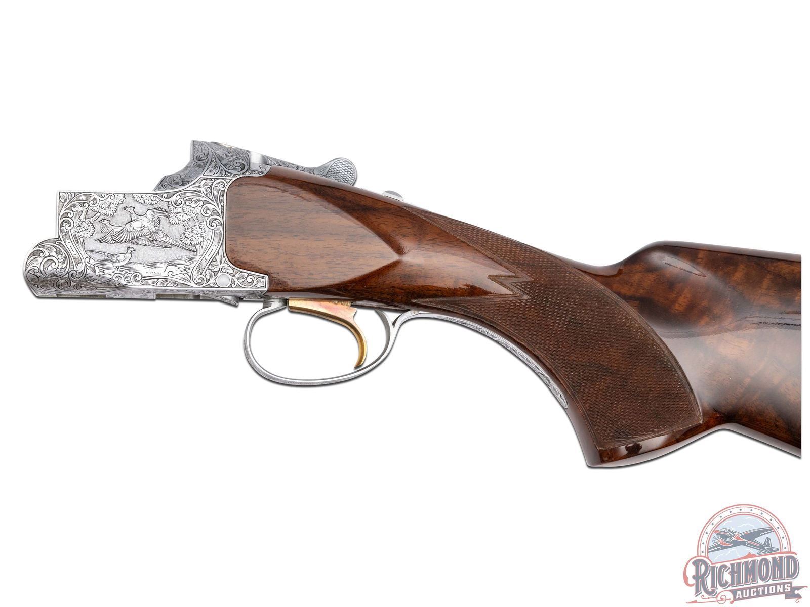 Manufactured in 1981. Features 28" blued barrels with single nickel bead front sight on a ventilated rib. Chambered for 2-1/2" and 3" shells choked Full and Modified and equipped with automatic ejectors. The coin finished action has deep floral scroll engraving which extends to the break lever, trigger guard, tang, barrel breeches and forearm hardware. The right side of the action is engraved with a game scene of three ducks taking to flight from a wooded marsh, with the left side similarly engraved with three pheasants in a wooded field scene. Signed by engraver "M.IKEZAWA" near the bottom. The underside of the action is also engraved with a setter and a flushed pheasant, along with a quail in flight on the trigger guard. Select grade V checkered walnut pistol grip stock, trap style forearm with a gloss finish. Gold washed single selective trigger / tang safety. Fitted with a factory Browning textured black plastic butt plate. Comes in a non-matching factory box with manual. LOP: 14". DAC: 1-1/4". DAH: 2". CALIBER: 410. S/N: 14171PZ183. FFL STATUS: Modern.