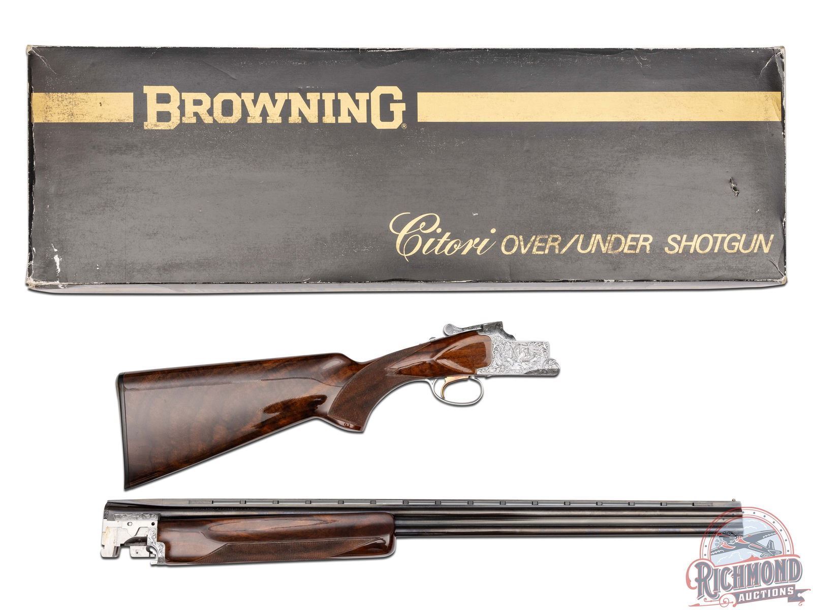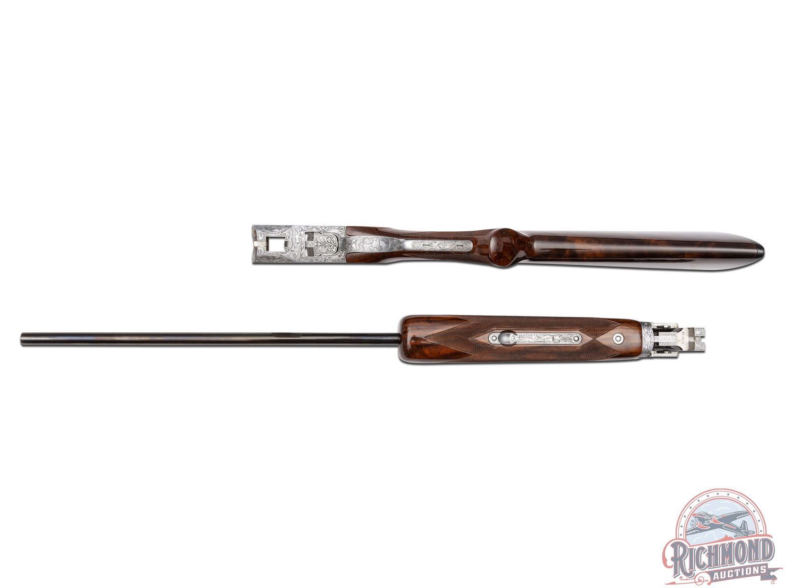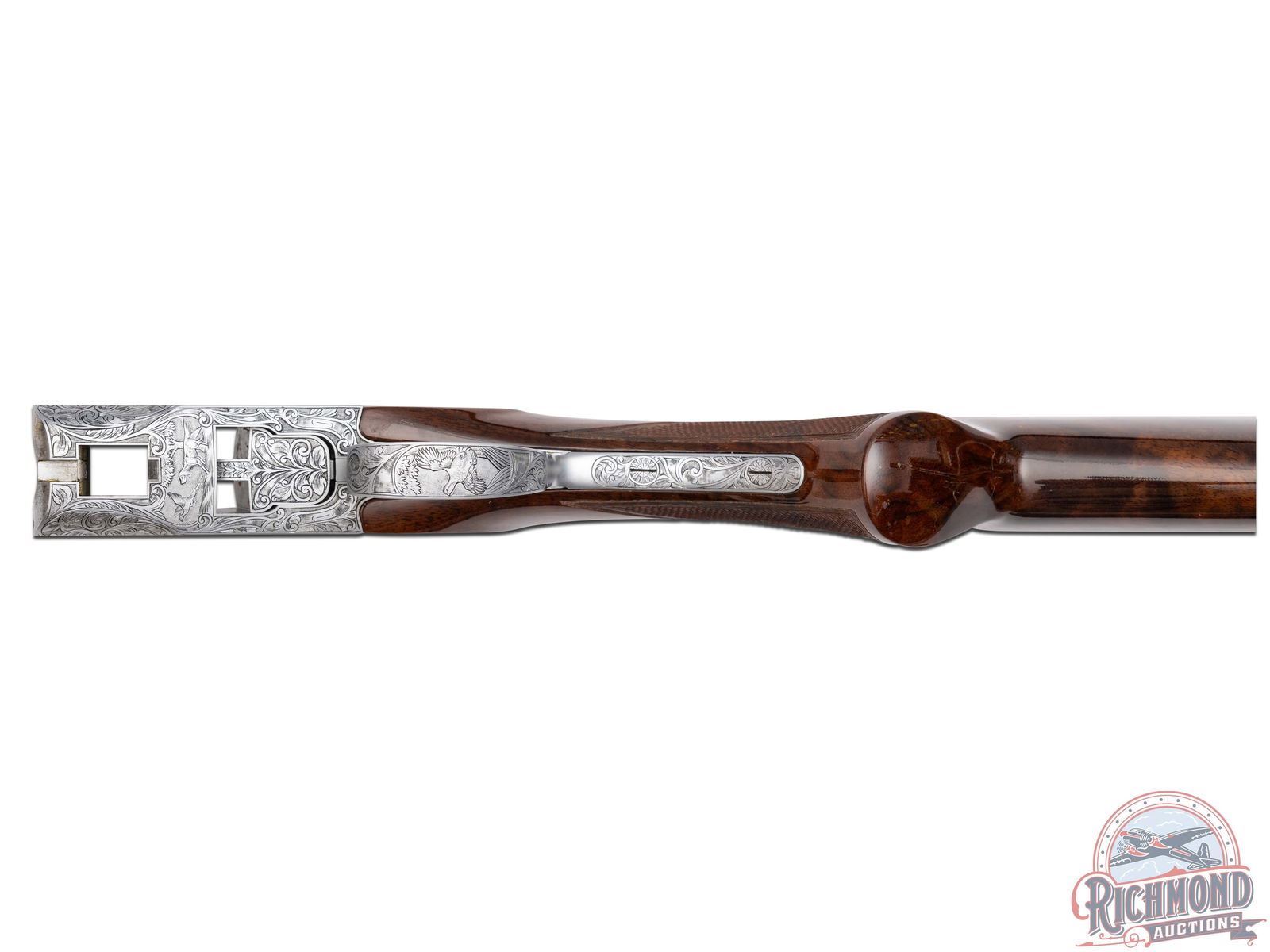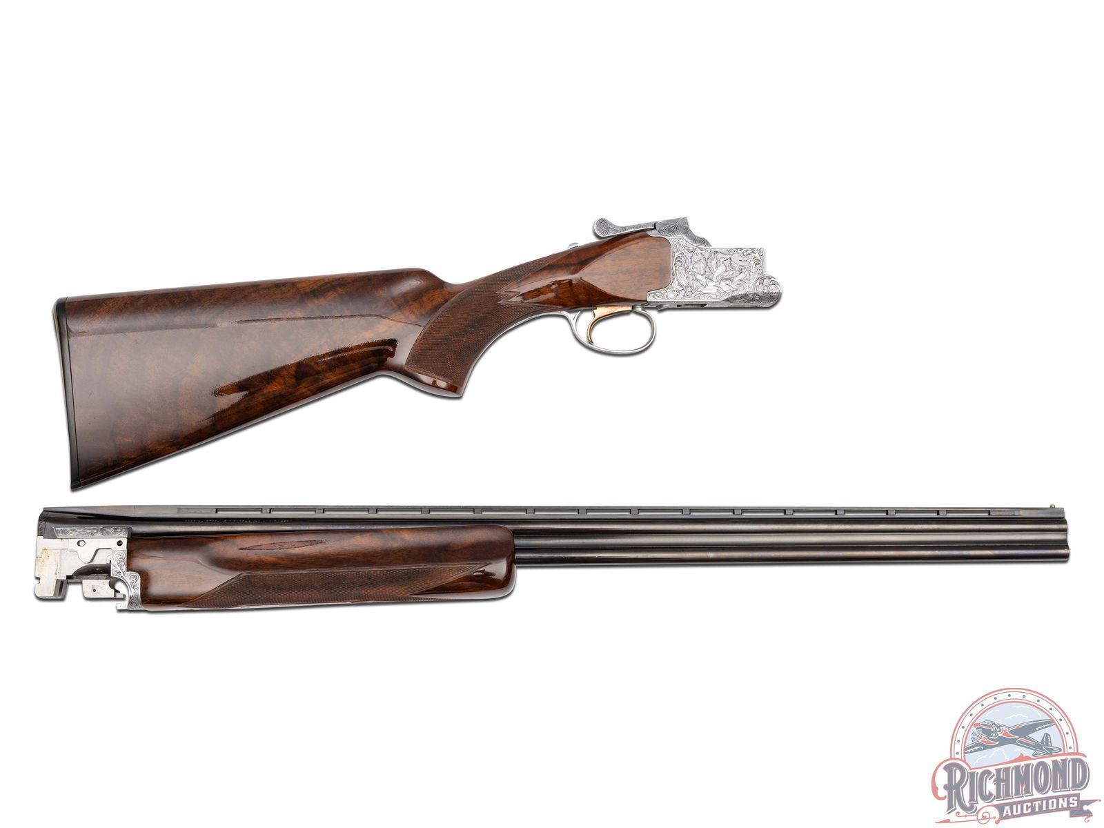 Manufactured in 1981. Features 28" blued barrels with single nickel bead front sight on a ventilated rib. Chambered for 2-1/2" and 3" shells choked Full and Modified and equipped with automatic ejectors. The coin finished action has deep floral scroll engraving which extends to the break lever, trigger guard, tang, barrel breeches and forearm hardware. The right side of the action is engraved with a game scene of three ducks taking to flight from a wooded marsh, with the left side similarly engraved with three pheasants in a wooded field scene. Signed by engraver "M.IKEZAWA" near the bottom. The underside of the action is also engraved with a setter and a flushed pheasant, along with a quail in flight on the trigger guard. Select grade V checkered walnut pistol grip stock, trap style forearm with a gloss finish. Gold washed single selective trigger / tang safety. Fitted with a factory Browning textured black plastic butt plate. Comes in a non-matching factory box with manual. LOP: 14". DAC: 1-1/4". DAH: 2". CALIBER: 410. S/N: 14171PZ183. FFL STATUS: Modern.