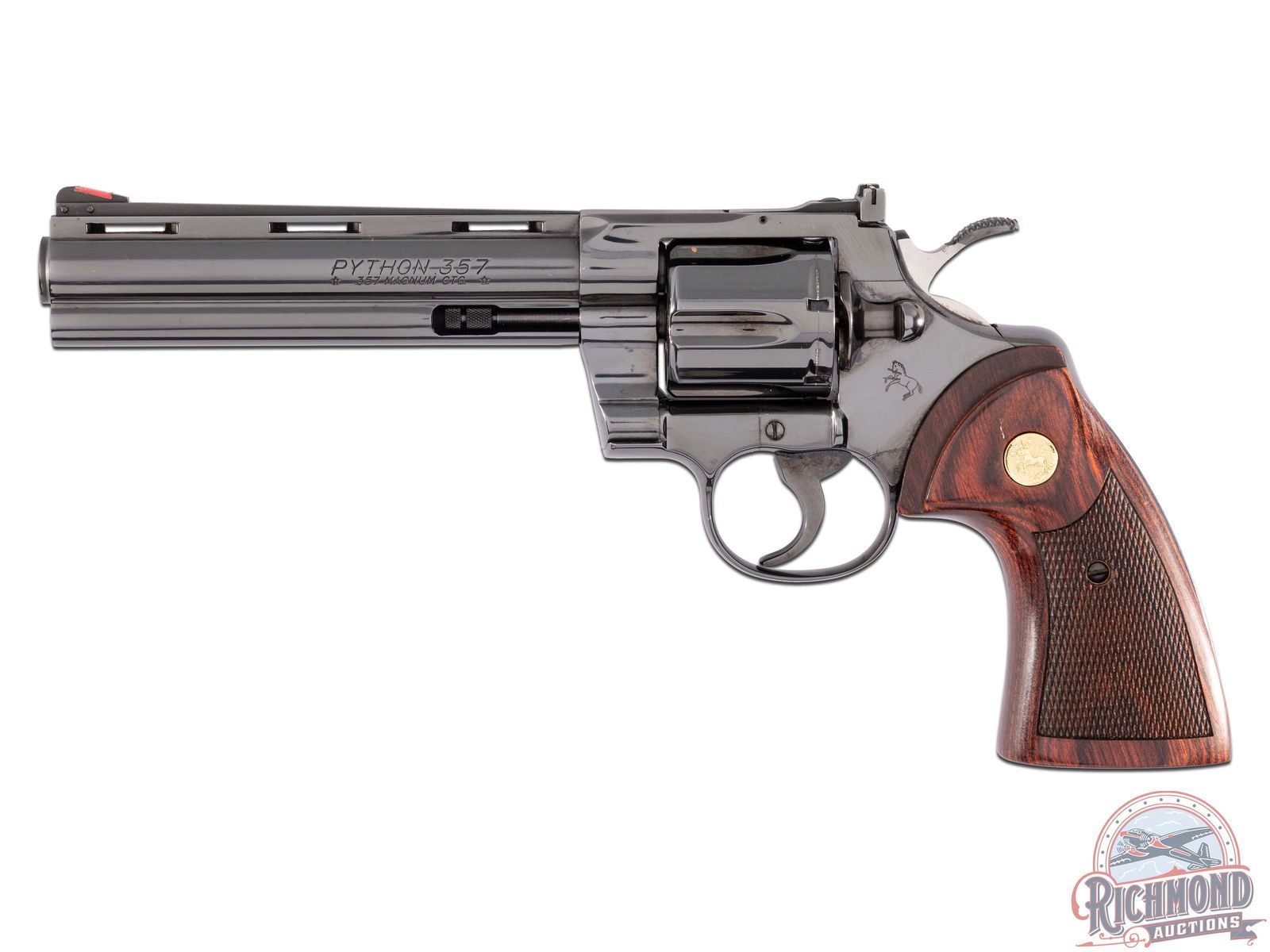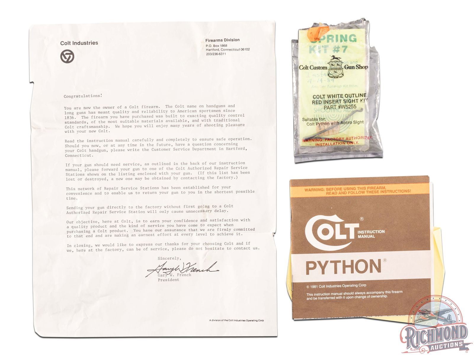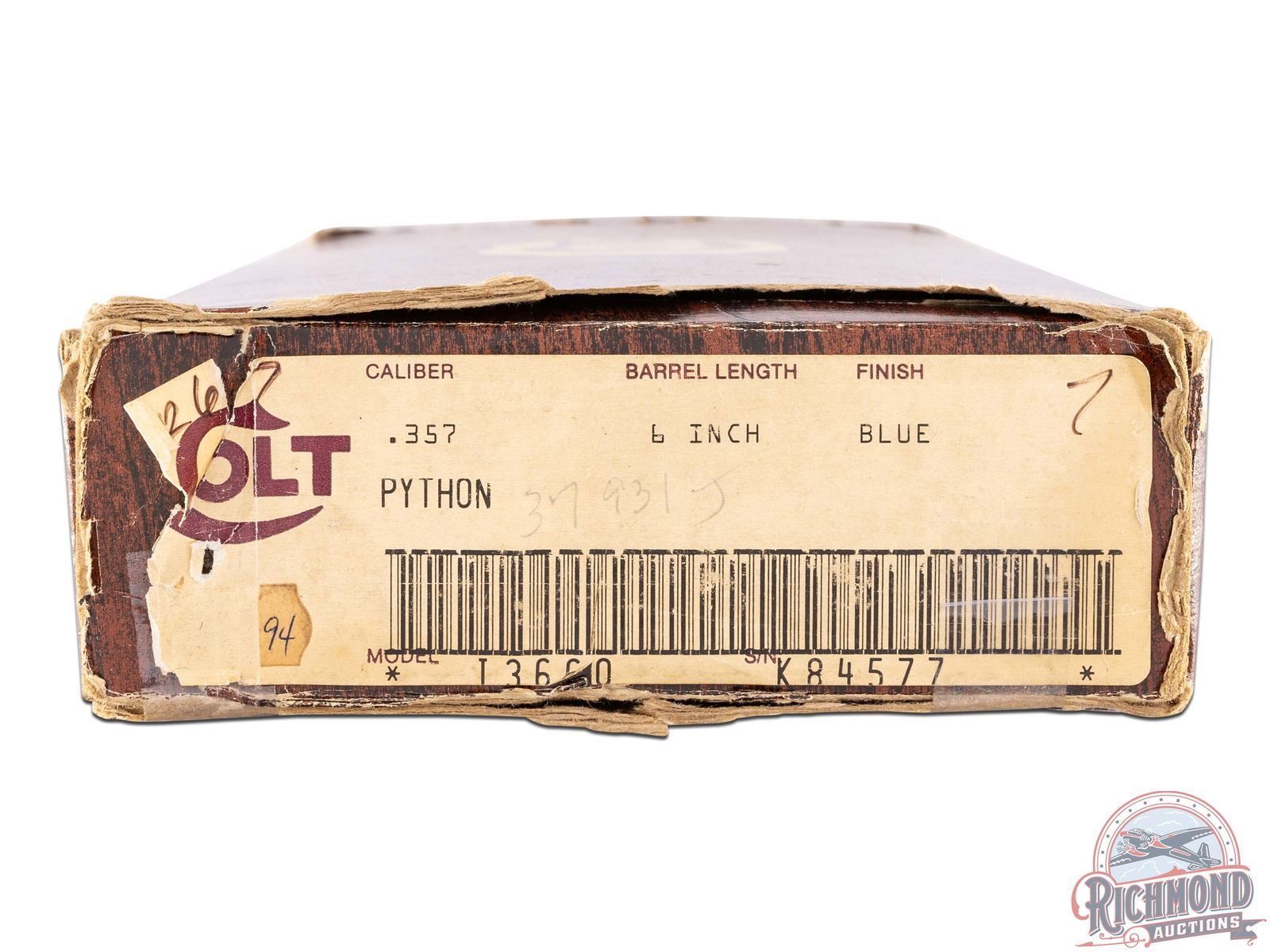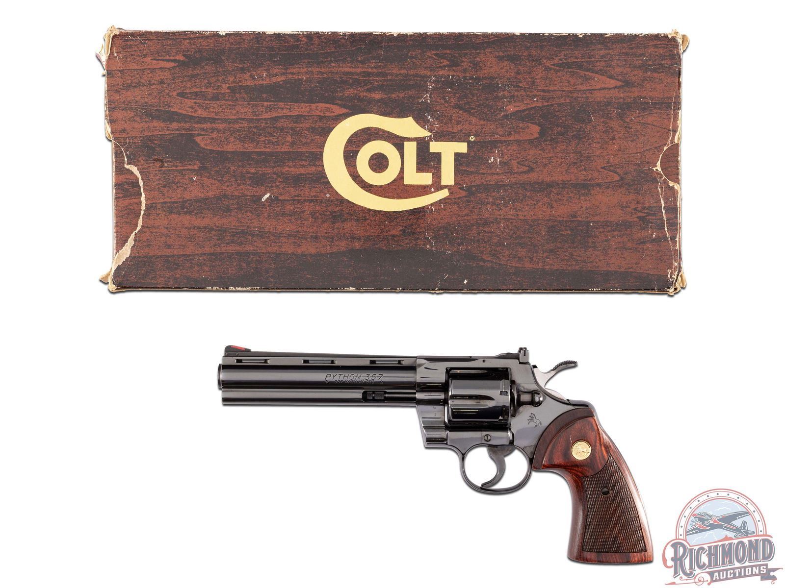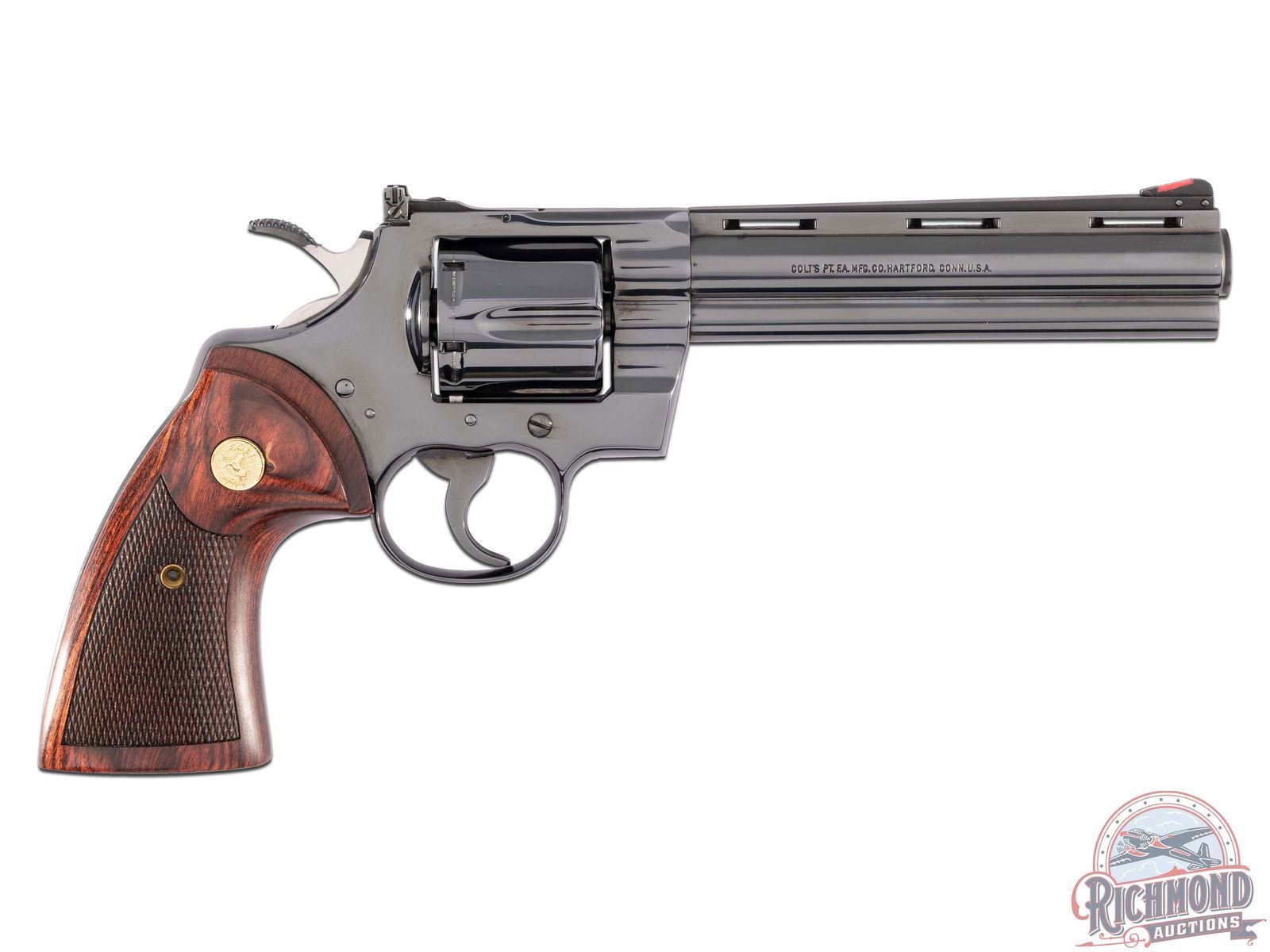 Manufactured in 1982. This early snake gun features a 6" ventilated rib barrel with full length ejector shroud. Rear adjustable notch with front ramp sights. Left side of the barrel is stamped "PYTHON .357 /* 357 MAGNUM CTG*". Right side of barrel is stamped with a single line Colt address. Left side of the frame is stamped with the Rampant Colt logo. Blued finish with a six round fluted, swing-out cylinder chambered for 357 Magnum or 38 Special cartridges. Tune-up spring kit, installed by consignor dated 4/14/84. Fitted with factory Colt checkered cherry wood grips with gold tone Colt medallions. Includes original Colt box with original spring and factory paperwork. CALIBER: 357 MAG. S/N: K84577. FFL STATUS: Modern.