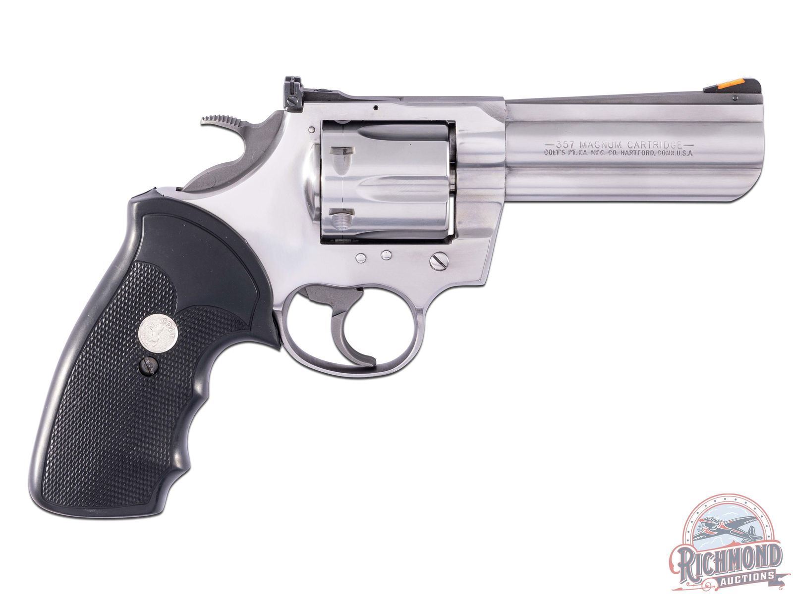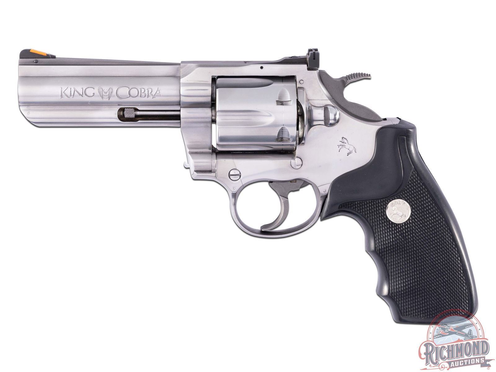 Manufactured in 1993. This beautiful snake gun features a 4" barrel with the enhanced recessed muzzle and full length shroud. Rear white outlined adjustable notch sight and orange highlighted front ramp. Left side of the barrel is stamped "KING COBRA" with cobra image. Left side of the frame is stamped with the Rampant Colt logo closer to the grip. Polished stainless steel finish. Six round fluted, swing-out cylinder chambered for 357 Magnum cartridges. Fitted with factory Colt checkered, finger grooved rubber grips with silver tone Colt medallions. CALIBER: 357 MAG. S/N: EK3680. FFL STATUS: Modern.