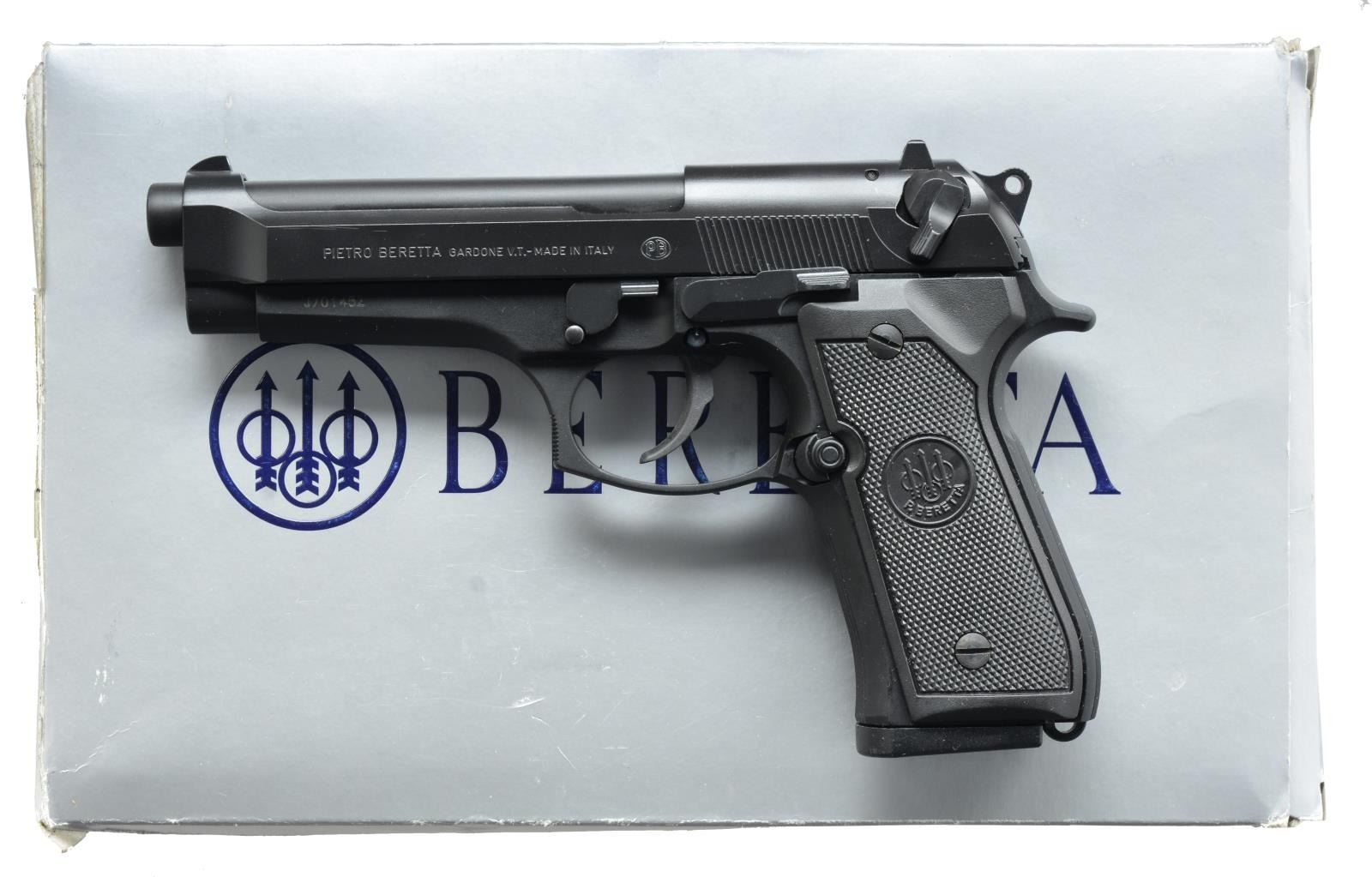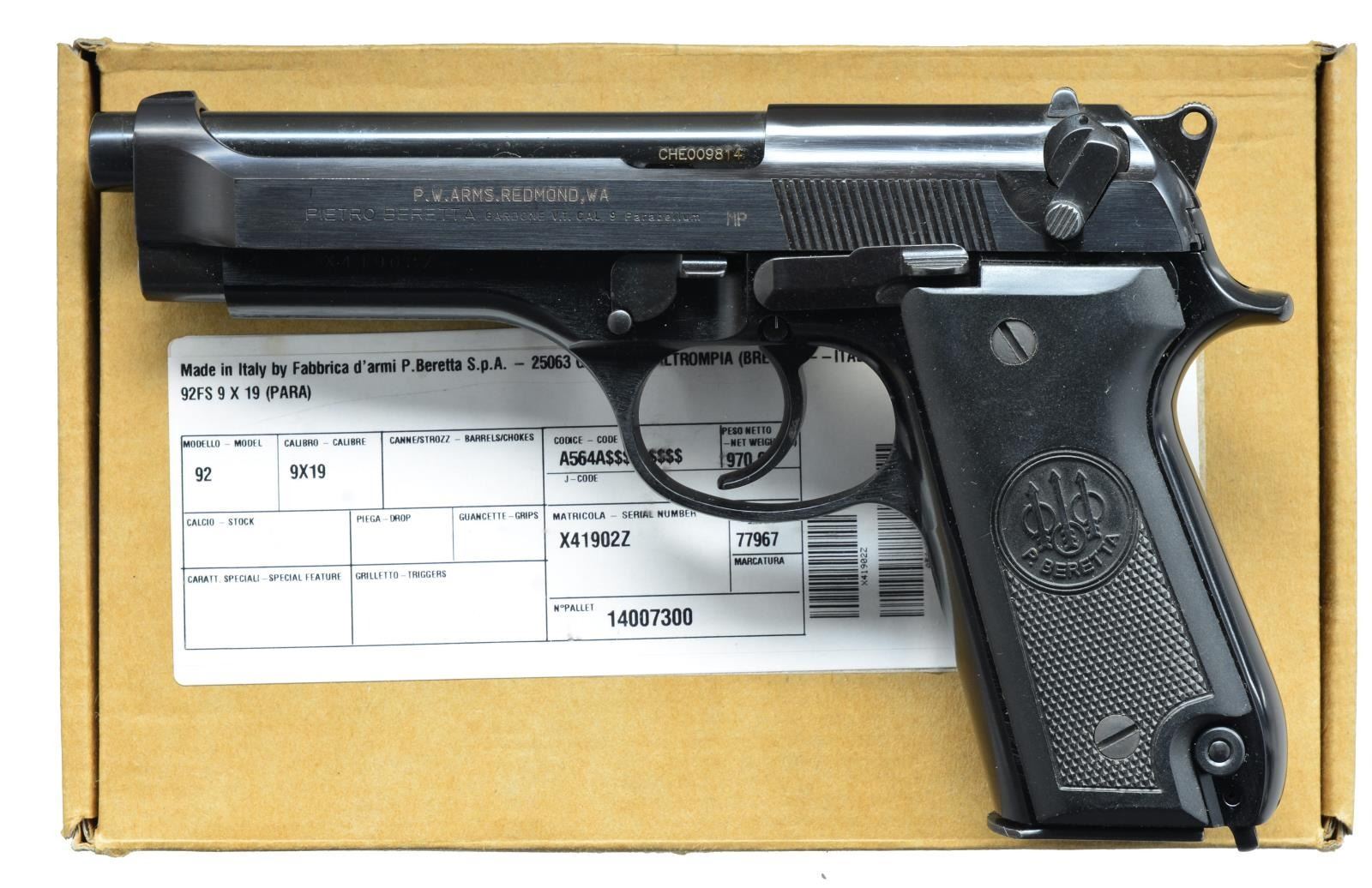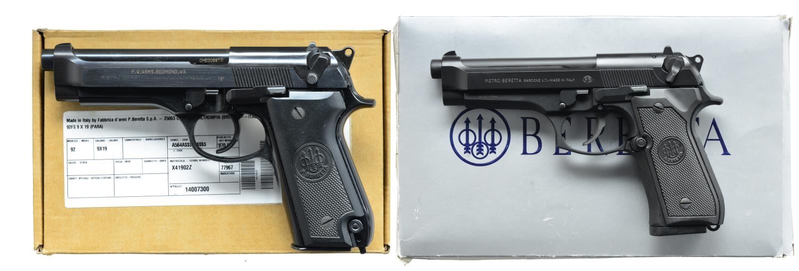 BOTH: cal. 9mm Para. Bbls. 5". 1) MODEL 92S. S# X41902Z. Imported Police Model. Black front sight w/ fixed square notch rear sight. Slide mounted safety. Alloy frame. Black finish. 2 Piece checkered polymer grips. Left side of slide has P.W. Arms import mark w/ importer S# "CHE009814" on bbl. MAGS: 1 detachable 15 rd. UNATTACHED ACCESSORIES: cardboard box w/ matching numbered label on lid. CONDITION: near excellent retaining over 99% finish. Bright near excellent bore. (21-848/DS). 2) MODEL 92FS. S# J70145Z. 3 Dot sights. Slide mounted ambidextrous safety. Alloy frame. Matte black finish. 2 Piece checkered polymer grips. MAGS: 2 detachable 15 rd. UNATTACHED ACCESSORIES: molded blue box w/ 100th Anniversary silver sleeve. Box contains instruction manual & warranty packet. CONDITION: near excellent retaining 99% finish. Bright near excellent bore. (21-876/DS). BOTH MODERN. $800-1,100.