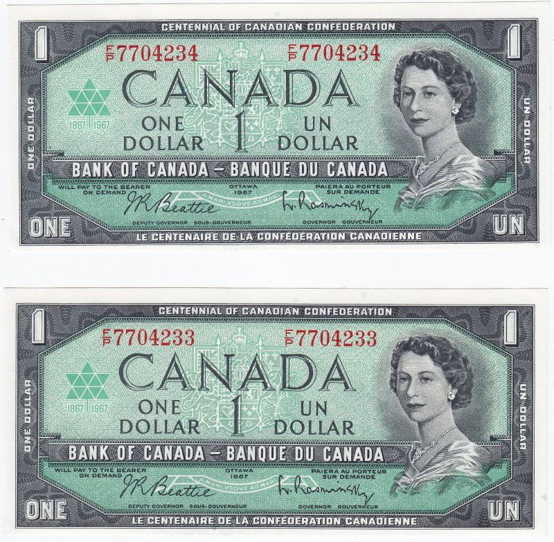 1967 Bank Of Canada $1 One Dollar Bank Notes - 2 Consecutive Serial Numbers - Beattie Rasminsky - Book Value $24