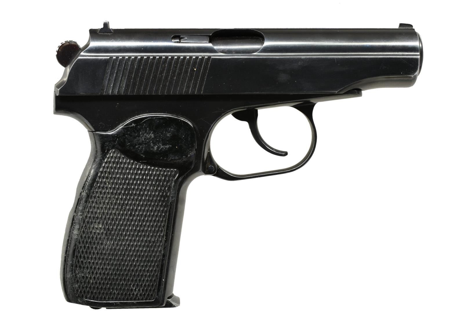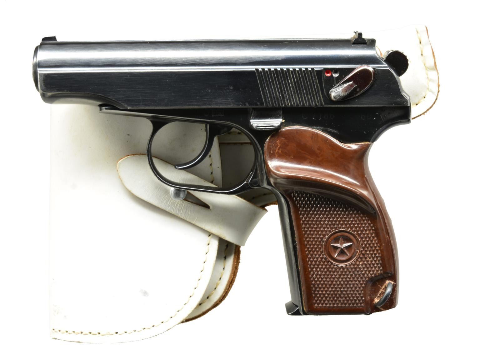 1) Cal. 9x18 MAK. S# C7186. Bbl. 3 3/4". S#'s match on frame & slide. Import marked on right side of frame. Fixed sights. SA/DA. Left side of frame marked w/ circle in diamond indicating East German mfg. Boxed "K100". "60" & letter "Y" w/ circle of dots. Brown composite grips w/ thumb rest, checkering & stars. MAGS: 2-8 rd. CONDITION: grips have very light wear & tiny handling marks. Metal has 75% thinning original blue w/ high point wear notable in muzzle area. Very good shiny bore. UNATTACHED ACCSESORIES: white leather holster marked inside in ink "MVA II/G." Holster has scuffing & light discoloration but in good serviceable condition. (21-794/RW). 2) Cal. 9x18 MAK. S# D4456. Bbl. 3 3/4". S# matches on frame & slide. No visible import markings. Frame is marked on left side w/ circle in diamond indicating East German mfg. Boxed "K100". "61" & letter "Y" w/ circle of dots. Slide is additionally marked w/ circle in diamond behind safety. Fixed sights. SA/DA. Checkered composite grips. Grips have additional sm. hole at rear between retaining screw & butt. MAGS: 2 non-matching 8 rd. UNATTACHED ACCESSORIES: black leather holster w/ mag. pouch. Holster marked "MADE IN GERMANY". Includes cardboard shipping box. CONDITION: grips have light wear, worn diamonds & notable wear in backstrap area. Added hole has sm. chipping around edge. Metal has 75% thinning blue w/ high point wear & tiny scratches. Shiny bore but w/ light wear to lands. Holster has light wear, scuffing & scratches, but appears in good serviceable condition. (21-795/RW). BOTH CURIO. $600-800.