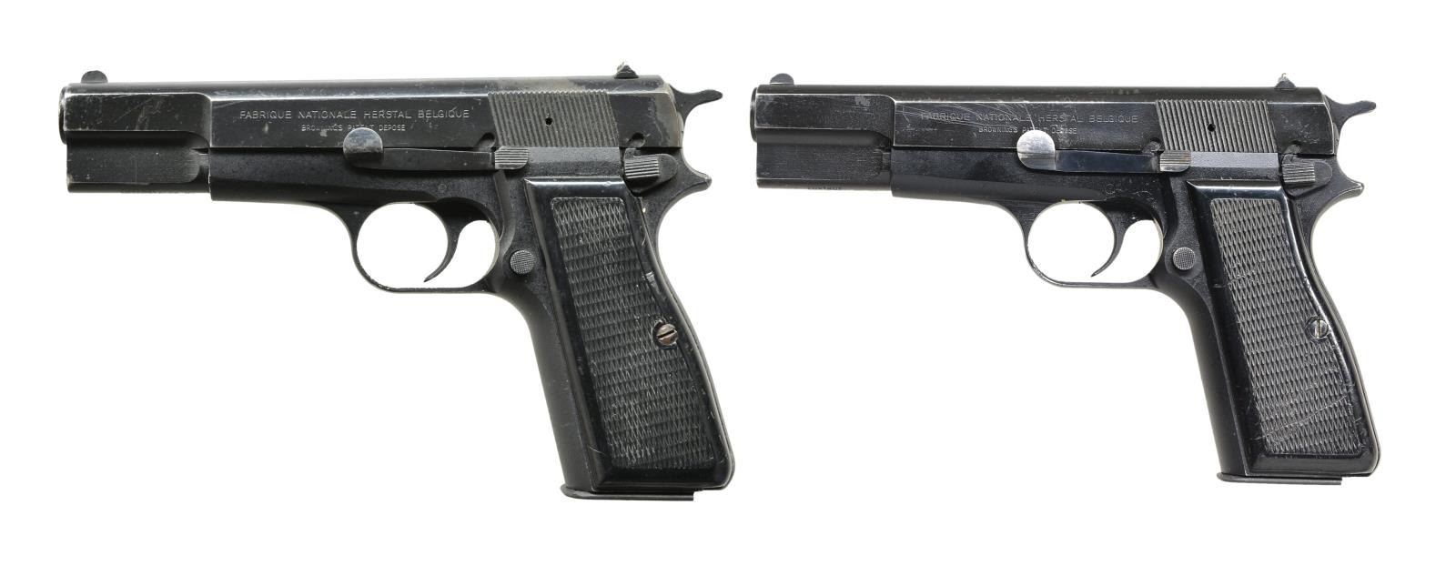 BOTH: cal. 9mm P. Bbls. 4 5/8". Apparent Law Enforcement trade ins w/ black painted finish. Semi circular front sight & fixed square notch rear sights. Checkered plastic grips. Bottom of slides have Foxtrot import mark. Mfg. 1979, "215" S# prefix designates military/police production. MAGS: 2 detachable 15 rd. for each pistol. 1) S# 215RN31414. CONDITION: 80% painted finish showing edge & carry wear w/ spots of finish loss & corrosion in breech end of bbl. Grips show scratches, dents & marks most prevalent on right panel. Bright bore retains sharp rifling. (21-796/DS). 2) S# 215RN30061. UNATTACHED ACCESSORIES: Flambeau plastic case. CONDITION: metal retains 80% added painted finish showing edge & carry wear w/ sm. chips & handling marks. Grips have lightly worn checkering showing scratches & handling marks. Bore retains strong rifling. (21-797/DS). BOTH MODERN. $700-1,000.