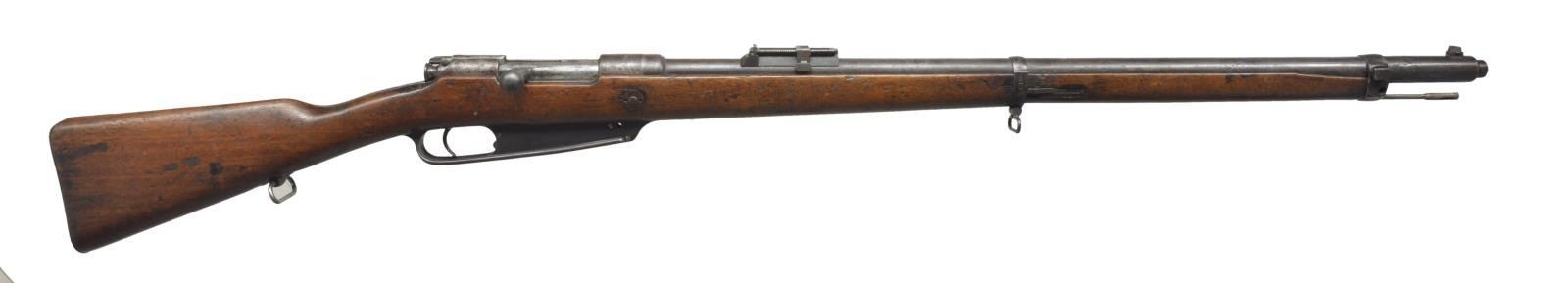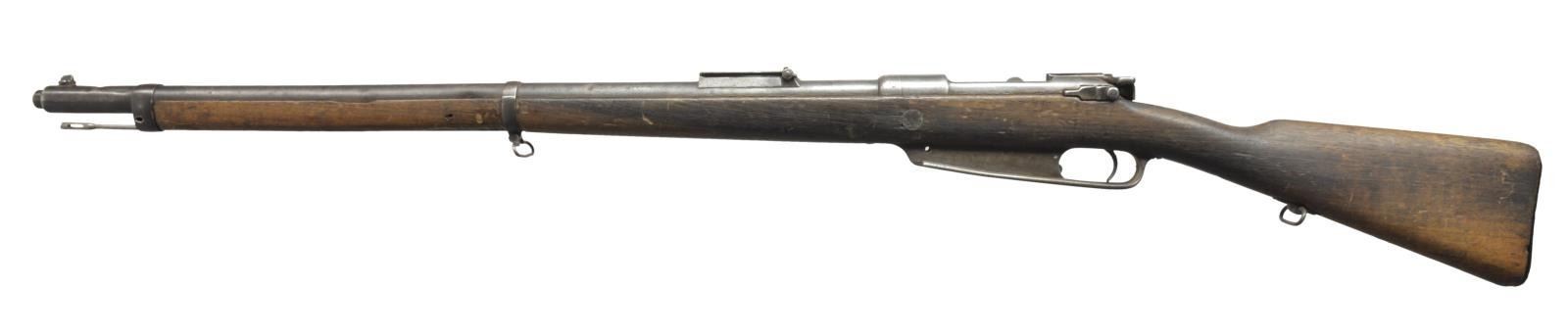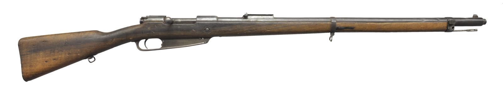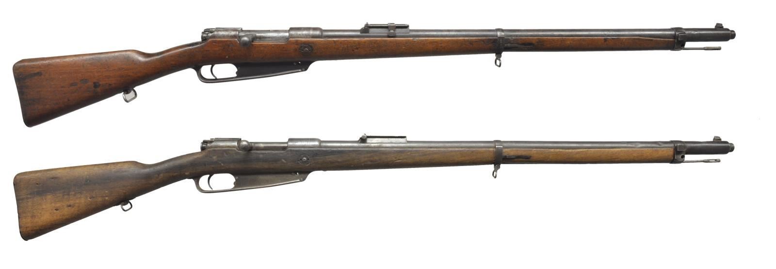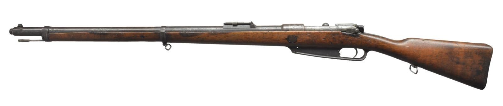 1) LOEWE. Cal. 8x57mm Mauser S bore. S# 780U. Bbl. 29" w/ shroud. Barleycorn front sight w/ 2,000m tangent leaf rear sight. Front receiver ring has "S" bore marking over "Loewe Berlin / 1891". Bbl. & receiver have matching numbers. Bolt has non matching "9871". Floorplate & trigger guard have non matching "8625V". Rear bbl. band numbered "51R.R.4173". Front band marked "16.K.7". Buttplate marked "12 / S'. Right side of stock butt has 2 German proofs. 2 Band fastened walnut stock w/ sling swivels, right side bayonet lug & cleaning rod. CONDITION: exterior surfaces has mottled gray brown appearance showing scattered areas of pitting & corrosion. Bbl. shroud has lg. dent between front band & rear sight. Stock has a dark worn appearance w/ numerous dents, scratches, marks & spots of staining. Bore is generally bright retaining lightly worn rifling. (01-18802/DS). 2) UNMARKED. Cal. 8x57mm Mauser J bore. S# 5996T. Bbl. 29" w/ shroud. Barleycorn front sight & tangent leaf rear sight missing slide. Left side of action marked "GEW 88". Receiver ring has no markings. Bolt numbered "5996T". Trigger guard & floorplate assembly marked "66". Rear band marked "52". Front band marked "64". 2 Band walnut stock w/ sling swivels, right side bayonet lug & cleaning rod. CONDITION: metal has mottled gray brown appearance w/ light pitting. Shroud shows several dents. Stock has age darkened heavily worn appearance w/ numerous dents, gouges & marks having sm. chips in several places. Lower buttplate screw & front band screw are missing. Functioning action. Pitted bore retaining partially visible rifling. (01-18809/DS). BOTH ANTIQUE. $250-400.