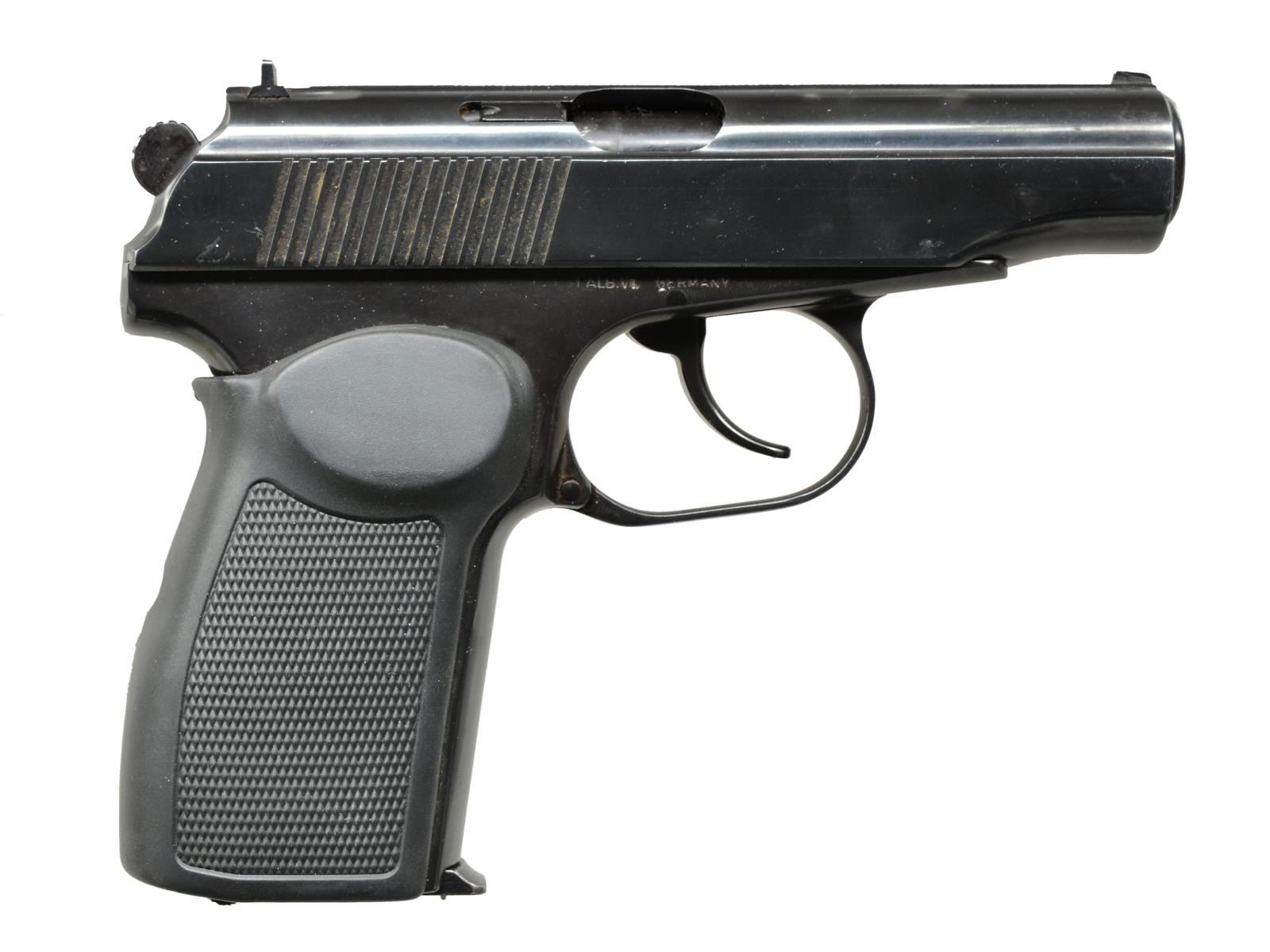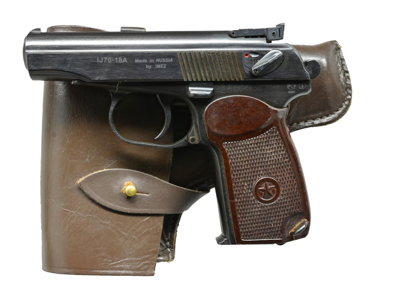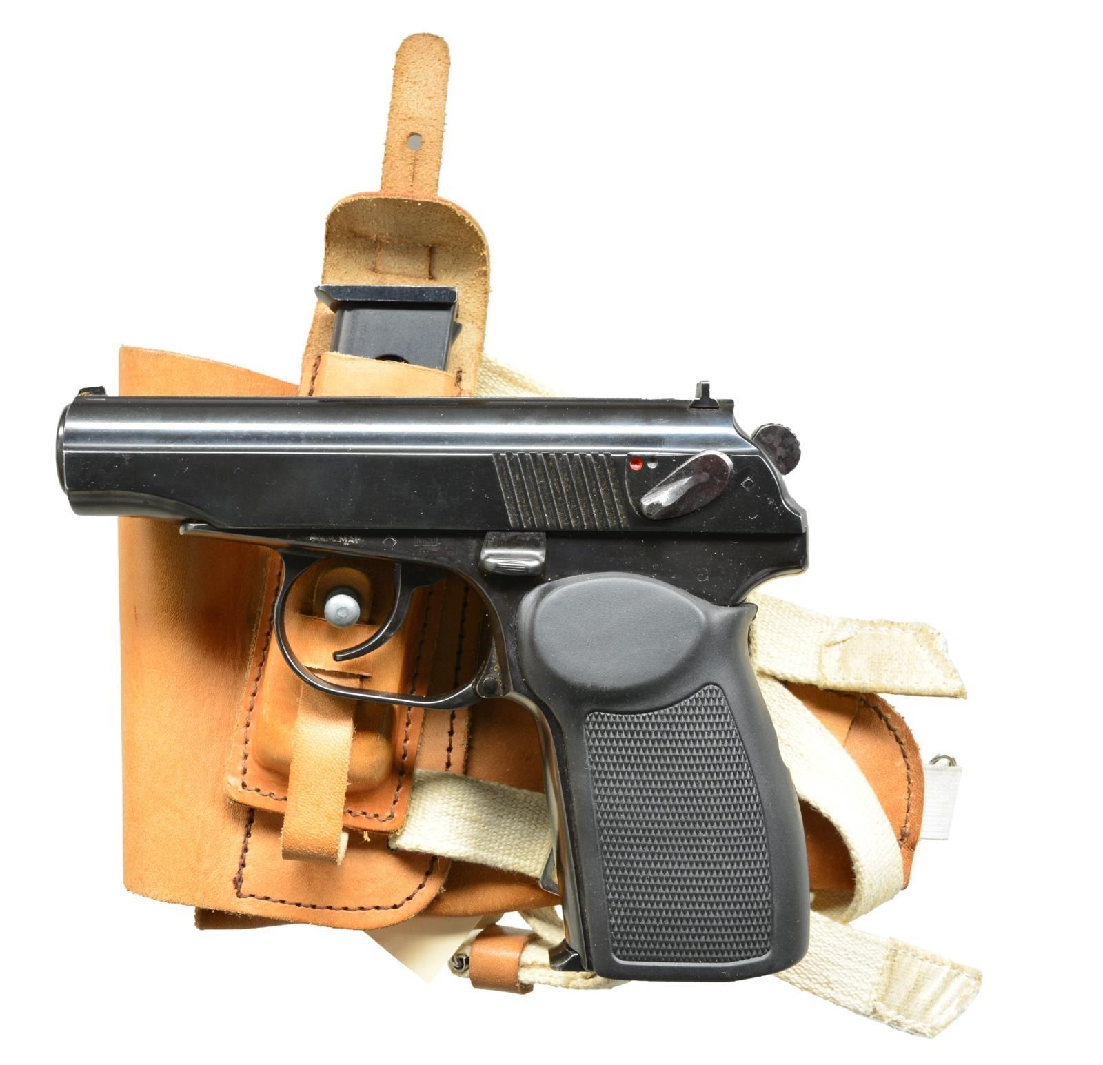 1) RUSSIAN. Cal. 9x18 MAK. S# AEC3850. Bbl. 3 3/4". Import marked on right side of slide. Frame has three acceptance marks on left rear. "PC," "encircled arrow" & tiny "SA01". Left side of slide marked "IJ70-18A" "Made in RUSSIA" "by IMEZ". Right side of slide marked "BIG BEAR ARMS" "DALLAS, TX" "Cal. 9mm Makarov". Fully adj. rear sight. Fixed front sight. SA/DA. Checkered brown composite grips w/ stars. MAGS: 2-8 rd. UNATTACHED ACCESSORIES: brown leather military holster, in good serviceable condition w/ light wear & flexing. CONDITION: grips have very light wear & handling marks. Metal retains 90% original blue finish w/ very light high point wear. Good, shiny bore. (21-821/RW). MODERN. 2) EAST GERMAN. Cal. 9mm MAK. S# BY 6830. Bbl. 3 3/4". Import marked on right side of frame. S#'s match on frame & slide. Frame marked on left side w/ circle in diamond indicating East German mfg. Boxed "K-100." "9mm MAK". "a" in circle of dots. Dated "62". Slide marked on left rear w/ circle in diamond. Frame marked on right side w/ import mark & "GERMANY." Fixed sights. Large mag. well for high capacity mags. Aftermarket black checkered rubber grip retained by Allen screw. MAGS: 2-8rd. w/ swell at bases to accommodate wider mag. well. UNATTACHED ACCESSORIES: tan leather military style shoulder holster w/ white web straps. Holster marked "Mdl III/I" "Made in Germany." Holster has light wear, but appears in good serviceable condition. CONDITION: grip is in very good condition. Retains high degree of arsenal rework blue w/ light high point wear. Very good shiny bore. (21-826/RW). CURIO. $400-800.