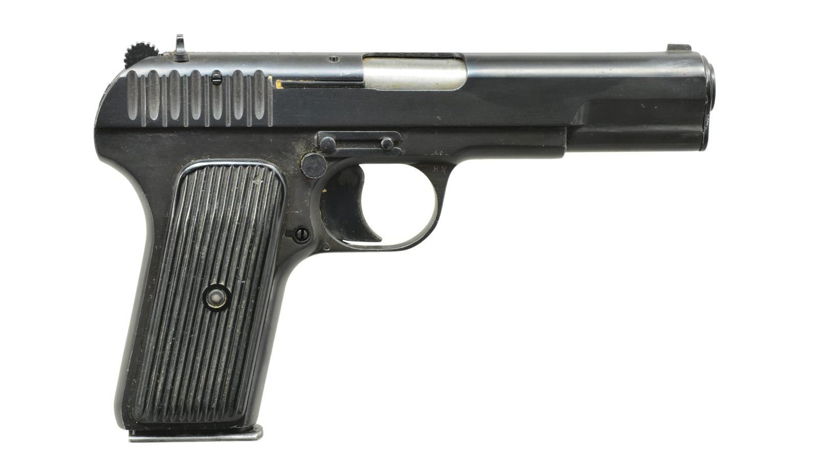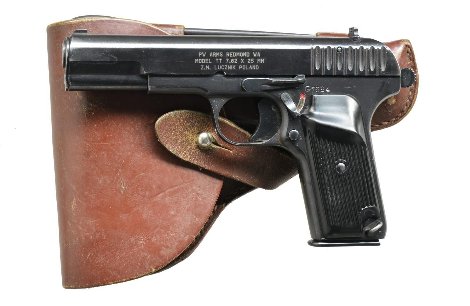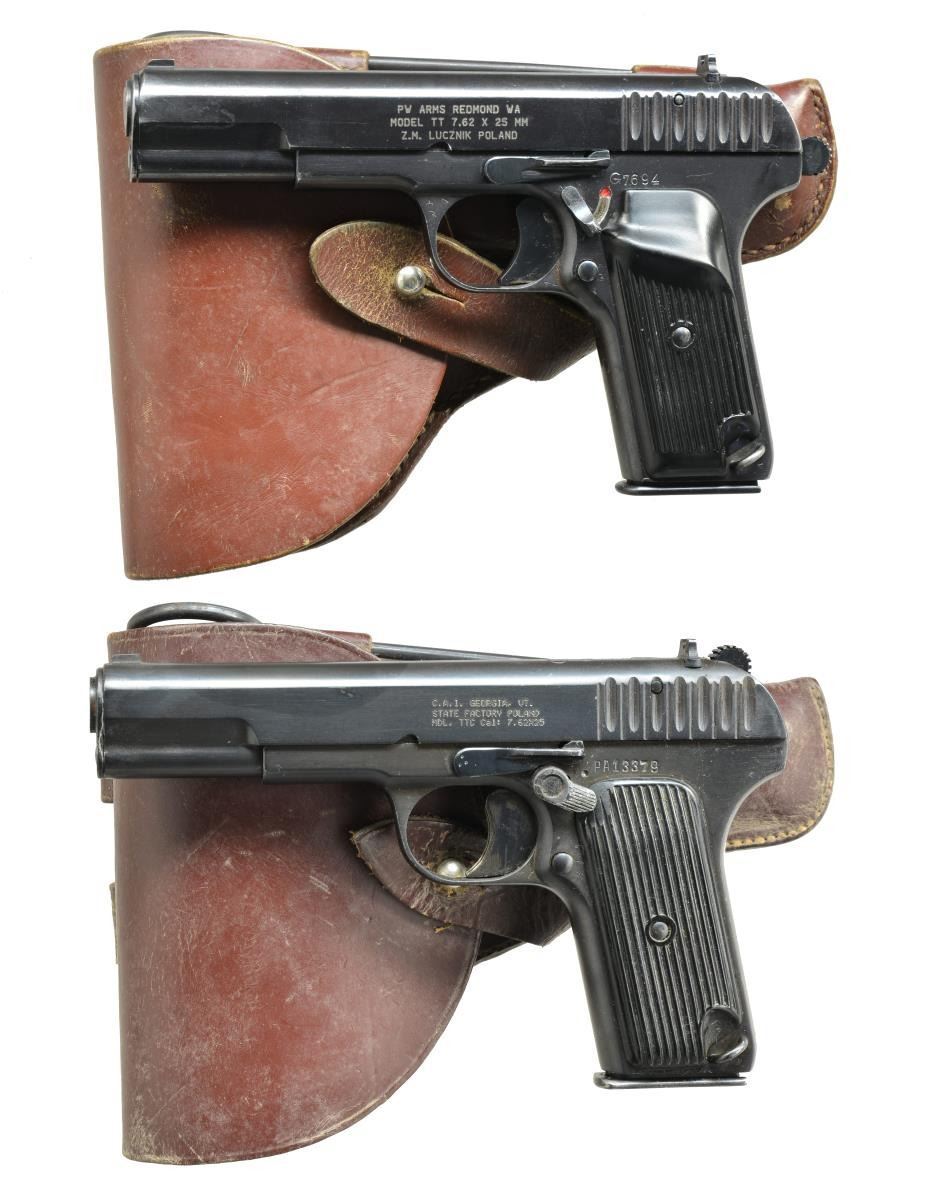 ALL: cal. 7.62x25. Bbls. 4 1/2". Fixed sights. 1) Z.M. LUCZNIK MODEL TT. S# G7694. Import marked on left side of slide "PW ARMS REDMOND WA MODEL TT 7.62x25mm Z.M. LUCZNIK POLAND". Slide is marked on top w/ triangular "FB" Radom logo & dated 1949. Has added side safety behind trigger. Brown composite grips w/ thumb rest. MAGS: 2 - 8 rd. mags. UNATTACHED ACCESSORIES: brown leather holster w/ mag. pouch & cleaning rod. Holster has wear & scuffing, but appears serviceable. CONDITION: very good grips w/ several tiny missing chips. Metal has 85% arsenal rework blue finish w/ light wear & scattered scratches. Bore has strong lands, but turning dark in grooves. (21-831/RW) 2) MODEL TTC. S# PA13379. Slide is marked on left side "C.A.I. GEORGIA, VT. STATE FACTORY POLAND MDL. TTC Cal: 7.62x25". Slide is marked on top w/ encircled "11" & dated 1952. Has added thumb safety on left side behind trigger guard. Brown composite grips w/ vertical grooves. MAGS: 2 - 8 rd. mags. UNATTACHED ACCESSORIES: brown leather holster w/ mag. pouch & cleaning rod. Holster has wear & flexing, but in good condition. CONDITION: grips have good appearance w/ light overall wear & notable missing chip on top right side. Pistol retains 80% arsenal rework blue finish w/ light wear, scattered scratches & sm. spots of finish loss. Safety has loss of finish & tiny dents on thumb lever. Good shiny bore w/ strong lands. (21-835/RW). ALL CURIO. $400-600.