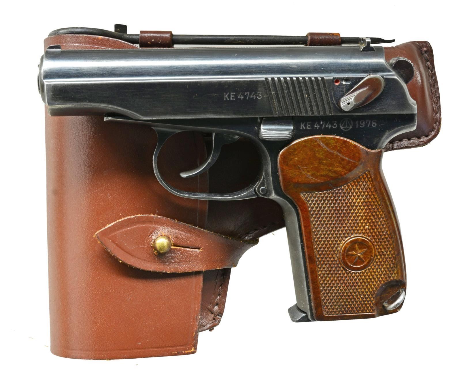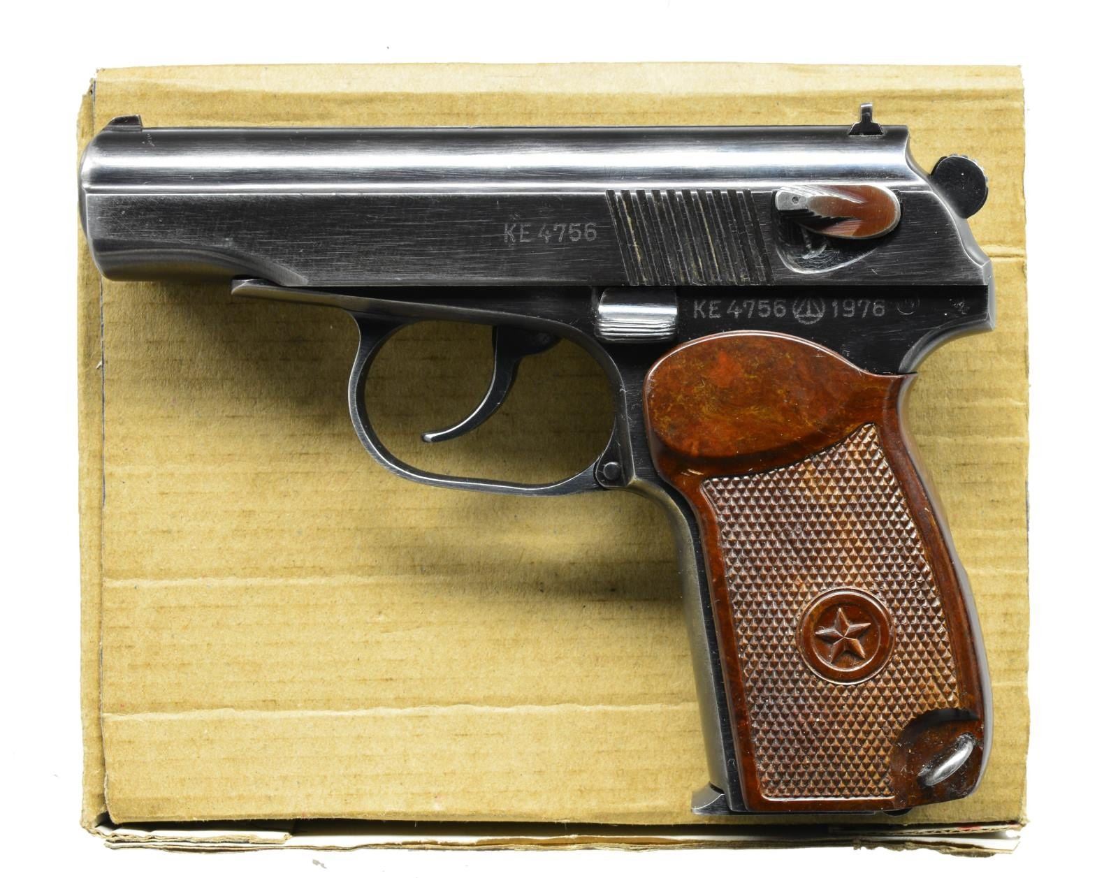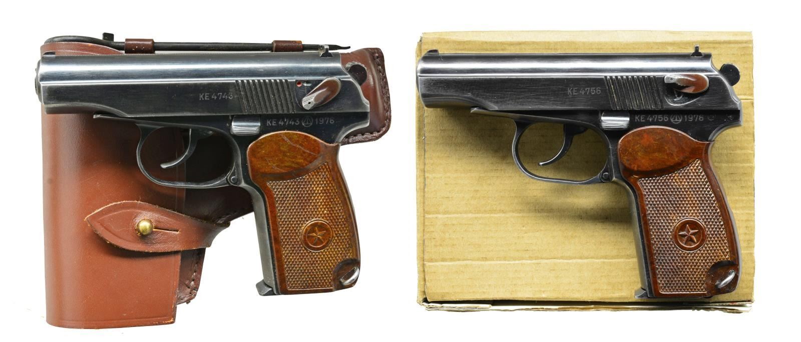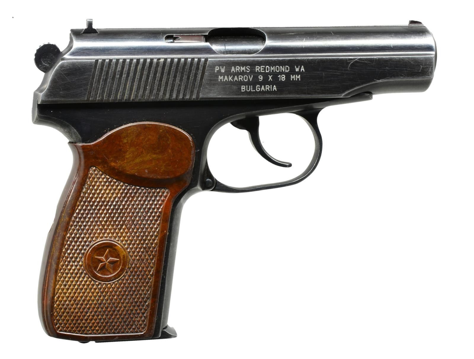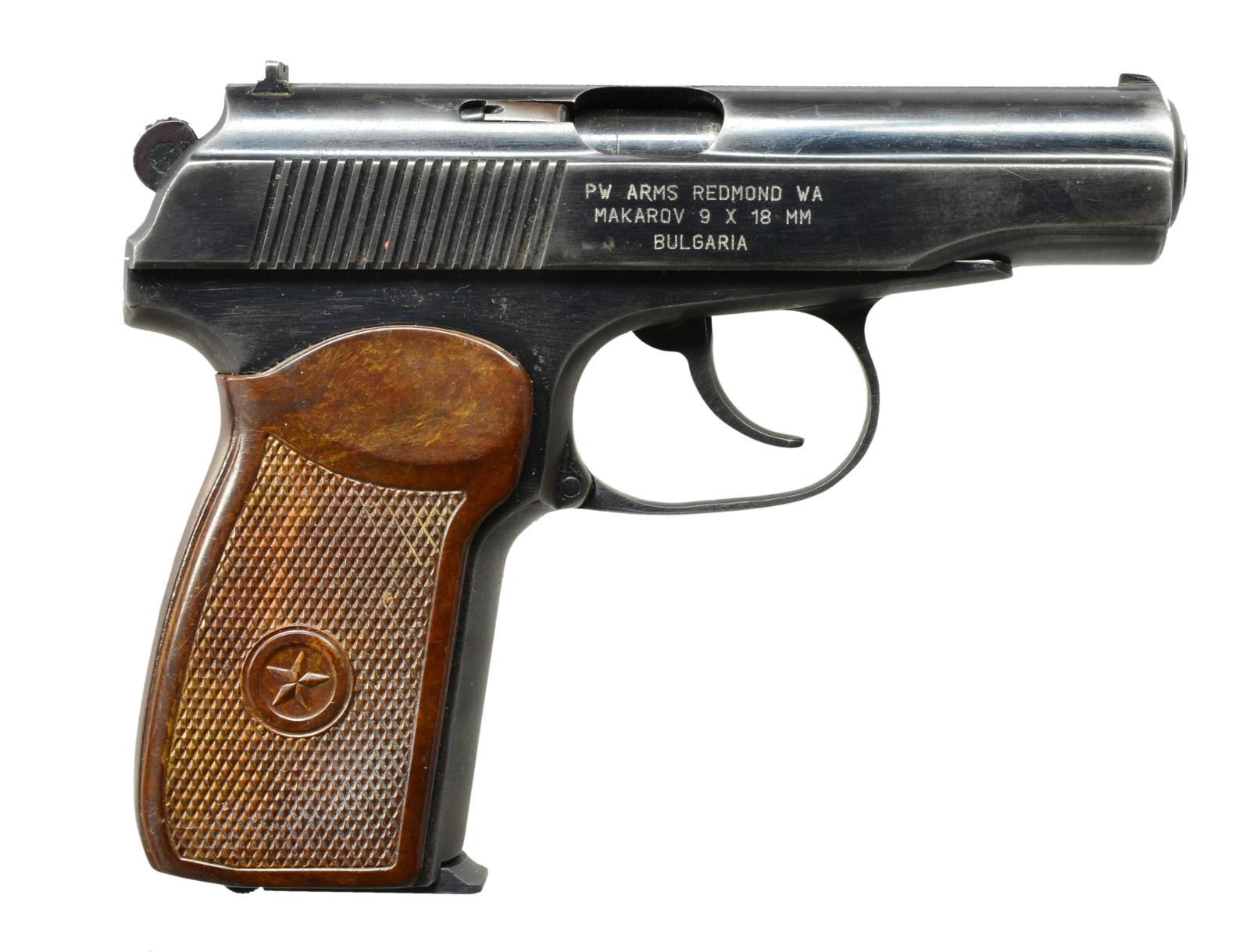 1) Cal. 9x18 MAK. S# KE4743. Bbl. 3 3/4". Import marked on right side of slide. Left side of frame marked w/ encircled diamond indicating Russian mfg. Dated 1976. Slide markings on right side are "PW ARMS REDMOND, WA" "MAKAROV 9x18MM BULGARIA." Fixed sights. SA/DA. Checkered brown composite grip w/ stars. MAGS: 2-8 rd. UNATTACHED ACCSESSORIES: Brown leather holster w/ mag. pouch & cleaning rod. Holster has very light wear & is in good serviceable condition. CONDITION: grips have light wear, sm. scratches & flattening of diamonds. Has 80% blue finish w/ high point wear & thinning notable in muzzle area. Scattered sm. areas of peppery oxidation. Good, shiny bore w/ light wear to lands. (21-822/RW). 2) Cal. 9x18 MAK. S# KE4756. Bbl. 3 3/4". Slide import marked on right side. Frame marked on left side w/ encircled triangle indicating Russian mfg., dated 1976. Right side of slide marked "PW ARMS" "REDMOND, WA" "MAKAROV" "9x18MM BULGARIA". Fixed sights. SA/DA. Checkered brown composite grip w/ stars. MAGS: 2 matching 8 rd. UNATTACHED ACCESSORIES: cardboard shipping box. CONDITION: grip has very light wear & sm. area of flattened diamonds on right side. Has 70% thinning blue w/ wear, sm. scratches & handling marks. Very good shiny bore. (21-824/RW). BOTH MODERN. $400-600.