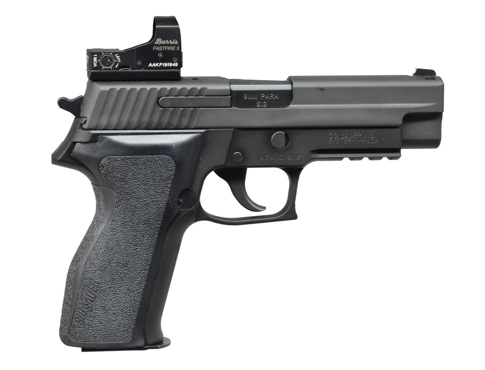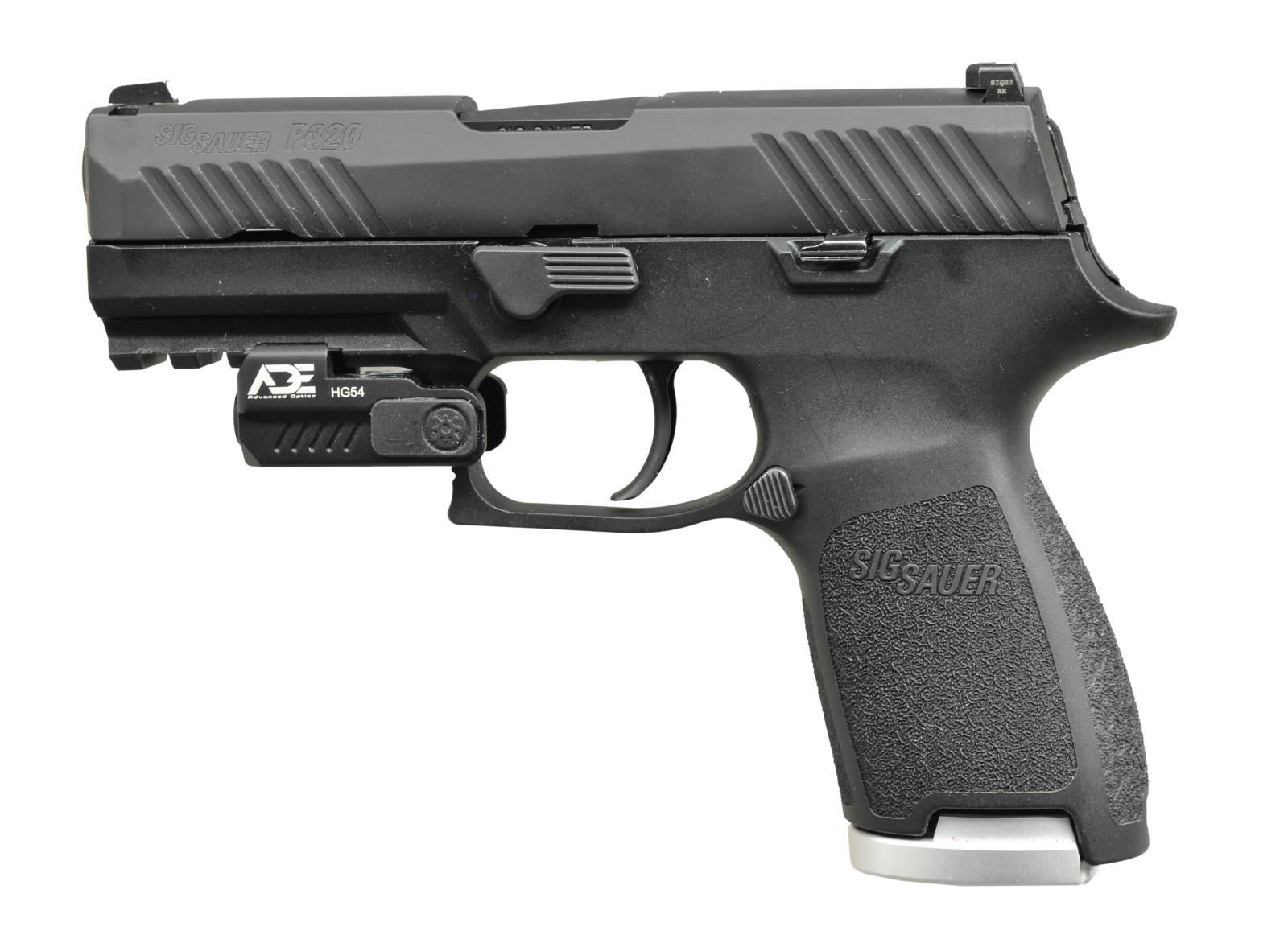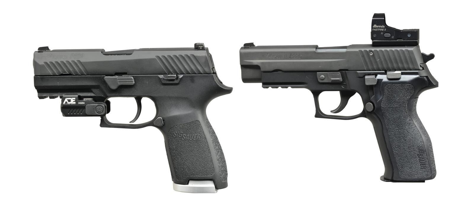 1) MODEL P320 COMPACT. Cal. 45 ACP. S# 58H054552. Bbl. 3.9". All black finish w/ polymer frame having stippled gripping surfaces. Front & rear cocking grooves on slide having dovetailed 3 dot night sights. 4 slot accessory rail fitted w/ ADE Advanced Optics Model HG54 ambidextrous multi mode green dot laser. SFO functioning. MAGS: 1 factory 9 rd. w/ silver base. UNATTACHED ACCESSORIES: owner's manual. CONDITION: all aspects near excellent. (21-1497/NW). 2) MODEL P226. Cal. 9mm Luger. S# 47A101518. Bbl. 4.4". All black finish w/ stippled 1 piece grip & horizontally grooved front strap. Hooked trigger guard w/ horizontal grooves plus 3 slot accessory rail. Dovetailed white dot front sight; rear sight replaced w/ Burris Fastfire 3 red dot sight having 3 MOA dot. DA functioning w/ decocking lever. MAGS: 1 factory 15 rd. CONDITION: all aspects near excellent. (21-1499/NW). BOTH MODERN. $800-1,200.
