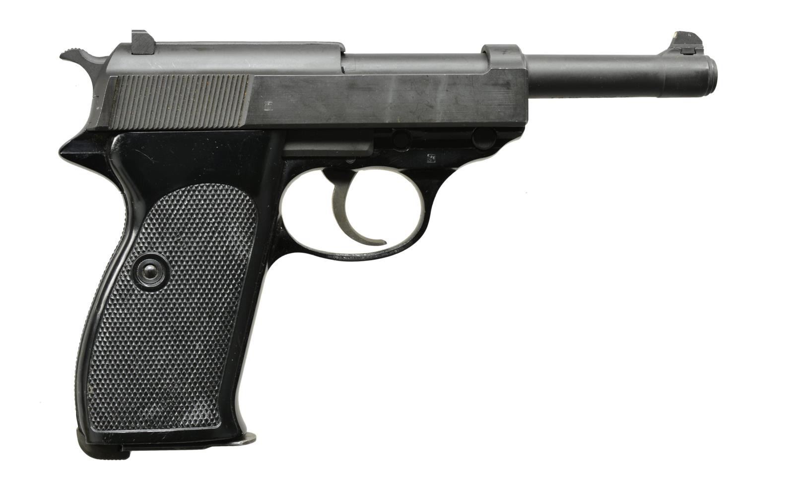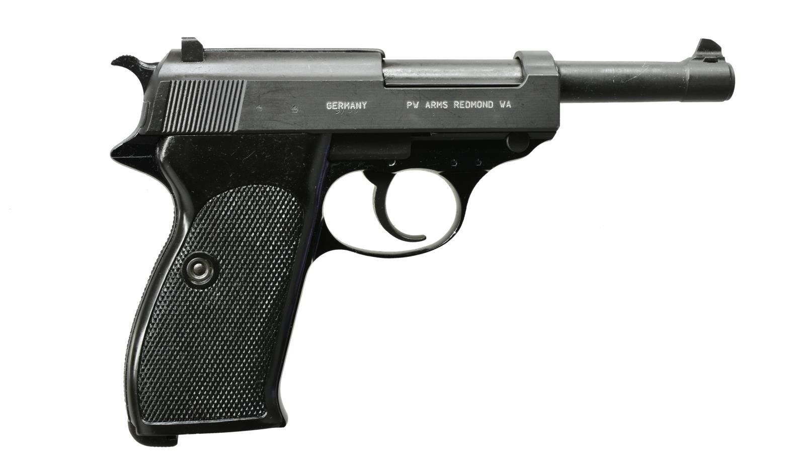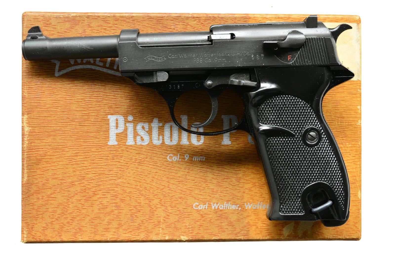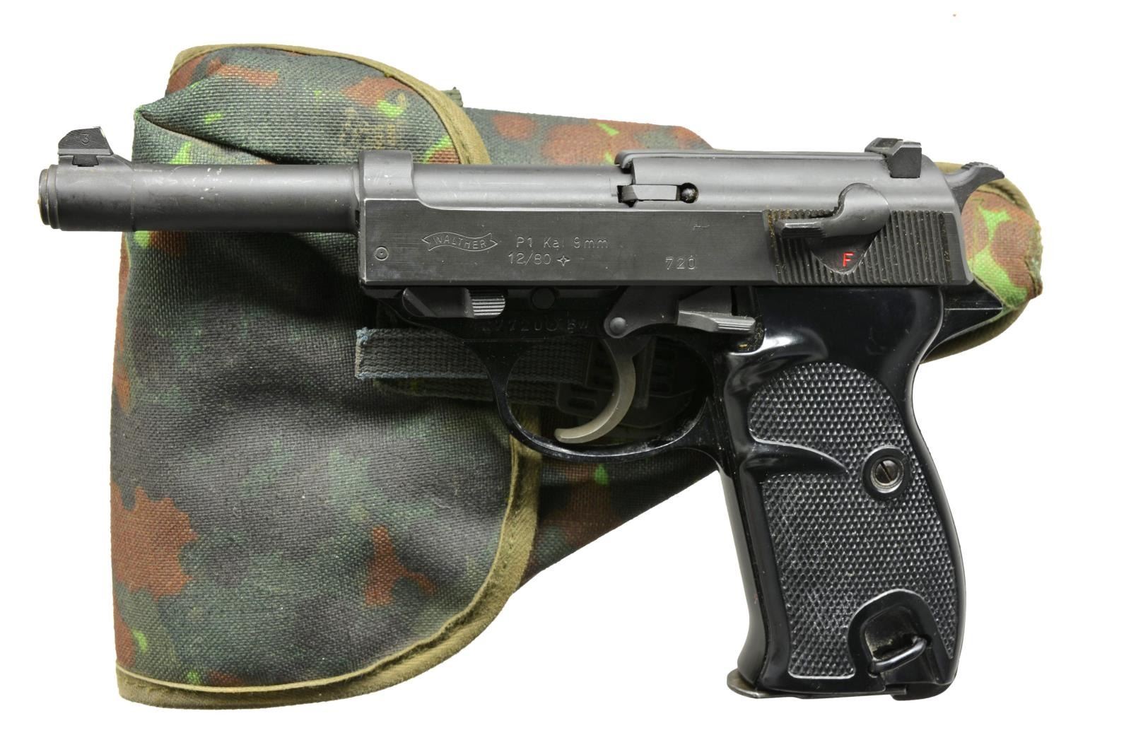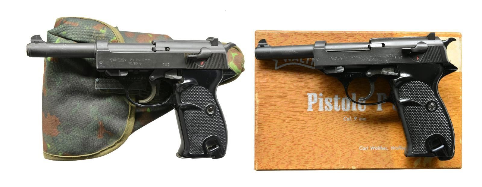 BOTH: cal. 9mm Luger. Bbls. 5". Matte blued w/ gloss black alloy frames. Checkered black plastic grips w/ abbreviated RH thumbrest. Matching numbered slides & bbls. plus unmarked locking blocks. Circle dot proofs on frames, slides & bbls. 1) MODEL P1. S# 427720. Mfg. 12/80 w/ star symbol after date. Import marked on underside of bbl. Front sight w/ wide blade and white dot. MAGS: 2 Walther banner P1 marked 8 rd. Very good matte blued & good plus parkerized. UNATTACHED ACCESSORIES: very good German nylon & plastic Nato numbered holster dated "3/95". Plain brown hinged cardboard box w/ bar code label & reproduced manual. CONDITION: very sm. mark on mid point of bbl. & very slight thinning on front corners of slide. Light wear on grips including diamond tops. Near excellent frame finish & bore. (21-789/NW). MODERN. 2) MODEL P38.S# 223187. Mfg. 9/63 as marked on slide along w/ "GERMANY" export mark & "PW ARMS" import mark; left side of slide has "P38". Front sight w/ WWII profile. MAGS: 1 very good 8 rd. w/ "5/63" date & Nato stock # on spine wrapped in "2/76" dated wrapper. UNATTACHED ACCESSORIES: good plus matching numbered post war Walther compartmentalized 2 piece wood grained box w/ appearance of sun fading on 1/3 of lid. CONDITION: sm. mark on mid point of bbl. All other aspects near excellent including bore & grips; appears unfired. (21-855/NW). CURIO. $800-1,200.