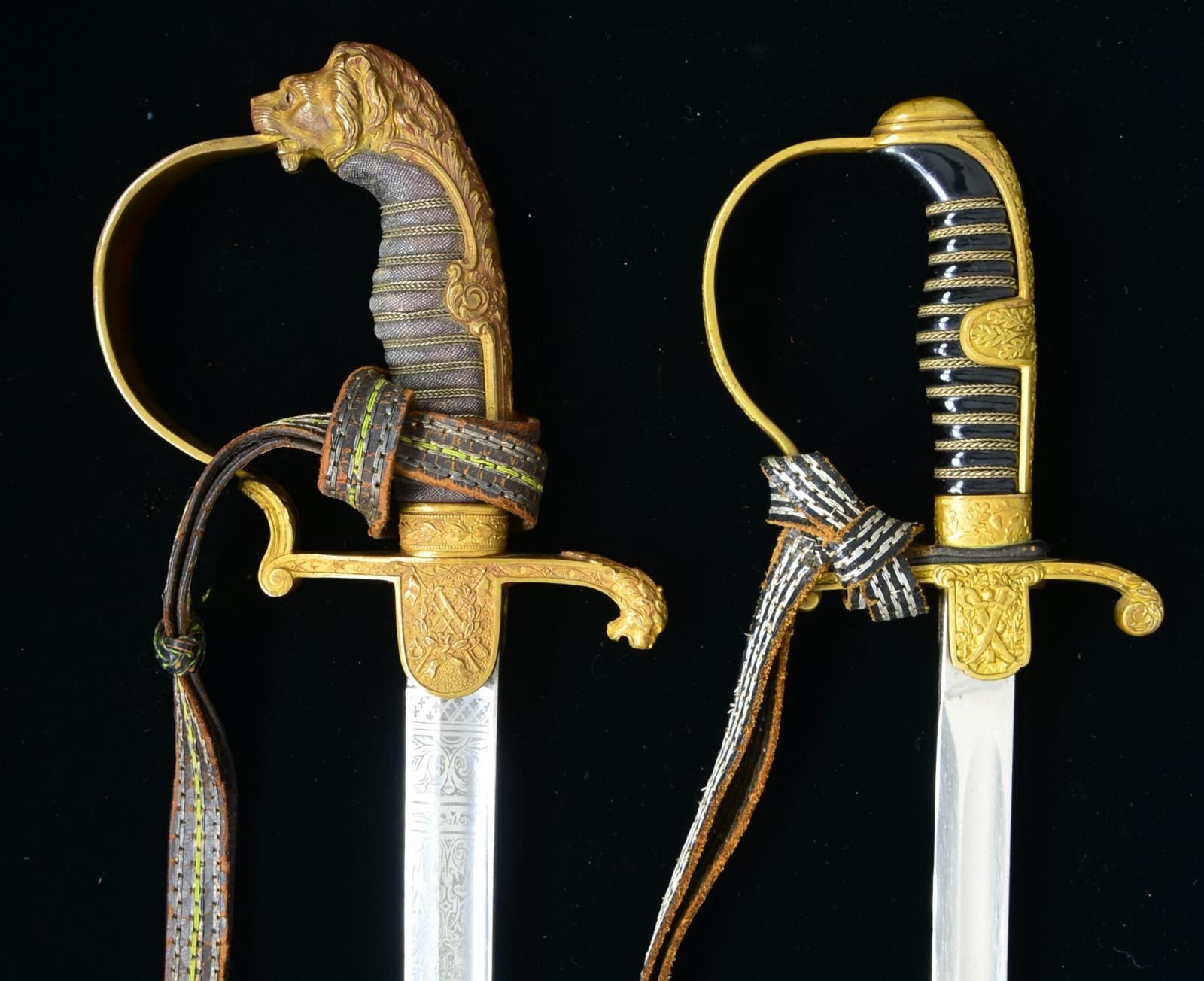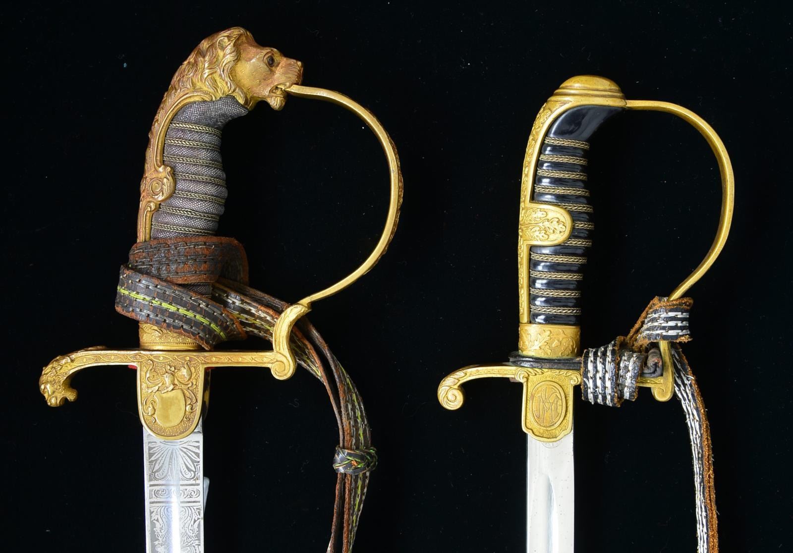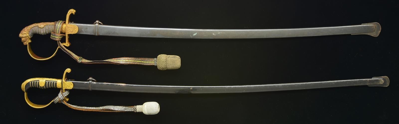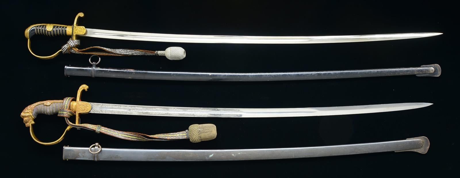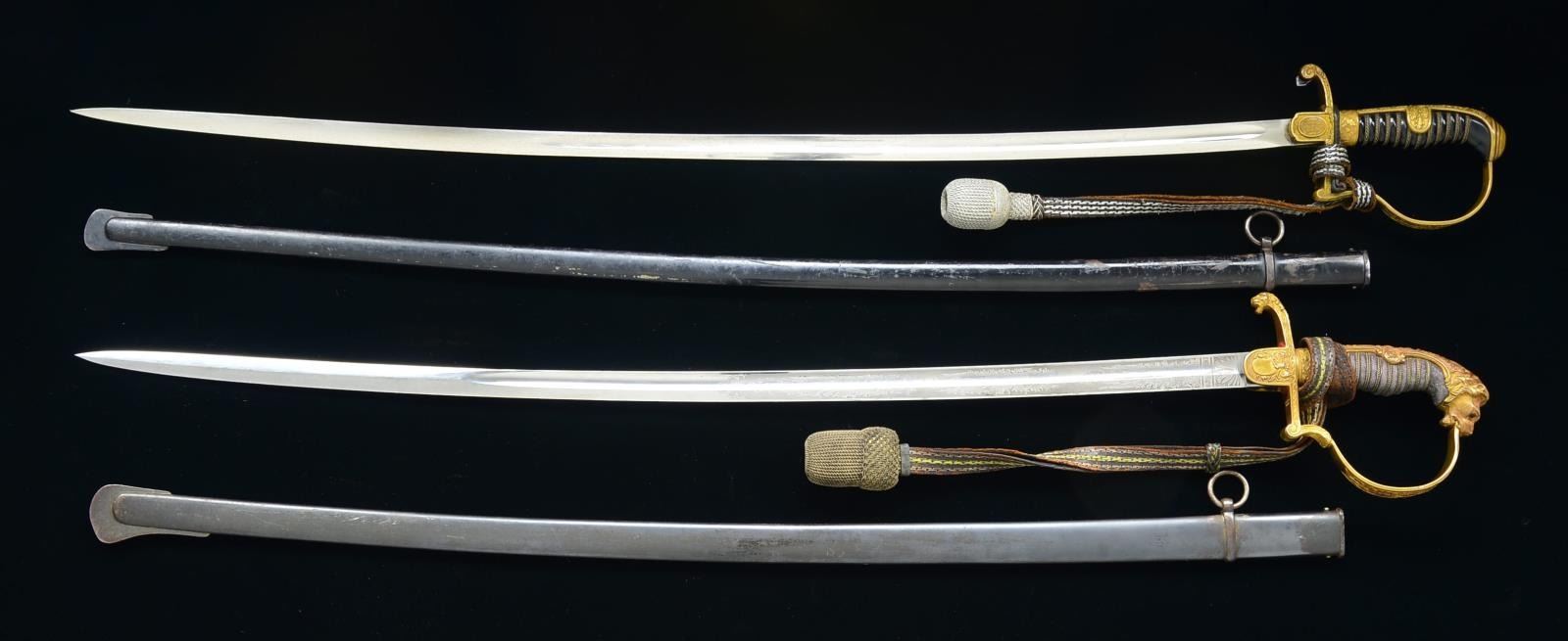 1) CAVALRY. Overall length: 39 3/4". Blade length: 34". Plain, single fullered blade stamped at the ricasso, “CARL EICKHORN (squirrel) SOLINGEN”. Gilded brass hilt w/ crossed sabers on the front languet. Knuckle bow & backstrap are ornately decorated w/ oak leaves & acorns. Plain pommel. Leather & silver bullion sword knot attached. Black enameled metal scabbard. CONDITION: blade shows substantial original factory polish. Hilt retains 85% original gilding. Grip & wire are complete. Knot shows light wear. Scabbard has minor finish loss particularly near the drag. (02-15001 /BF). 2) STAFF OFFICER. Overall length: 39". Blade length: 32 1/2". Single fullered blade etched over half its length w/ various patriotic, military & foliate motifs. Gilded brass hilt w/ crossed swords, polearms & wreath on the front languet. The base of the crossguard is stamped, “GESCHUTZTES MUSTER”. Knuckle bow is ornately decorated w/ oak leaves & acorns. Backstrap has allegorical motifs terminating in a well articulated lion head pommel w/ faceted red eyes. Leather & silver bullion sword knot. Black anodized metal scabbard. CONDITION: blade shows substantial original factory polish. Etching is quite crisp. Hilt retains much of the original gilded finish. Faceted eyes are undamaged. Grip shows light wear. Knot shows moderate wear. Scabbard retains nearly all of its anodized finish w/ minor wear concentrated near the drag. (02-15003/BF). $600-900.