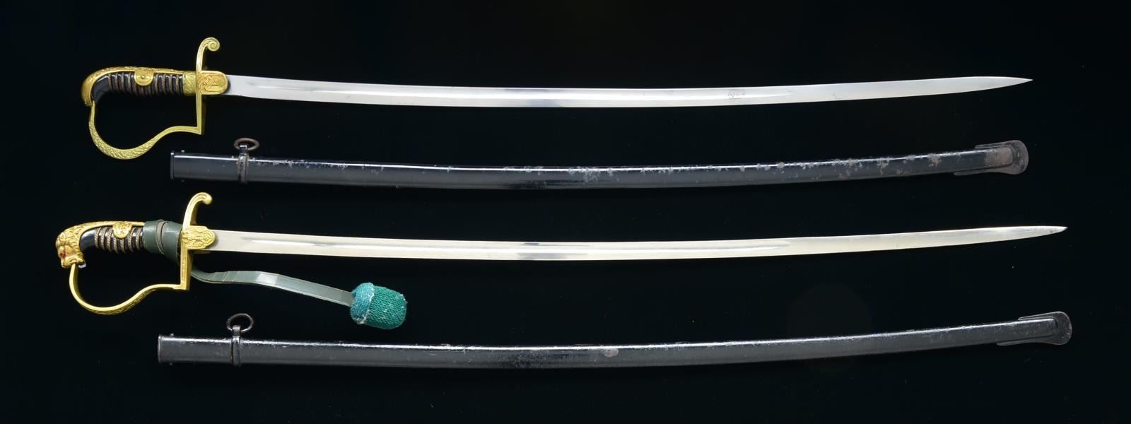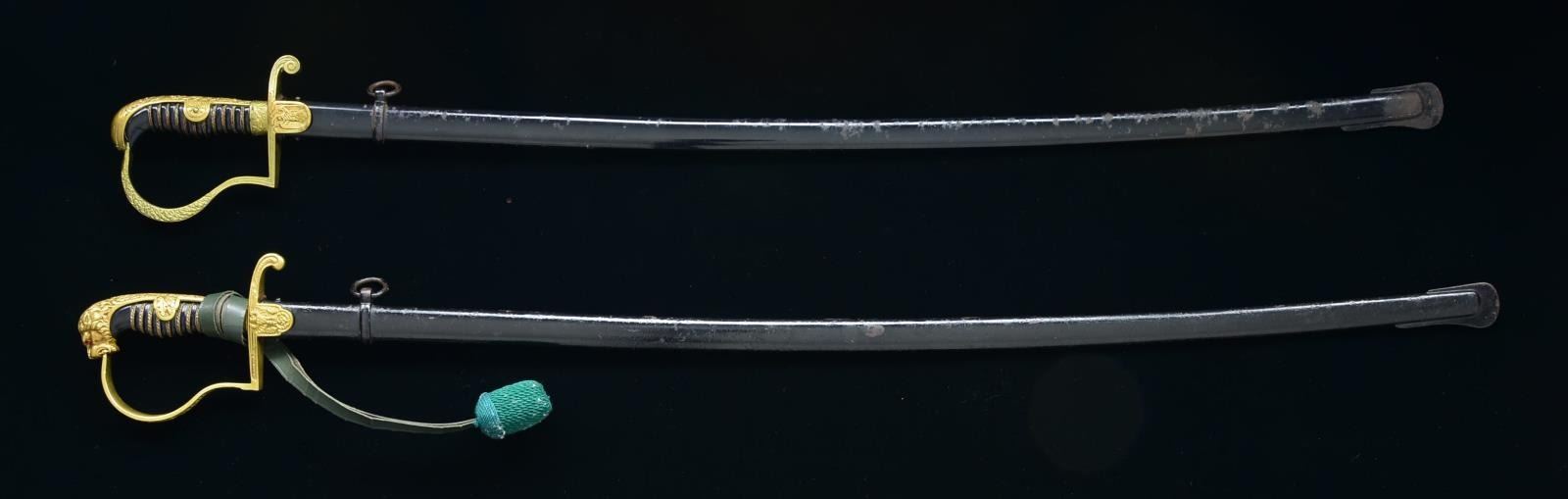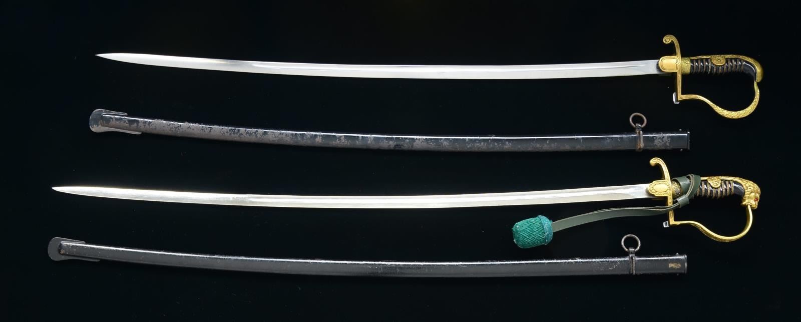 1) EARLY ARMY SWORD. Overall length: 37". Blade length: 31 1/4". Single fuller blade marked at the ricasso, “SIEGFRIED ERNST PACK & SOHNE M.B.H. WAFFENFABRIK SOLINGEN WAFFEN”. Gilded brass hilt w/ WWII German eagle on languet. Knuckle bow & backstrap are ornately foliate decorated. Dove head style pommel. Composite grip w/ wire wrap. Black painted metal scabbard. CONDITION: blade shows original factory polish. Hilt shows light wear. Scabbard has about 30% loss of finish. (02-15114/BF). 2) ARMY OFFICER’S SWORD. Overall length: 39". Blade length: 33". Single fullered blade marked, “ALCOSO ACS (scales) SOLINGEN”. Gilded brass hilt w/ WWII German eagle on languet. Knuckle bow & backstrap are oak leaf decorated. Classic lion head pommel w/ red eyes. There is a sword knot attached that is green wool w/ a leather thong that may not be appropriate for this sword. Composite grip w/ wire wrap. Black painted metal scabbard. CONDITION: blade shows substantial original factory polish. Hilt generally shows light wear. Scabbard may have seen some repainting. (02-15115/BF). $600-900.