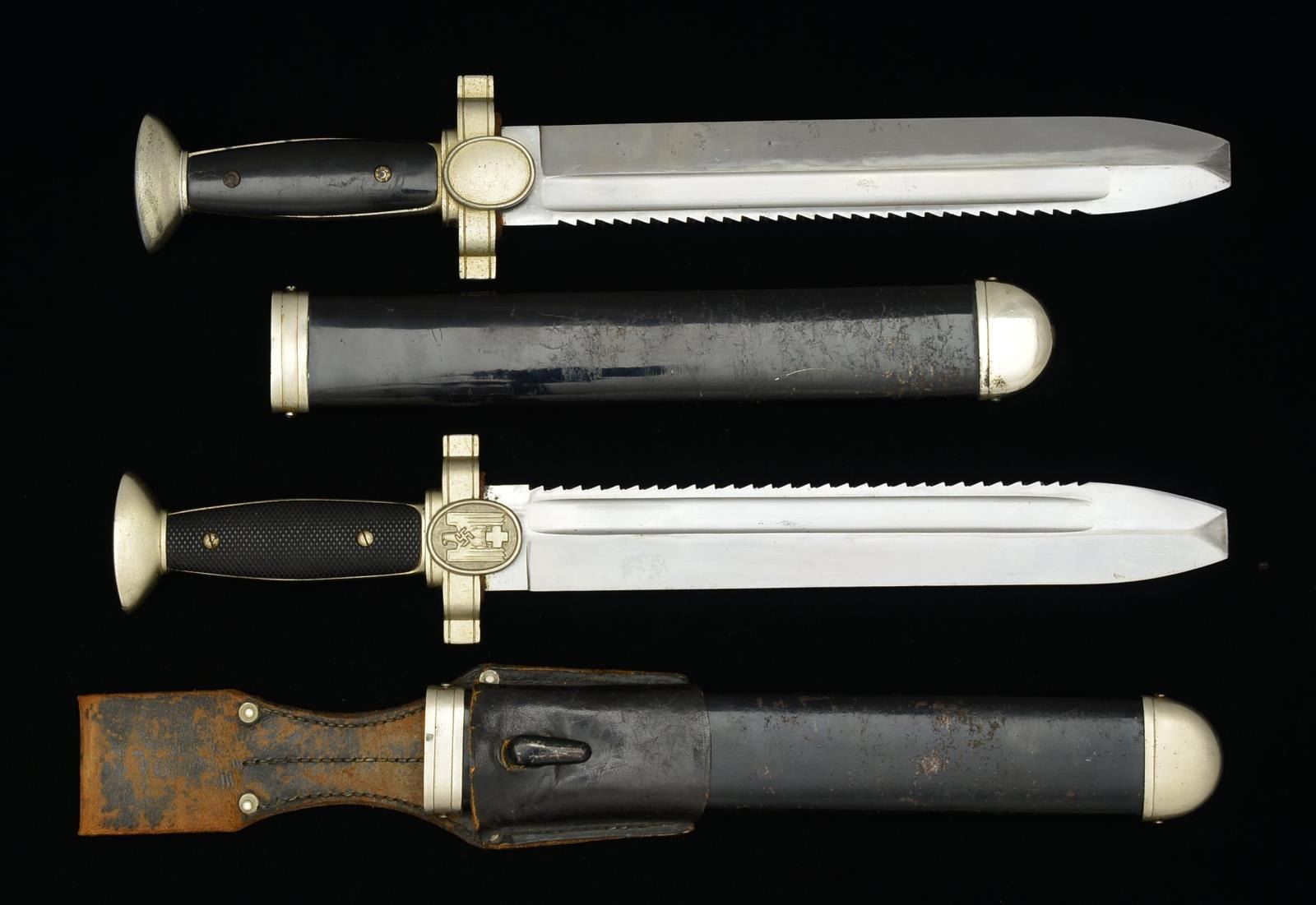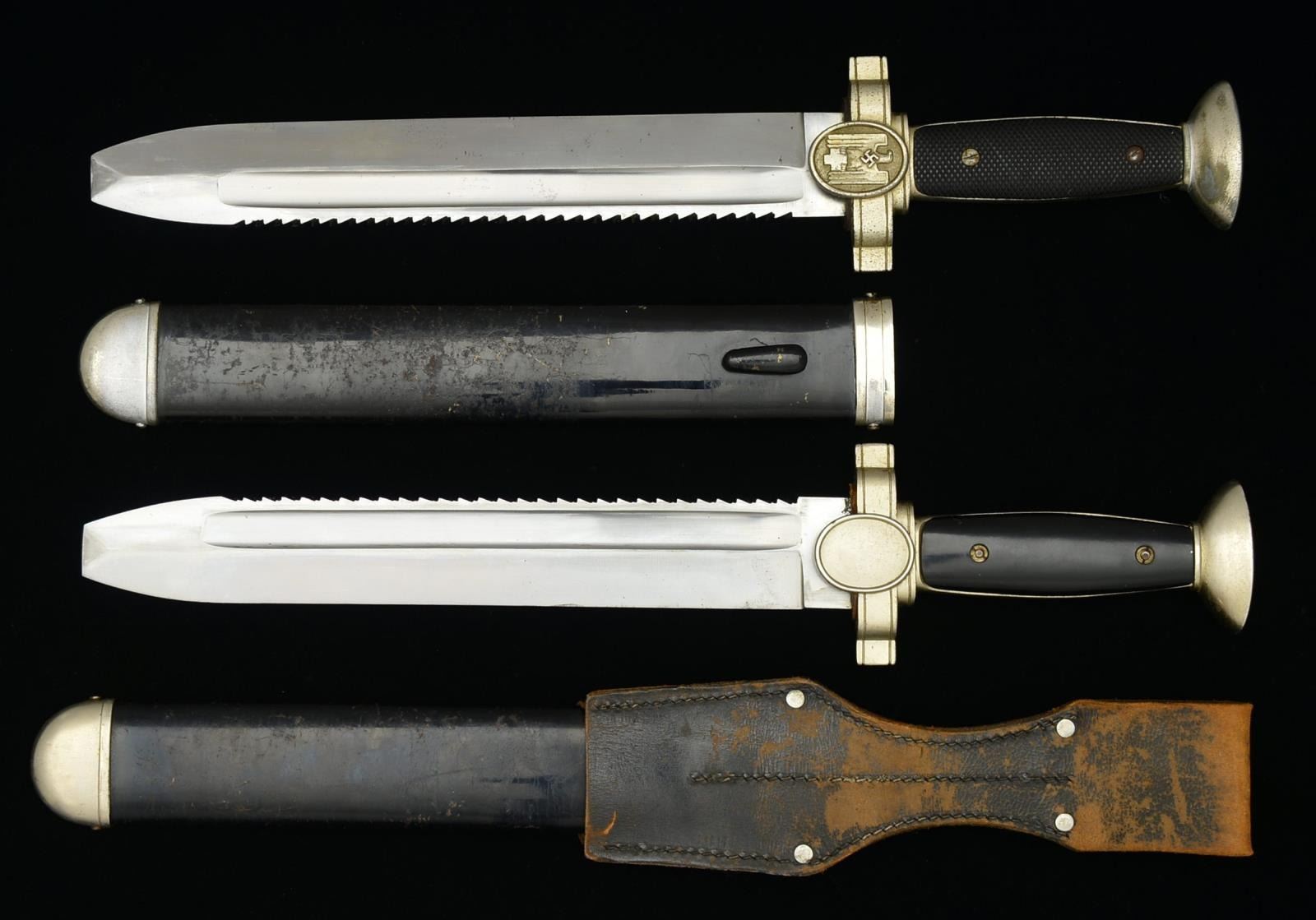 1) Overall length: 16 1/4". The single fullered sawback blade marked, “GES. GESCHUTZT” at the ricasso. Crossguard features a Red Cross eagle w/ Party symbol. 2 Piece black composite grips w/ checkering on the front grip. Black enameled scabbard w/ plated mounts. CONDITION: blade shows areas of original factory polish. The remainder of the dagger shows light wear w/ minor loss of finish to the scabbard. (02-15084/BF). 2) Overall length: 16 1/4". The single fullered sawback blade is unmarked. Crossguard features a Red Cross eagle w/ Party symbol. 2 Piece black composite grips w/ checkering on the front grip. Black enameled scabbard w/ plated mounts. Leather frog included. CONDITION: blade shows areas of original factory polish. The remainder of the dagger shows light wear w/ moderate finish loss to the scabbard. Frog shows moderate wear. (02-15109/BF). $800-1,300.