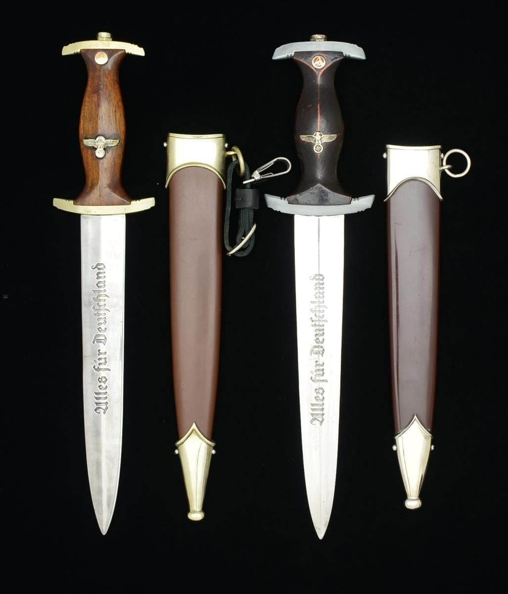 1) Overall length: 15 1/4". A repro dagger w/ “Alles fur Deutschland” cast into the blade. Nickel silver crossguard & pommel. Wood grip w/ metal eagle & SA button. Brown painted scabbard w/ plated mounts. Repro hanger attached. CONDITION: dagger shows moderate wear. 2) Overall length: 14 1/2". A repro dagger w/ “Alles fur Deutschland” cast into the blade. Pot metal crossguard & pommel. Wood grip w/ metal eagle & brown enamel SA button. Brown painted scabbard w/ plated mounts. CONDITION: dagger shows light wear. (02-15279/BF). $150-300.