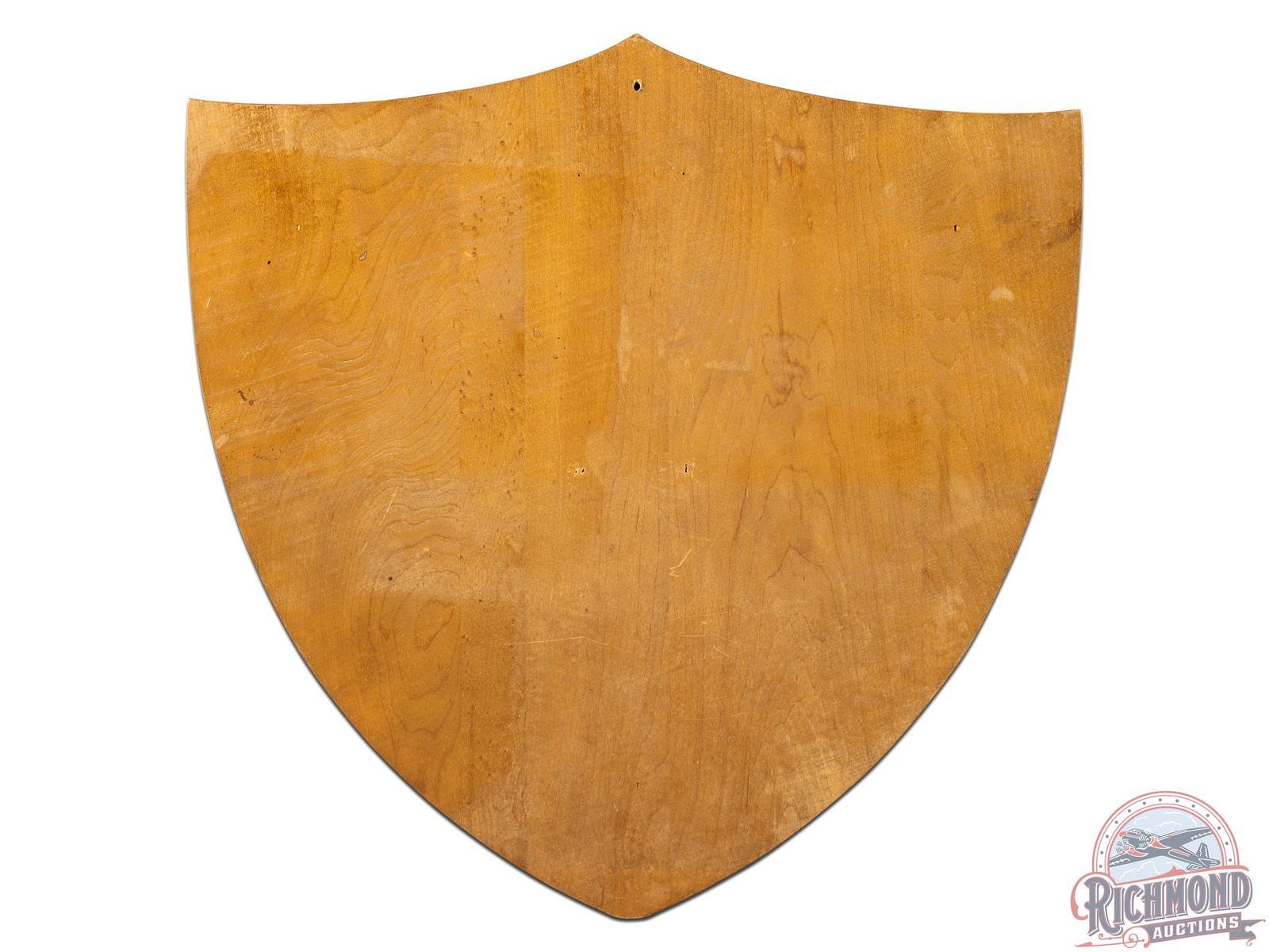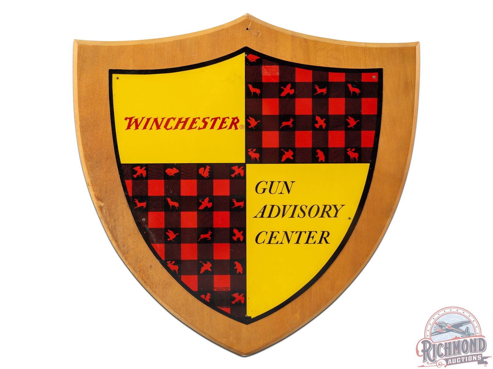 SST (single sided tin) sign mounted on a die cut wood plaque. Iconic Winchester plaid used in the 1960's and 1970's. The sign has great color and shine with light surface wear and scratches. Some sticker residue on the top point that should clean. Wooden plaque shows some general age wear and dings with an added mounting hole at the top point. Marked Olin Mathieson Chemical Corp. 20" H x 20" W.