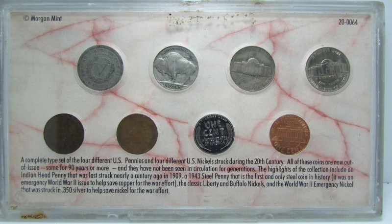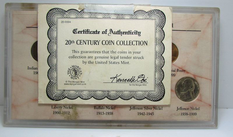 8 USA Coins - "20th Century Coin Collection" - 4 Small Cents, 4 Nickels, With COA From The Morgan Mint