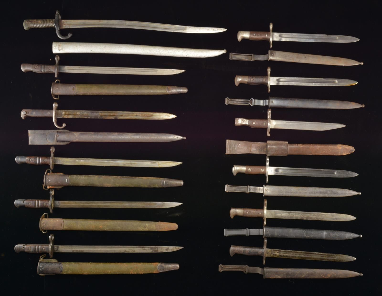 This lot of bayonets consists of 1 US Ross rifle M1905/10 bayonet & scabbard. / 8 US M1917 bayonets & scabbards. / 10 US rifle M1892 Krag Jorgensen bayonets & scabbards. / 1 US M1917 bayonet & scabbard. Bayonet has the top ring removed. / 1 Remington M1914 rolling block bayonet & scabbard. / 1 French M1866 Chassepot bayonet & scabbard. CONDITION: all bayonets show light to moderate wear except as noted. (02-14271(22)/BF). $1,400-1,800.