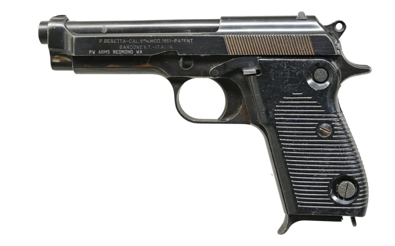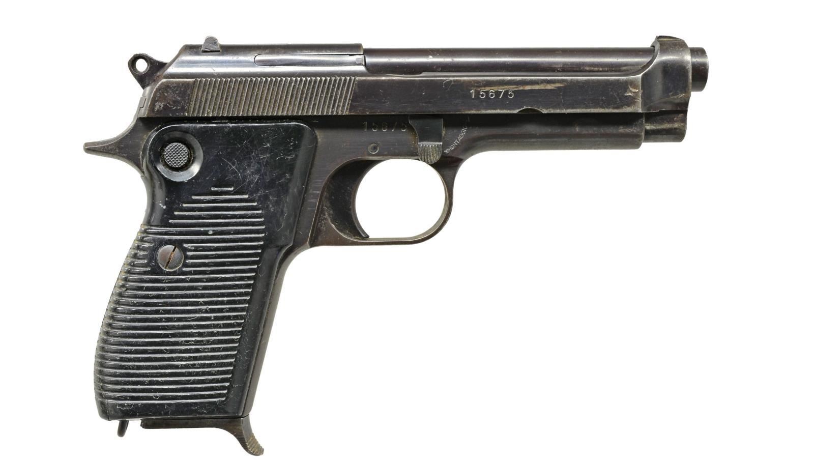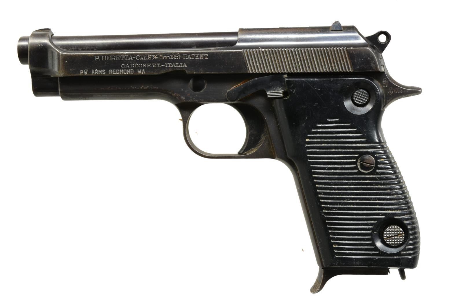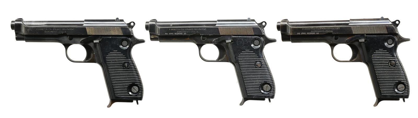ALL: cal. 9mm Luger. Bbls. 4.5". Blade front w/ fixed notch rear sights. Blue finished slides & frames. 2 Piece grooved plastic grips. MAGS: 1 detachable 8 rd. for each pistol. 1) S# 33551. SARCO import marked. UNATTACHED ACCESSORIES: black molded Flambeau foam lined molded box. CONDITION: 80% blue showing carry & edge wear w/ spots of surface corrosion. Grips show wear & scratches. Bore retains strong rifling showing spots of very light pitting. (21-807/DS). 2) S# 34730. PW ARMS import marked. CONDITION: 80% lightly faded blue showing carry & edge wear w/ scratches, handling marks & spots of corrosion. Grips shows scratches, handling marks & wear. Bore retains strong rifling showing a spot of pitting. (21-808/DS). 3) S# 15675. PW ARMS import marked. UNATTACHED ACCESSORIES: black molded Flambeau foam lined molded box. CONDITION: 70% blue showing carry & edge wear w/ dents, scratches & spots of corrosion. Grips show scratches, marks & light wear. Bore retains sound rifling showing spots of light pitting. (21-809/DS). ALL MODERN. $750-1,000.