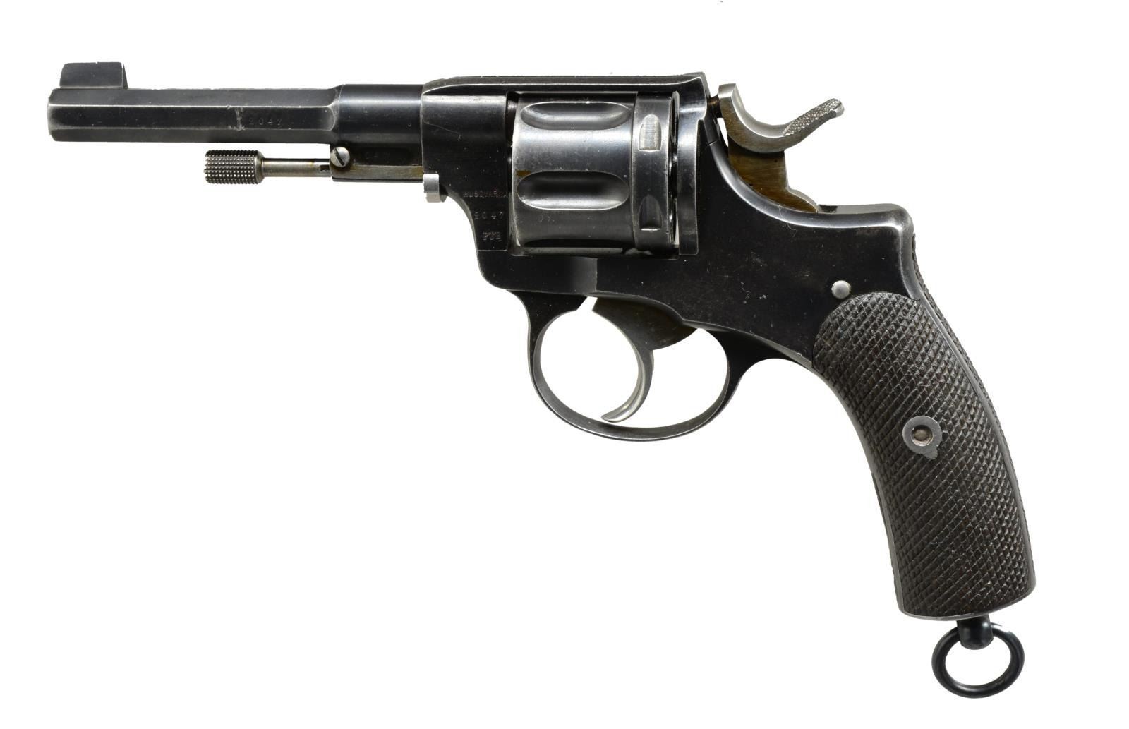 2) FRENCH MODEL 1892. Cal. 8mm Lebel revolver. S# G22469. Bbl. 4 5/8". Fixed sights. SA/DA. Frame marked on right side in script "Mfg d'Armes St Etienne". Bbl. marked on top flat "MLE 1892"; adjacent flat dated "S1898". 6 Shot cyl. Checkered wooden grips, lanyard ring on butt. UNATTACHED ACCESORIES: cardboard storage box. CONDITION: grips are worn w/ flattened diamonds w/ moderate handling marks. Metal has 80% arsenal rework blue finish. Over scattered fine pitting. Casehardened parts retain traces of color, but have peppery oxidation. Bore has darkened appearance w/ scattered fine pitting & lightly worn lands. (01-19404/RW). ANTIQUE.