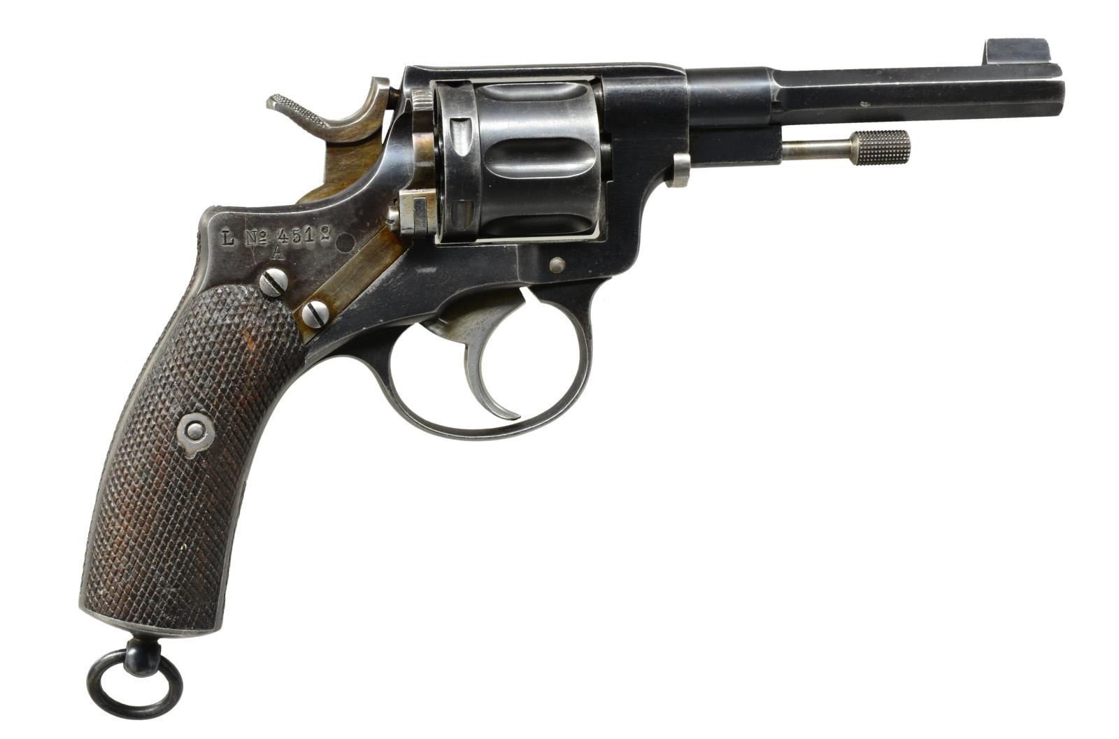 3) RUSSIAN 1895 NAGANT. Cal. 7.62 Nagant. S# NGO2723. Bbl. 4 1/2". Fixed sights. SA/DA. 7 Shot cyl. Revolver is so called "gas seal" design. Mfg. between 1895-1947. Original S# which appears "BN 315" matches on frame, cyl., & trigger guard. Import marked on right side of frame. Frame marked on left side below hammer w/ arrow in star, indicating mfg. at Tula Arsenal & dated 1941. Revolver has numerous scattered acceptance & overhaul marks. Brown checkered composite grips, inlcuding front & backstrap. Lanyard ring on butt. UNATTACHED ACCESSORIES: 7 shot accessory cyl. which accepts 32 ACP cartridges & instruction papers to change cyls. Also has cardboard storage box. CONDITION: grips in very good condition. Metal work retains 90% arsenal rework blue finish w/ very light wear & handling marks. Replacement cyl. in very good condition. Near excellent shiny bore. (21-936/RW). CURIO. $800-1,100.