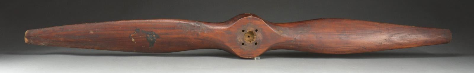 1) PROPELLER. Propeller measures 42 1/4" long. It has red painted tips. 1 Tip is stamped w/ an anchor & “US”. Decals on each side read, “Globe Corporation AIRCRAFT DESIGN JOLIET ILLNOIS”. The hub is marked, “GLOBE PART NO 33P85 MODEL 5 SENSENICH SERIAL NUMBER S4969”. Propeller has a sm. clock mounted in the center of the hub, not damaging the propeller. CONDITION: storage wear only. 2) PROPELLER. Propeller measures 48" long. A wooden propeller that appears to be handmade. It is dark stained wood. CONDITION: there appears to be a sm. glob of black paint on 1 side of the propeller, otherwise it shows light to moderate wear. (02-14423(2)/BF). 3) LARGE PROPELLER. Propeller measures 85" long. It is brass edged on the tips & lead edge. 15" Of the tip are painted a dark green brown. Decals on the right & left are a green circle flanked by gold wings. The circle reads, “SENSENICH BROS. LITITZ, PA. SB”. There is a stamp near the right tip that reads, “SENSENICH BROTHERS INSPECTED AND APPROVED NO. 3”. CONDITION: propeller shows storage wear only. (02-14425/BF). $500-800.