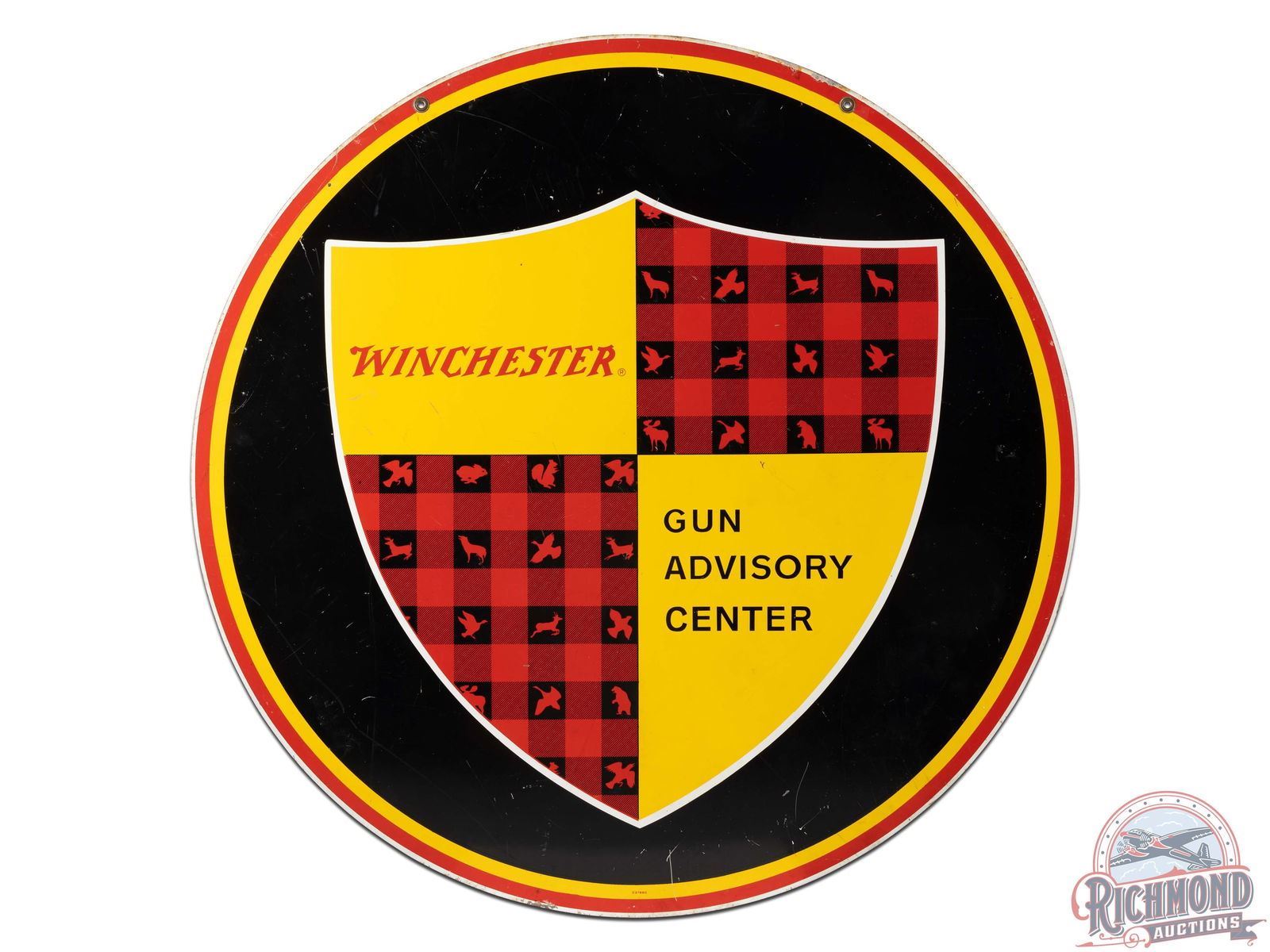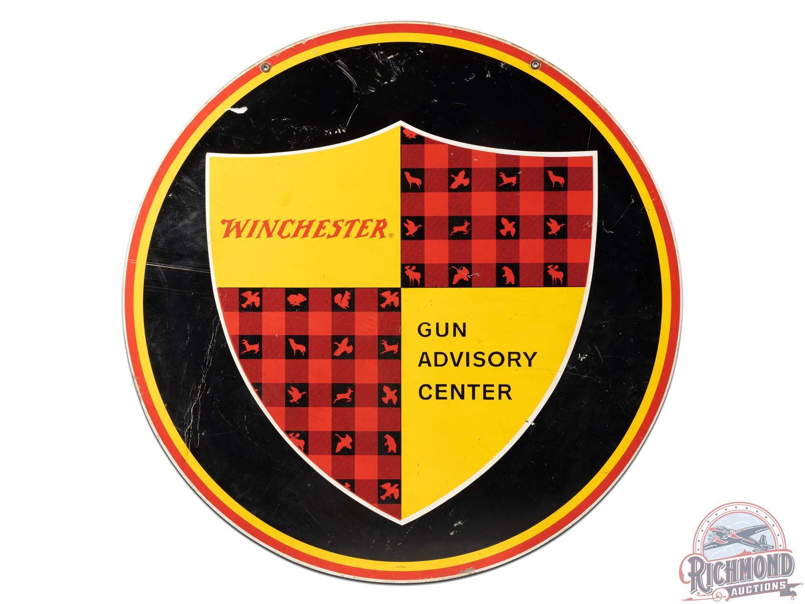 DST (double sided tin) sign has good color and shine. Iconic Winchester plaid used in the 1960's and 1970's. The sign has moderate to heavy surface wear and scratches of various depths/sizes throughout with oxidation around the edges. The top edge has some surface loss. Marked C27660 at the bottom. 38" D.