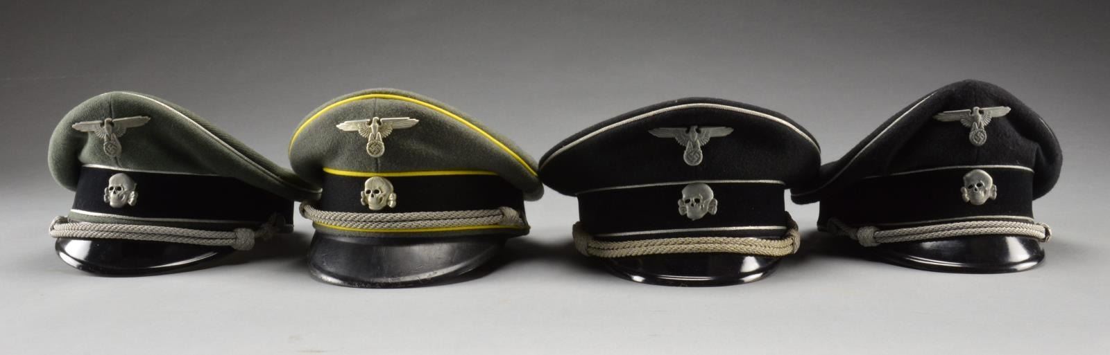 1) ALLGEMEINE SS. An officer grade hat featuring a plated gray metal skull & eagle. Black velvet band w/ black crown & silver bullion piping. Silver bullion like chinstrap w/ pebbled side buttons. Leather sweatband. No sweatshield. CONDITION: hat generally shows light wear. 2) WAFFEN SS. An officer grade hat featuring a plated gray metal skull & eagle. Black velvet band w/ a sage green crown & silver bullion piping. Silver bullion like chinstrap w/ pebbled side buttons. Leather sweatband. Sweatshield is present but printing is illegible. CONDITION: hat generally shows light wear overall. 3) ALLGEMEINE SS. An officer grade hat featuring a plated gray metal skull & eagle. Black velvet band w/ black crown & silver bullion piping. Silver bullion like chinstrap w/ pebbled side buttons. Leather sweatband. Sweatshield reads, “Alleste Berliner Uniform Mutzenfabrik Berlin-SW Wilhelmstrasse 110”. CONDITION: hat generally shows light wear. 4) WAFFEN SS SIGNALS. A low grade officer’s hat featuring aluminum skull & eagle. Black velvet band w/ a sage green crown & bright yellow piping. The yellow piping was used for about a 6 month period to denote branch of service in the Waffen SS. The colored piping was abandoned after a short period. Silver bullion like chinstrap w/ pebbled side buttons. Leather like sweatband. Sweatshield has a gold printed, “SS” in a circle. CONDITION: hat generally shows light wear overall. These hats, though showing some quality & attention to detail, are all reproductions. (02-14293-2(4)/BF). $300-500.