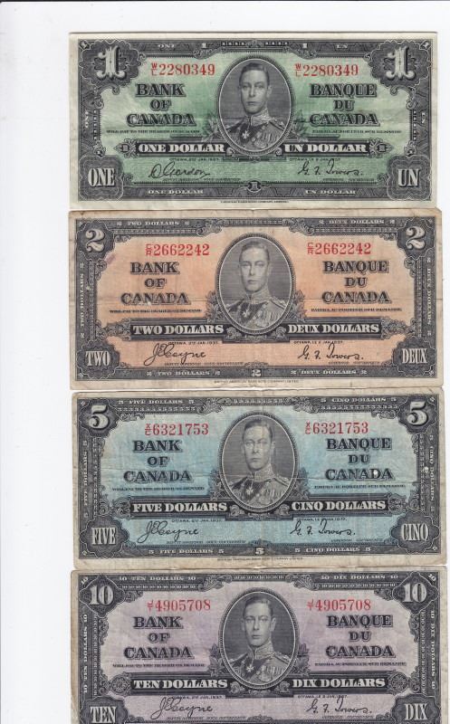 4 x Bank Of Canada 1937 Bank Notes - $1 Gordon/Towers - W/L Serial, $2 Coyne/Towers - C/R Serial, $5 Coyne/Towers - X/C Serial, $10 Coyne/Towers - J/T Serial -- All Note Book At $120