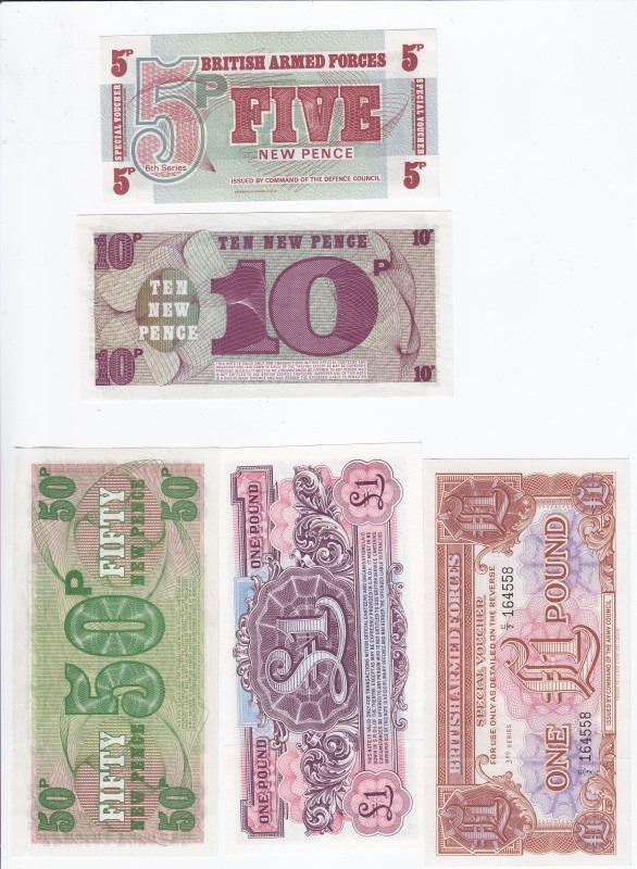 5 British Armed Forces Paper Notes - 5 Pence, 10 Pence, 50 Pence, 1 Pound & 1 Pound Special Voucher