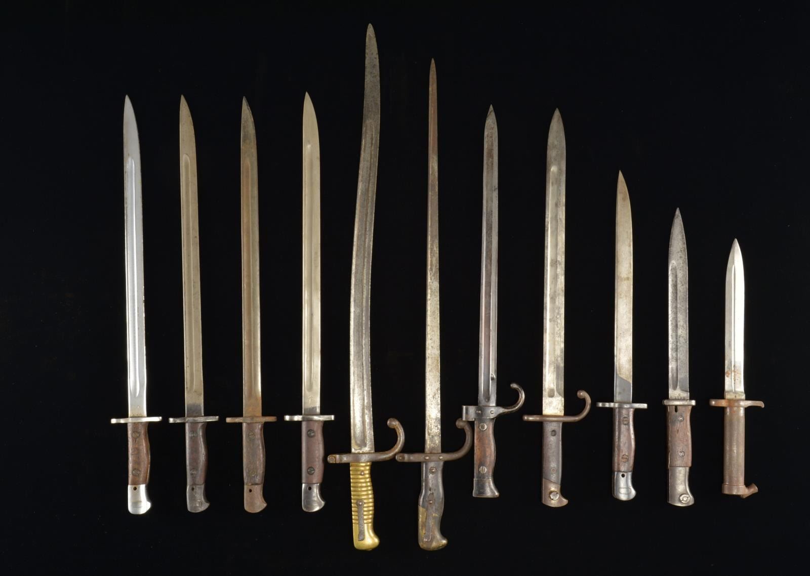 This lot of bayonets consists of 2 Czechoslovakian VZ24 bayonets, scabbards & frogs. / 2 M1866 French Chassepot bayonets & scabbards. / 6 Mauser K98 bayonets & scabbards. / 3 German Army dress bayonets, scabbards & frogs. / 3 German Army fireman bayonets, scabbards & frogs. / 1 US M1892 Krag Jorgensen bayonet & scabbard. / 1 English Pattern 1876 Martini Henry bayonet & partial scabbard. / 1 Dutch M1895 bayonet & partial scabbard. / 1 Arisaka bayonet from the Kokura arsenal, no scabbard. / 2 French 1874 Gras bayonets & scabbards. / 1 British Enfield spike bayonet & scabbard. / 1 Italian M1871 bayonet & partial scabbard. / 1 Hungarian M1895 carbine bayonet & scabbard. / 1 French 1874 Gras bayonet, no scabbard. / 6 M1871/84 German bayonets & scabbards. / 1 French M1892 Mannlicher Berthier bayonet & scabbard. / 1 Italian M1891 Carcano bayonet & scabbard. / 2 Swiss M1889/99 Schmitt Rubin bayonets & scabbards. / 2 M1896 Swedish bayonets & scabbards. / 1 British M1907 bayonet & partial scabbard. / 1 Italian M1891 Carcano bayonet, no scabbard. / 1 Swiss M1896 bayonet, no scabbard. / 5 British M1907 bayonets, no scabbards. / 2 CZ M1924-30 bayonets & scabbards. / 1 British India Pattern No. 1 MK2 bayonet, no scabbard. / 1 British P1888 bayonet, no scabbard. / 1 Remington M1895 long bayonet, no scabbard. / 3 Metal European bayonet scabbards. CONDITION: bayonets generally show light to moderate wear except as noted. (02-14498/BF). $1,500-2,000.