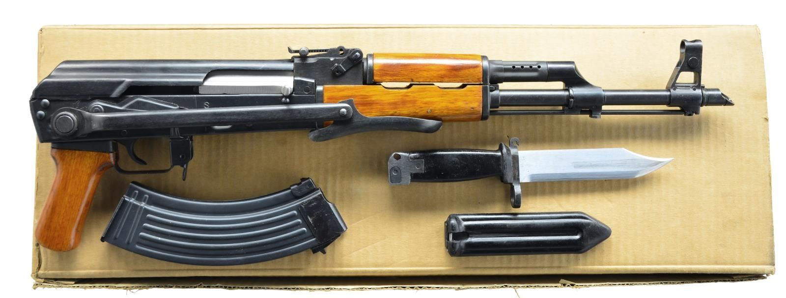 FOLDER. Cal. 7.62x39. S# 523550. Bbl. 16 1/2". The ultimate in 1980s gun culture were the Norinco plant AK47 variants that were once so plentiful & inexpensive. As their popularity increased in the United States w/ shooters & collectors & the availability of the once rare 7.62x39mm ammunition became plentiful & inexpensive, we were faced w/ the first of numerous pieces of legislation dealing w/ the propaganda push of the day & firearms w/ similar attributes were branded “assault weapons” & eventually heavily restricted. One of the first restrictions to go into effect was mandated by executive order w/ out legislative involvement & banned the importation of guns that didn’t qualify as having a sporting purpose. The Norinco type 56 rifle, such as this, was one of the first & most impacted examples. Fortunately, this one was imported prior to these draconian measures & is available today. One of the most noticeable features is the bottom folding metal stock that was designed to completely fold over & around a loaded 30 rd. mag. This particular example is a textbook piece w/ its orange tinted wood furniture, still in factory packaging as it left China. Stamped receiver. Hooded front sight post & rear sight adj. in elevation to 800m. Safety selector on right side of receiver. Complete w/ its bayonet, scabbard, threaded bbl., & slanted muzzle brake. MAGS: 3-30 rd. factory. UNATTACHED ACCESSORIES: factory box & all components as shipped from Norinco. CONDITION: all outward appearances indicate that this particular example has been removed from its factory packaging only for display & occasional light fondling, as we received it in its original styrofoam lined cardboard box. All factory provided components are still nestled in their proper place. Finish coverage is complete w/ only thinning between stock & receiver, which can’t be avoided once extended & collapsed. Bore is shiny w/ very strong rifling. Fire control mechanism appears to function correctly when cycled by hand. (21-568/JZ). MODERN. $800-1,200.