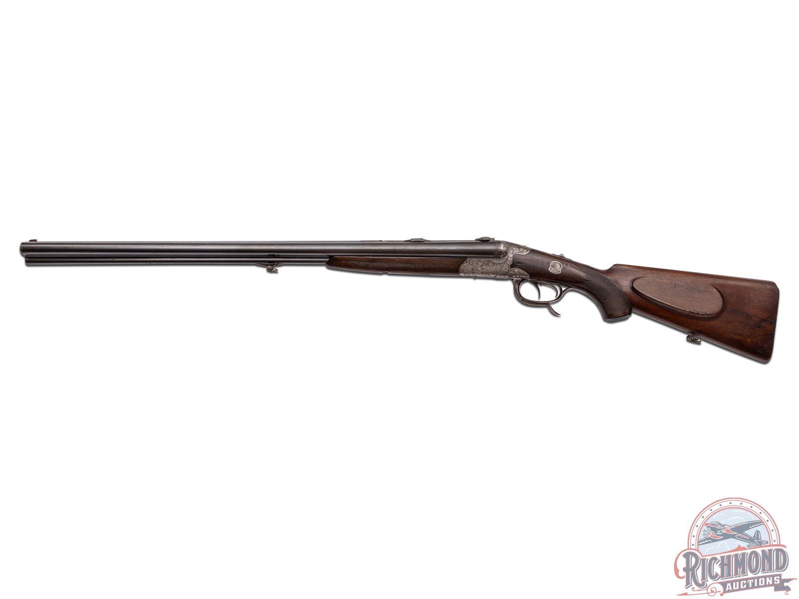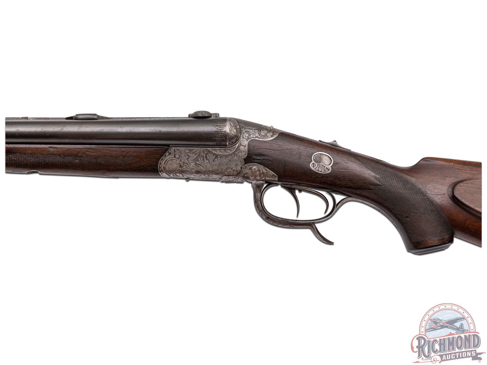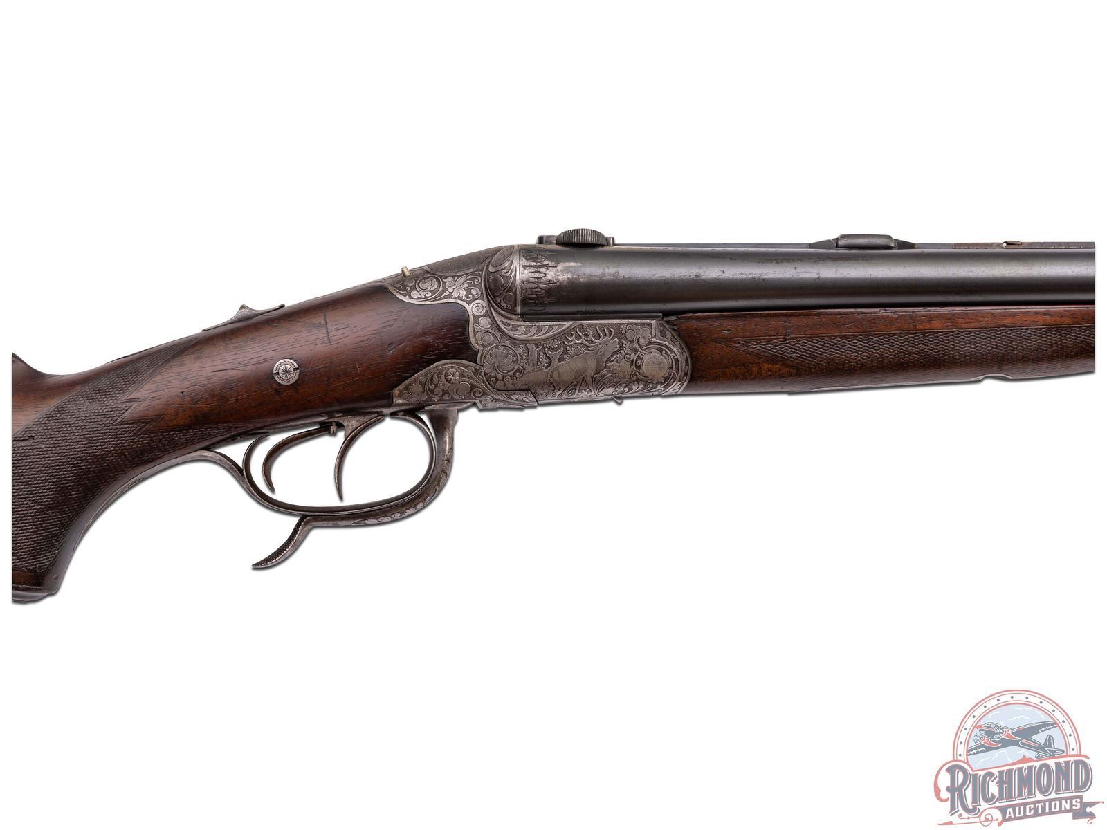 Manufactured in the 1920's in Germany by Adolf Loesche. Features blued Nitro proofed 26-3/4" Krupp steel barrels with 16 Gauge side by side shotgun over 9x72R caliber rifle. Barrels have raised matted rib with rifle sights and "Waffen Loesche, Magdeburg" marked on right barrel and "Hanover-Berlin" on left. Barrels feature extractors, dolls head rib extension and claw scope bases. Rounded coin finish underlever and game scene engraved action with tang barrel selector and Greener style safety. Action has double triggers with front being a set with steel opening lever. Walnut checkered pistol grip stock with right hand cheekpiece. Fitted with a horn butt plate and grip cap. Matching walnut checkered splinter forearm with latch release. LOP: 14". DAC: 1-1/2". DAH: 2-1/4". CALIBER: 16x16 / 9x72R. S/N: NA. FFL STATUS: Curio & Relic.