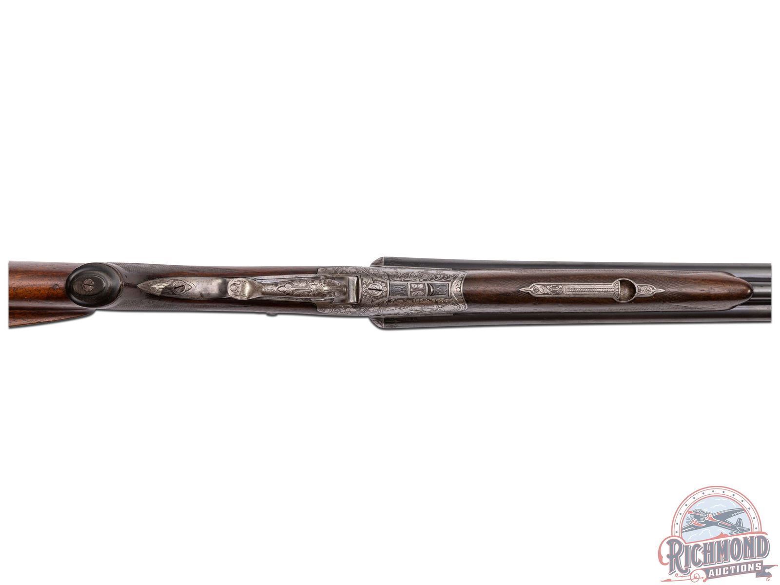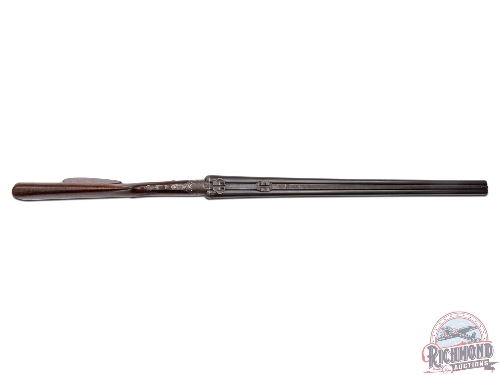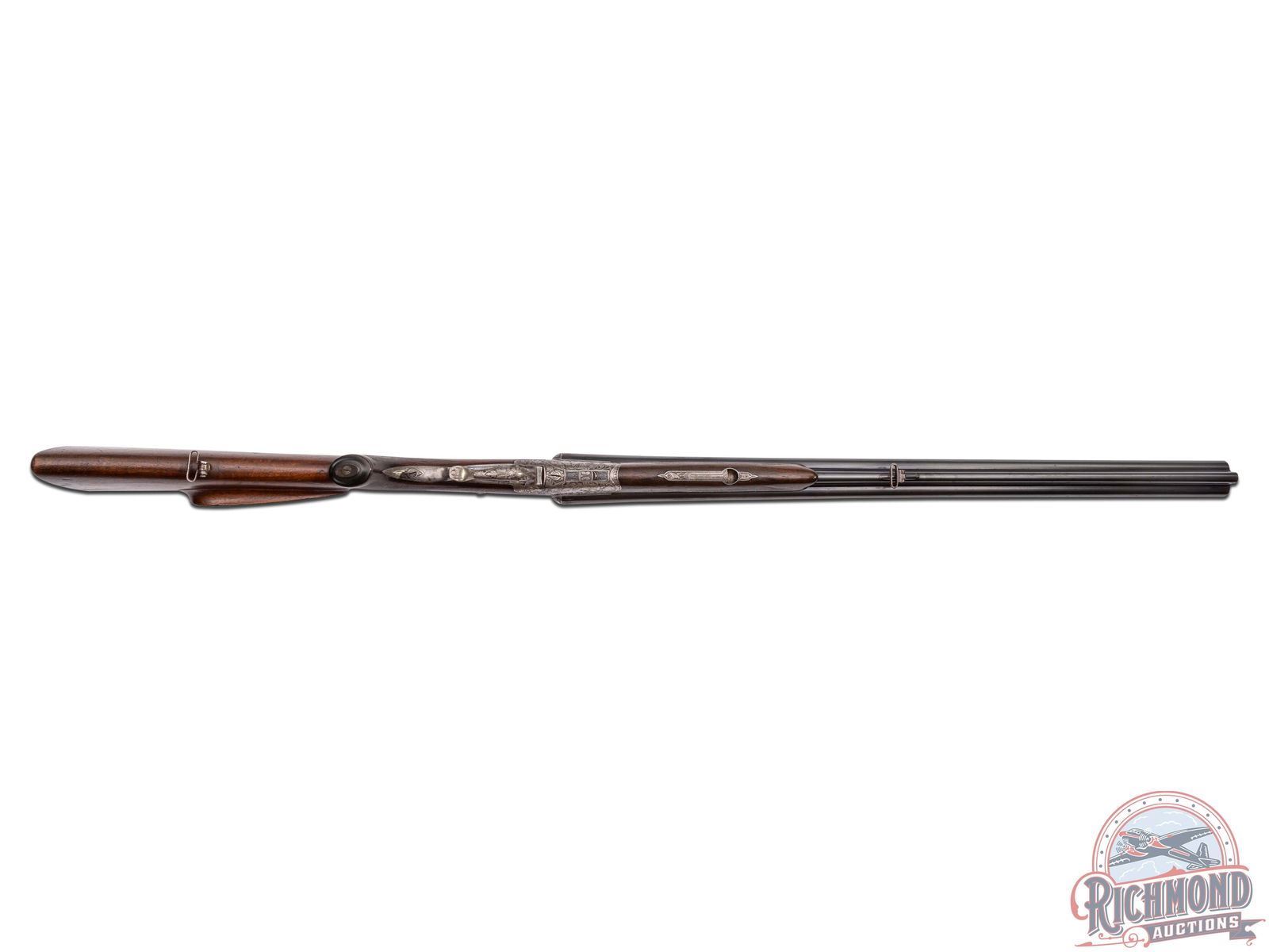 Manufactured in the 1920's in Germany by Adolf Loesche. Features blued Nitro proofed 26-3/4" Krupp steel barrels with 16 Gauge side by side shotgun over 9x72R caliber rifle. Barrels have raised matted rib with rifle sights and "Waffen Loesche, Magdeburg" marked on right barrel and "Hanover-Berlin" on left. Barrels feature extractors, dolls head rib extension and claw scope bases. Rounded coin finish underlever and game scene engraved action with tang barrel selector and Greener style safety. Action has double triggers with front being a set with steel opening lever. Walnut checkered pistol grip stock with right hand cheekpiece. Fitted with a horn butt plate and grip cap. Matching walnut checkered splinter forearm with latch release. LOP: 14". DAC: 1-1/2". DAH: 2-1/4". CALIBER: 16x16 / 9x72R. S/N: NA. FFL STATUS: Curio & Relic.