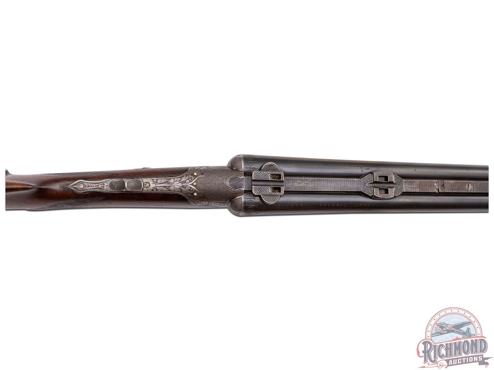 Retains 60% original finish with fading blue with handling areas turning to a silvery patina. Action worn to a dull silver tone. Stock has traces of original finish with heavy field marks and worn checkering. Work done to rear sight. Good bores with good mechanics except trigger does not set and needs adjustment.