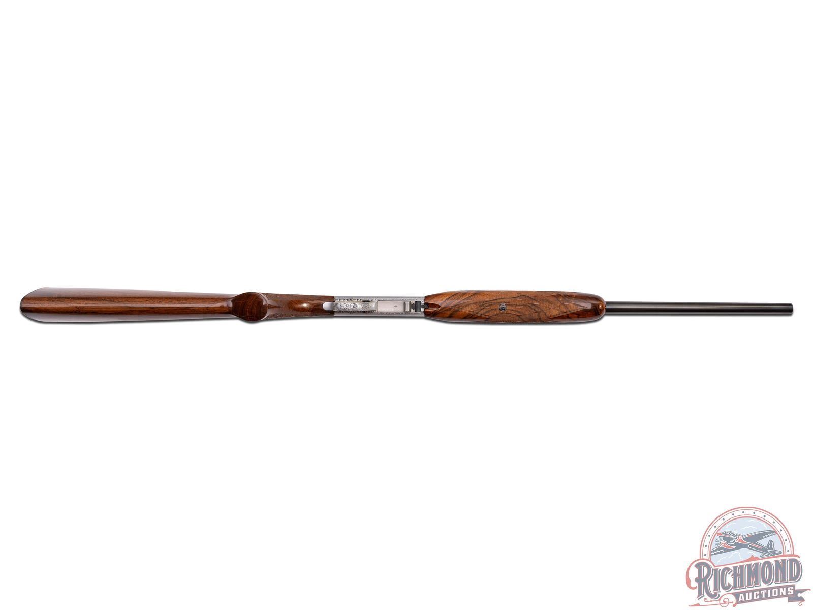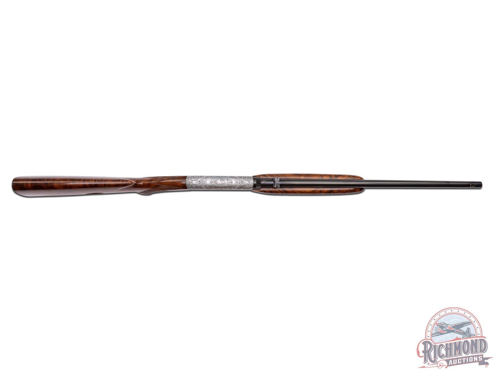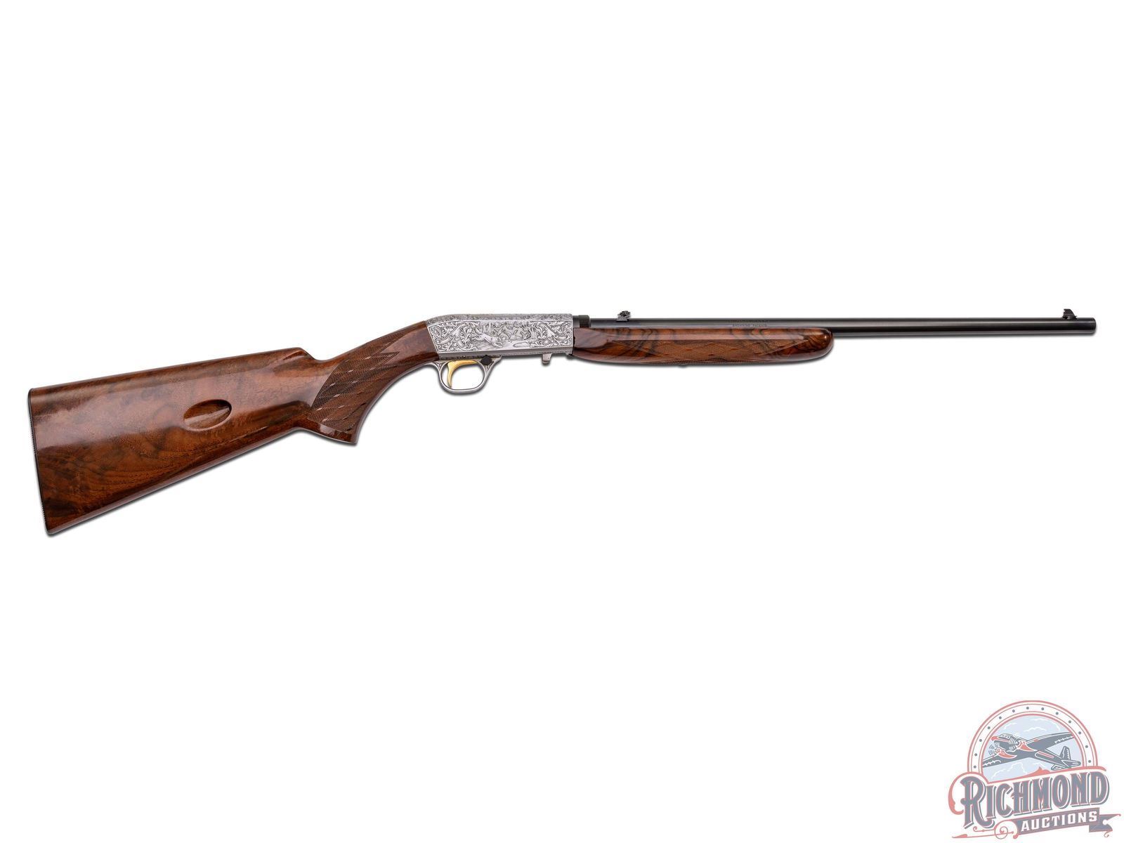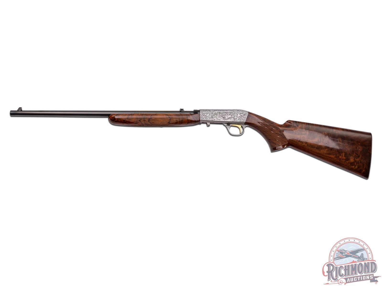 Made in Belgium by Browning in 1973. 19-1/4" blued round takedown barrel in 22 Long Rifle caliber with bead pedestal front sight and rear flip sight with factory plugged scope mounting holes. Satin finish full coverage semi-automatic action with heavy chisel dog and bird scene on left with "A. Marachal" signature. Right side depicts a dog flushing a duck with floral border. Action has a gold washed trigger and push button safety. Figured skip-line checkered pistol grip stock with blued serrated butt plate with correct loading tube. Matching walnut skip-line checkered forearm. LOP: 13-3/4". DAC: 1-3/16". DAH: 2-5/8". CALIBER: 22LR. S/N: 73T71515. FFL STATUS: Curio & Relic.