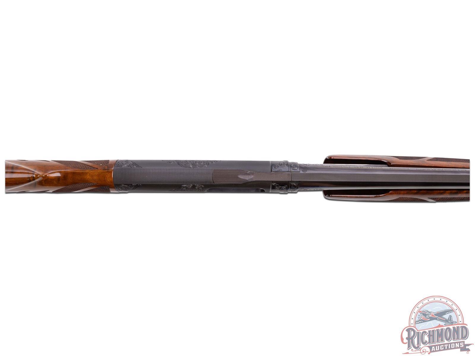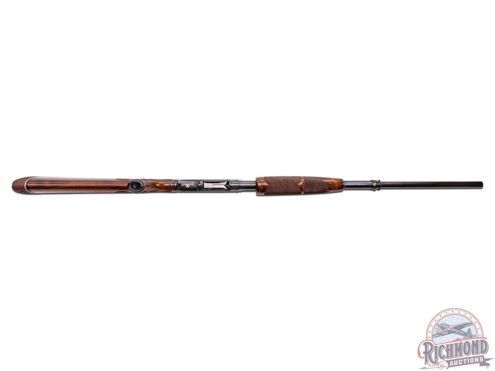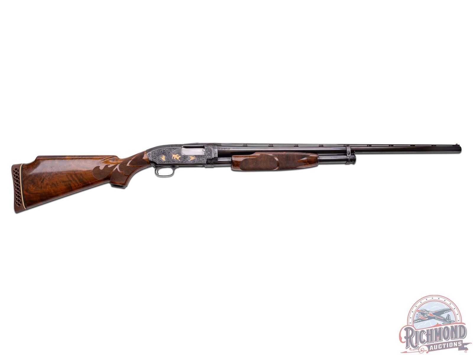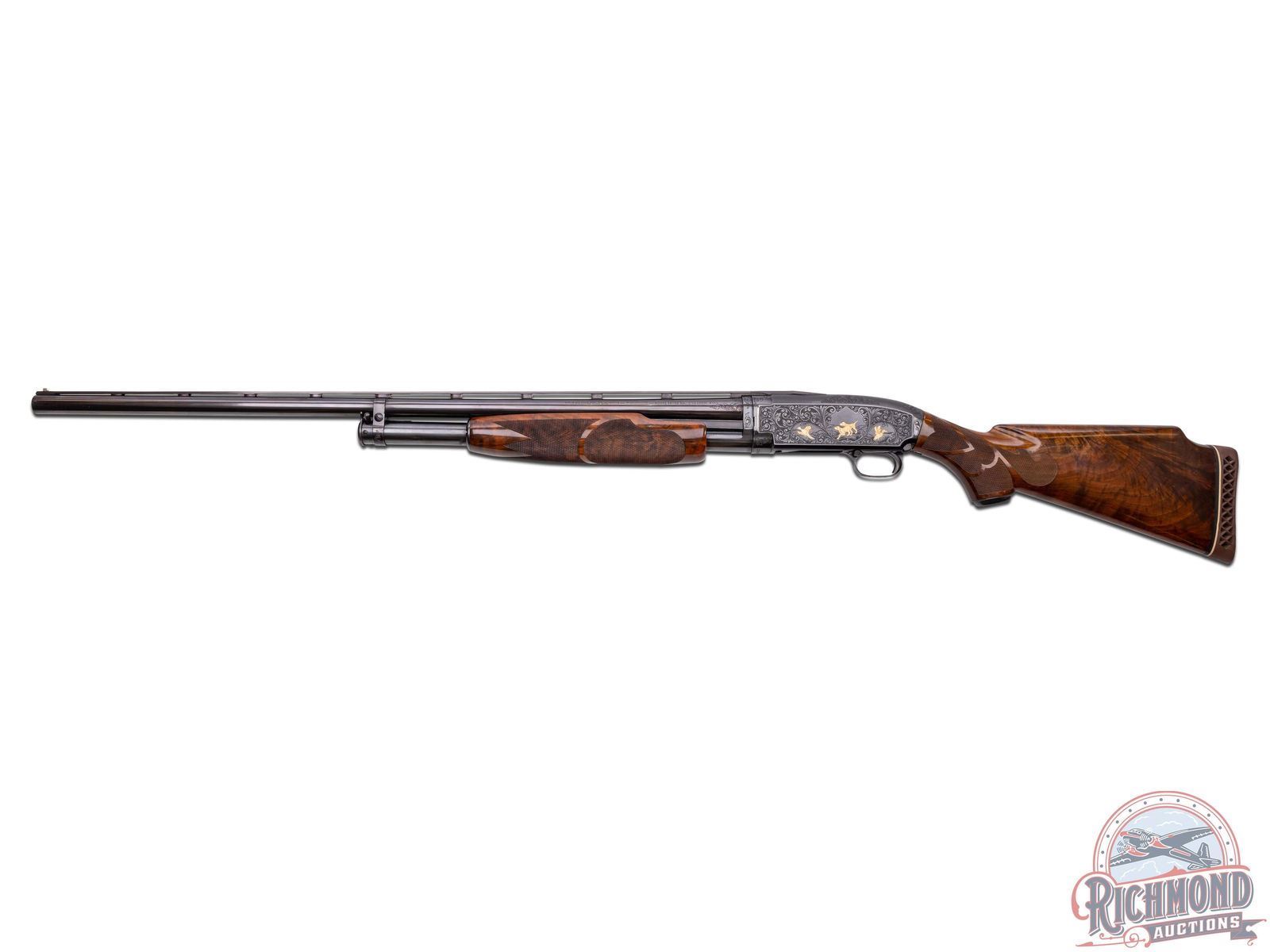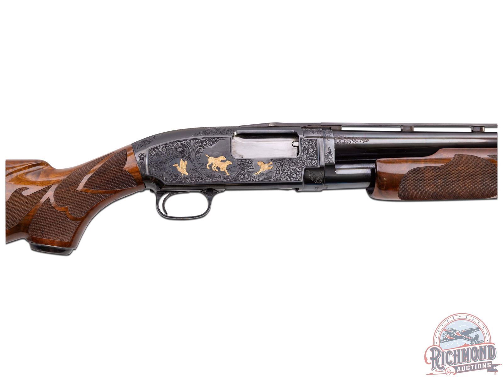 Manufactured in 1949. This beautiful shotgun features a 30" blued ventilated rib barrel with white bead front sight. Chambered for 2-3/4" shells with Full choke. Engraved floral scroll pattern on both sides of the barrel extends 1-1/2" from the action. Matching serial numbers on barrel and receiver. Both sides feature a triple game scene with two gold inlaid dogs in a field scene in the center, with a gold inlaid pheasant to the front and gold inlaid duck in flight to the rear, all surrounded by a floral scroll design. Signed "N.Hartliep" on the left side below the pheasant. Top of the matte finished receiver features matching floral scroll designs with punch dot background on each side. Gold inlaid game bird in flight on the bottom of the trigger guard and magazine band with floral scroll. Nice feather crotch walnut pistol grip stock with checkering on grip and fitted with a blued metal cap. Matching forearm with checkering. Fitted with a brown ventilated recoil pad. LOP: 14-1/2". DAC: 1-1/2". DAH: 2-1/4". CALIBER: 12 GA. S/N: 1247690. FFL STATUS: Curio & Relic.