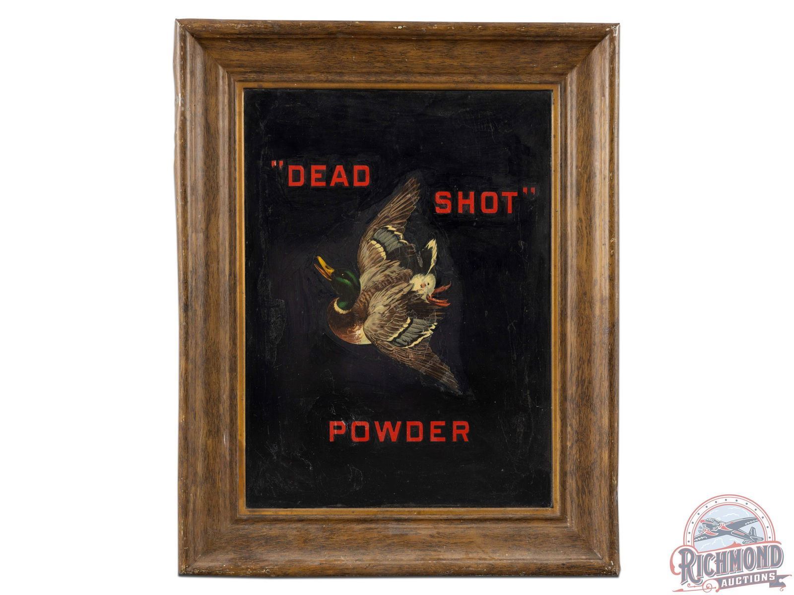 Single sided self-framed tin sign featuring the classic American Powder Mills falling mallard. Faux wood grain tin frame surrounds the graphic and text. Exhibits good color and shine with general age related storage wear. The mallard has light flaking and spots of residue while the black areas have an older repaint throughout. The outer self-framed edges have oxidation and general wear. Overall, a unique piece with great eye appeal. 19.5" H x 15.5" W.