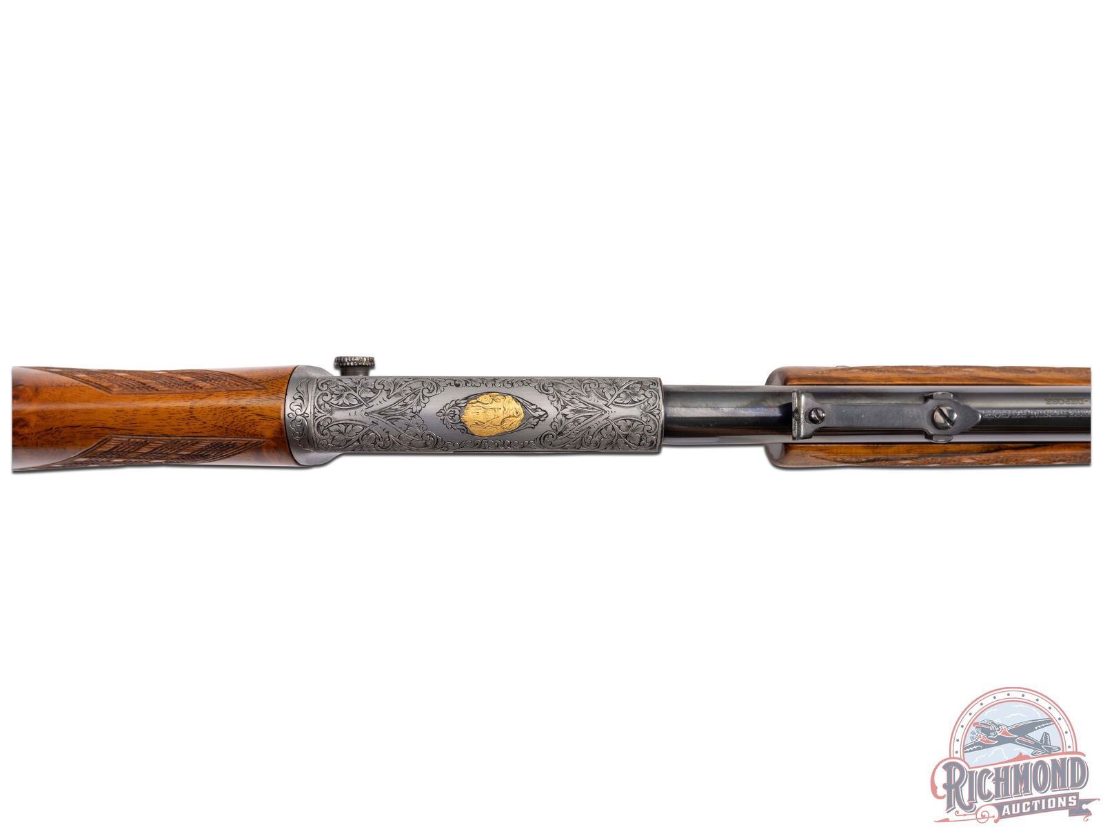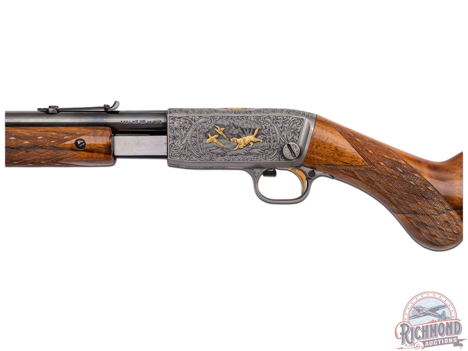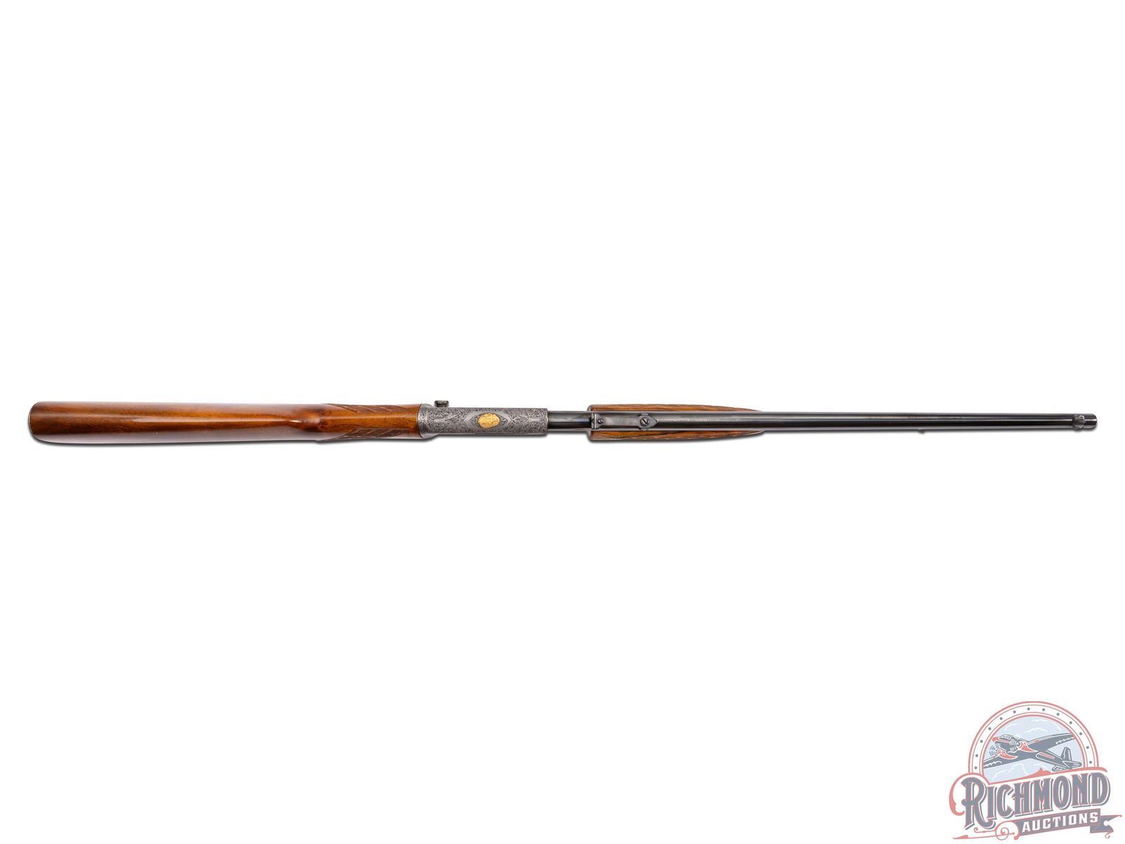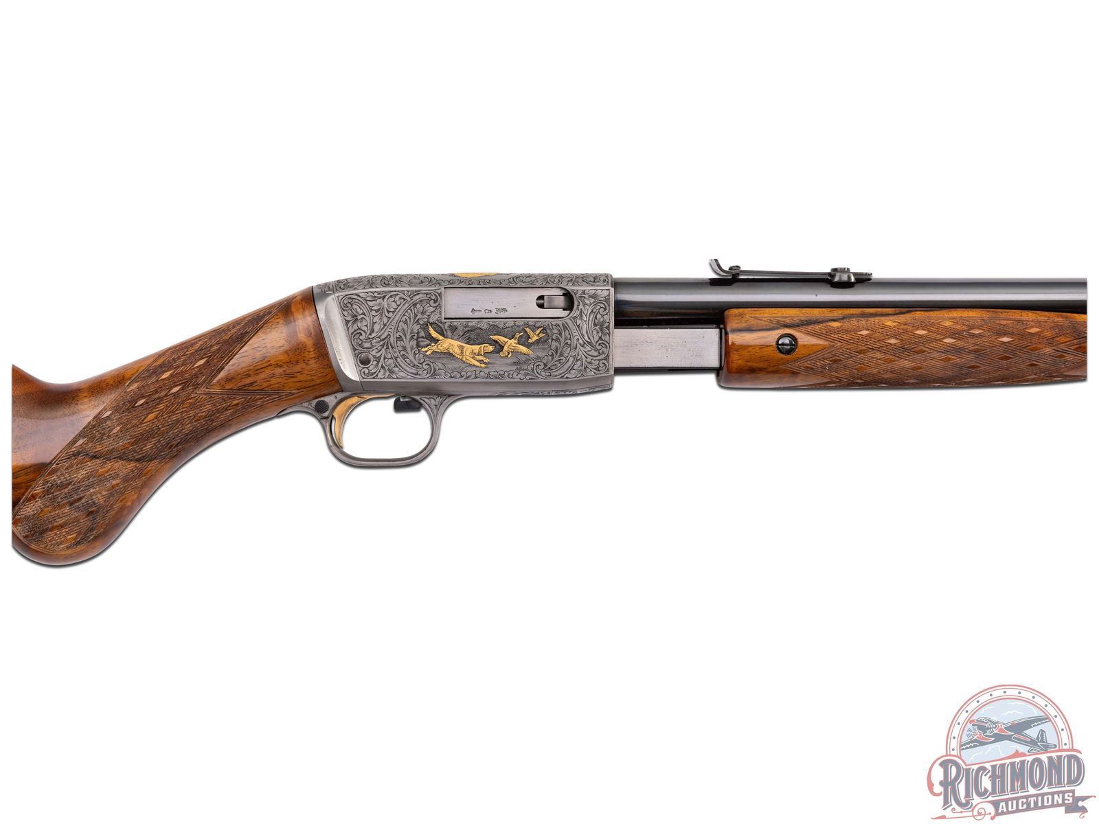 Made in Herstal, Belgium by Browning in 1926 for export and upgraded (possibly at a custom shop) at an unknown time by Master Gunsmith Angelo Bee. Rifle to be pictured in up and coming Angelo Bee Engraving Book. 22" blued round fluid steel barrel in 22 Long caliber with "Browning Patent Depose" export address at F.N. with bead pedestal front sight and stamped steel rear sight. Barrel is marked at breech with Belgium proofs. Satin finished takedown frame with blued tubular magazine. Action has full coverage floral engraving done in a style similar to Grade III with setter flushing ducks on right, dog with bird scene on top, and setter flushing pheasants on left. Action has gold washed trigger with blued push button safety and slide release. Dogs and bird are done in gold with right side scene signed in corner "A.Bee". Light tone figured walnut stock with round knob pistol grip and skip-line checkered tapered forend. Possibly done as an upgrade by Angelo Bee or in the custom shop when he worked for Browning. An extremely rare and beautiful example of gunmaking. LOP: 13-1/2". DAC: 1-3/4". DAH: 2-3/4". CALIBER: 22L. S/N: 17337. FFL STATUS: Curio & Relic.