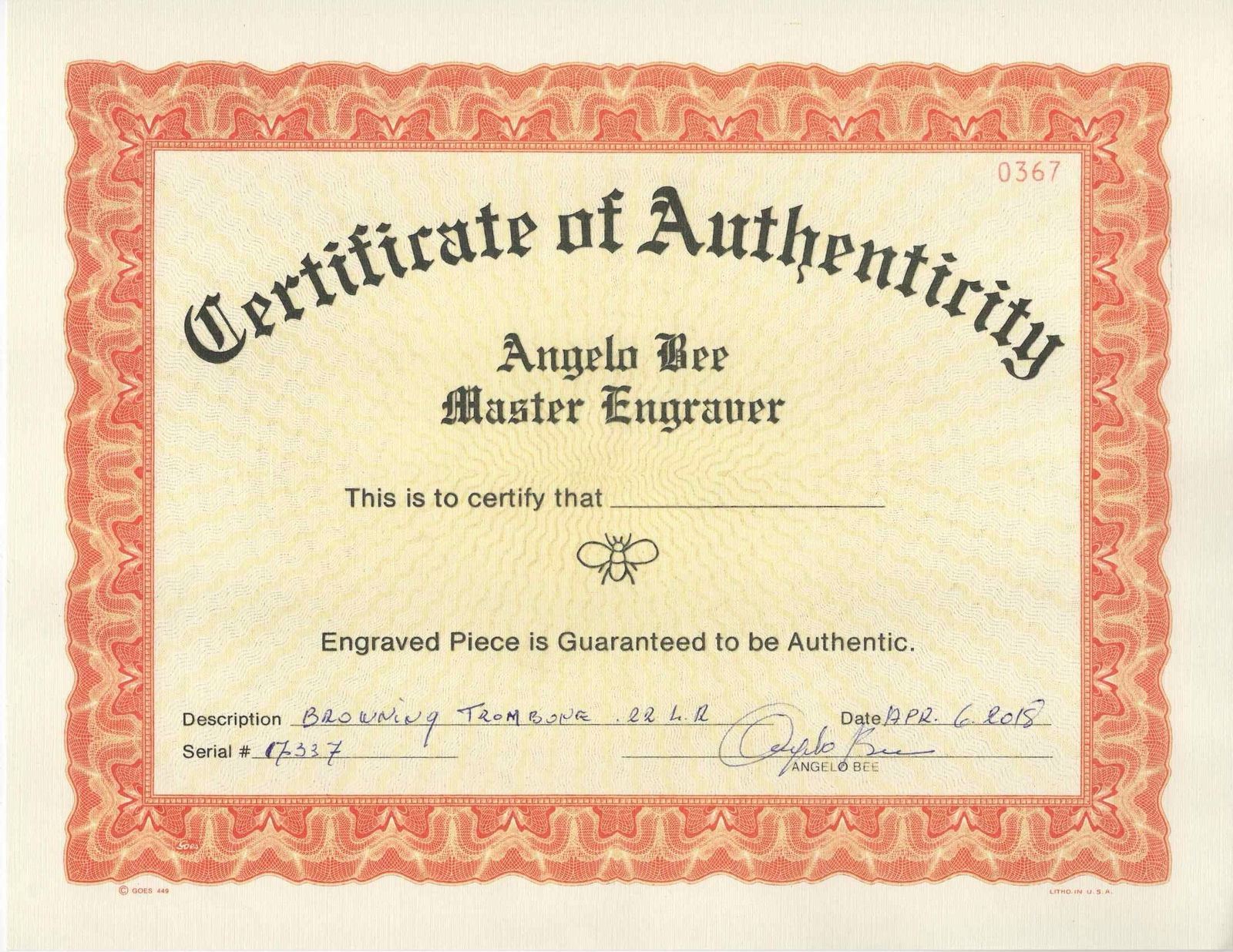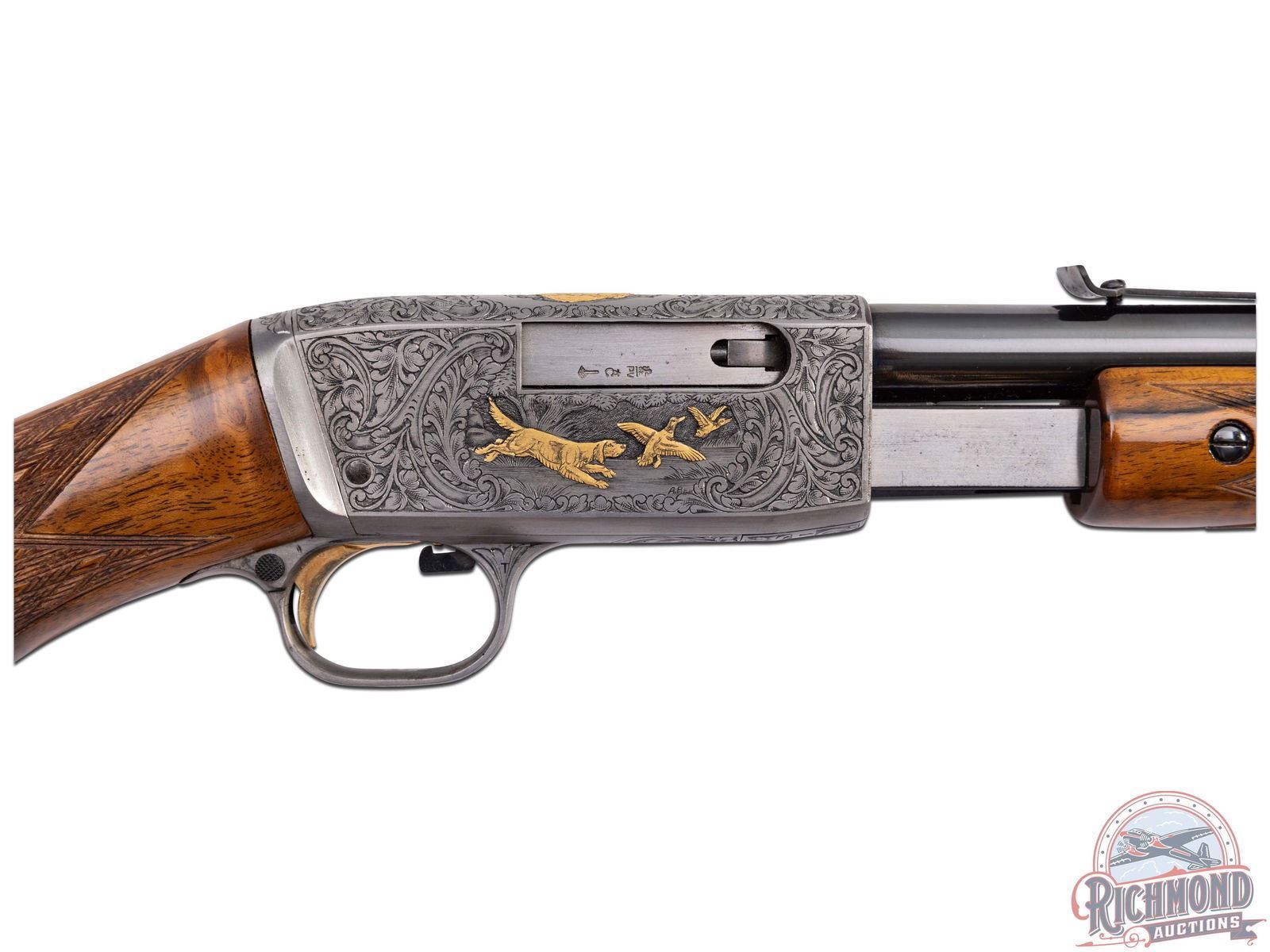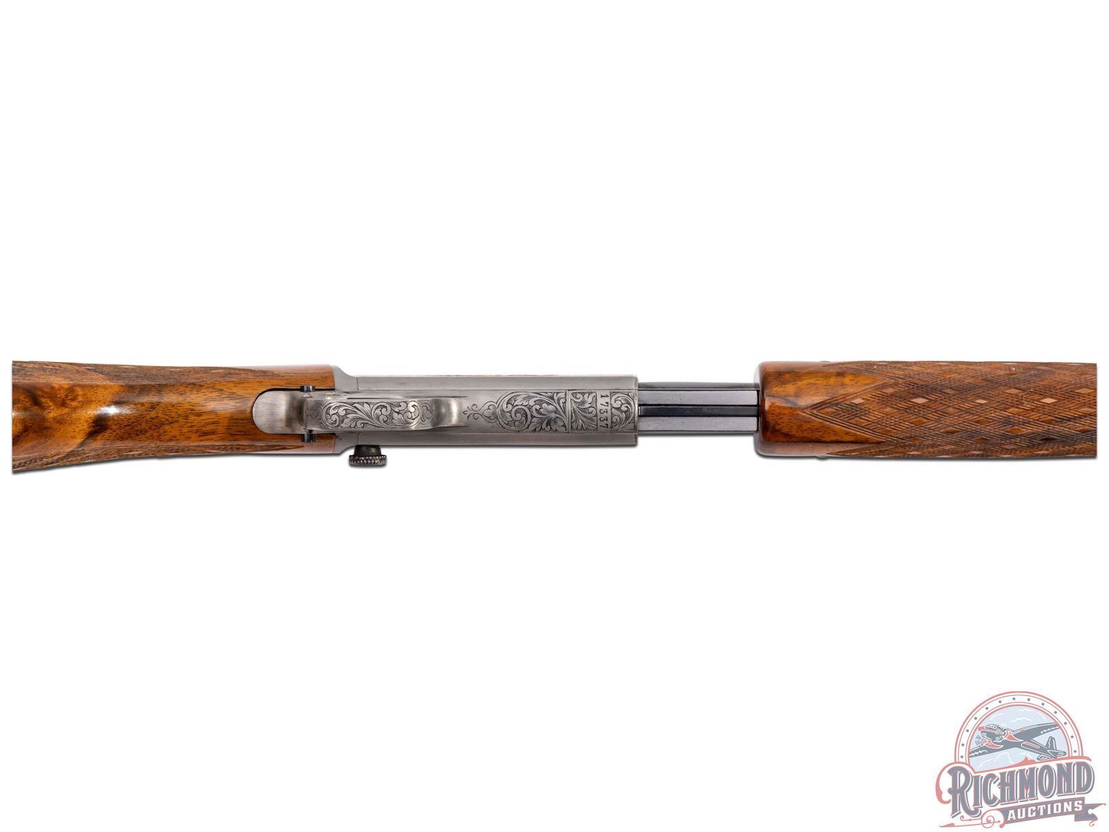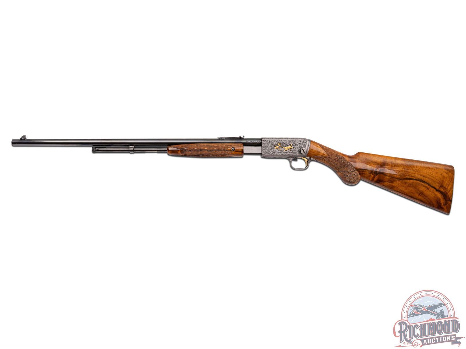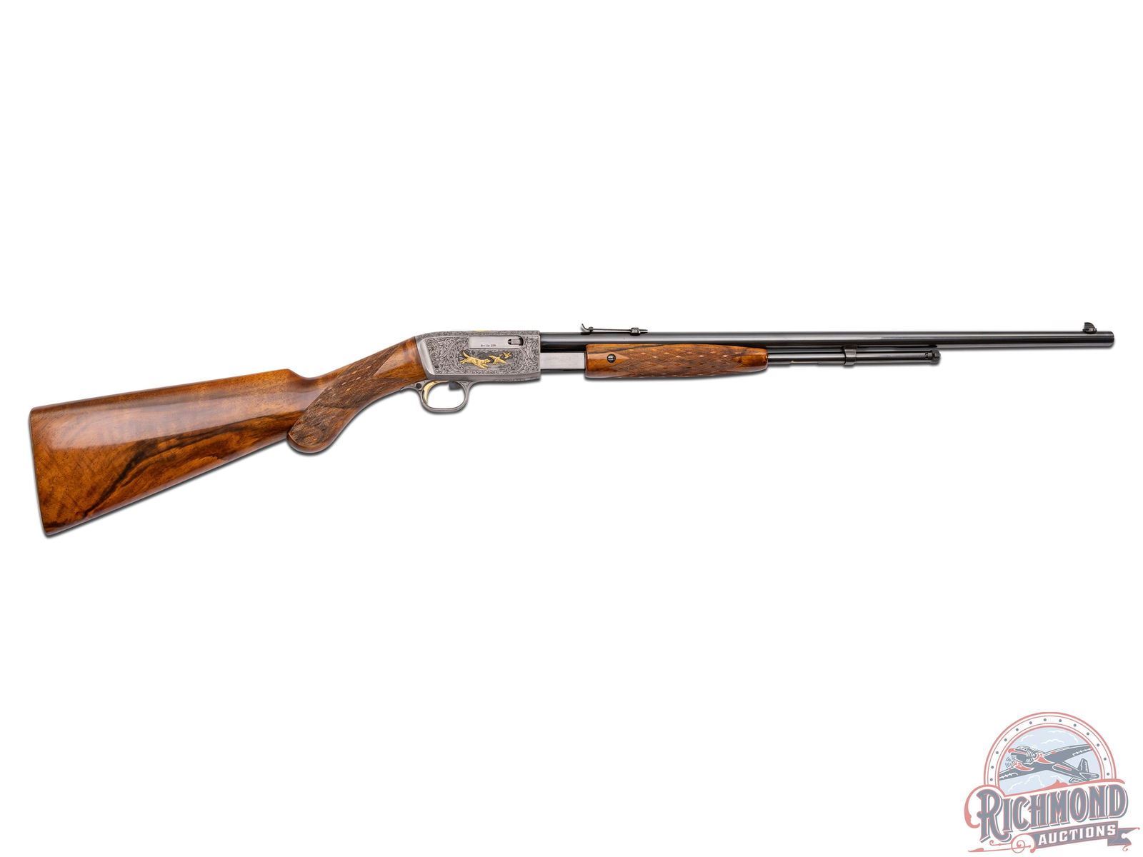 Made in Herstal, Belgium by Browning in 1926 for export and upgraded (possibly at a custom shop) at an unknown time by Master Gunsmith Angelo Bee. Rifle to be pictured in up and coming Angelo Bee Engraving Book. 22" blued round fluid steel barrel in 22 Long caliber with "Browning Patent Depose" export address at F.N. with bead pedestal front sight and stamped steel rear sight. Barrel is marked at breech with Belgium proofs. Satin finished takedown frame with blued tubular magazine. Action has full coverage floral engraving done in a style similar to Grade III with setter flushing ducks on right, dog with bird scene on top, and setter flushing pheasants on left. Action has gold washed trigger with blued push button safety and slide release. Dogs and bird are done in gold with right side scene signed in corner "A.Bee". Light tone figured walnut stock with round knob pistol grip and skip-line checkered tapered forend. Possibly done as an upgrade by Angelo Bee or in the custom shop when he worked for Browning. An extremely rare and beautiful example of gunmaking. LOP: 13-1/2". DAC: 1-3/4". DAH: 2-3/4". CALIBER: 22L. S/N: 17337. FFL STATUS: Curio & Relic.