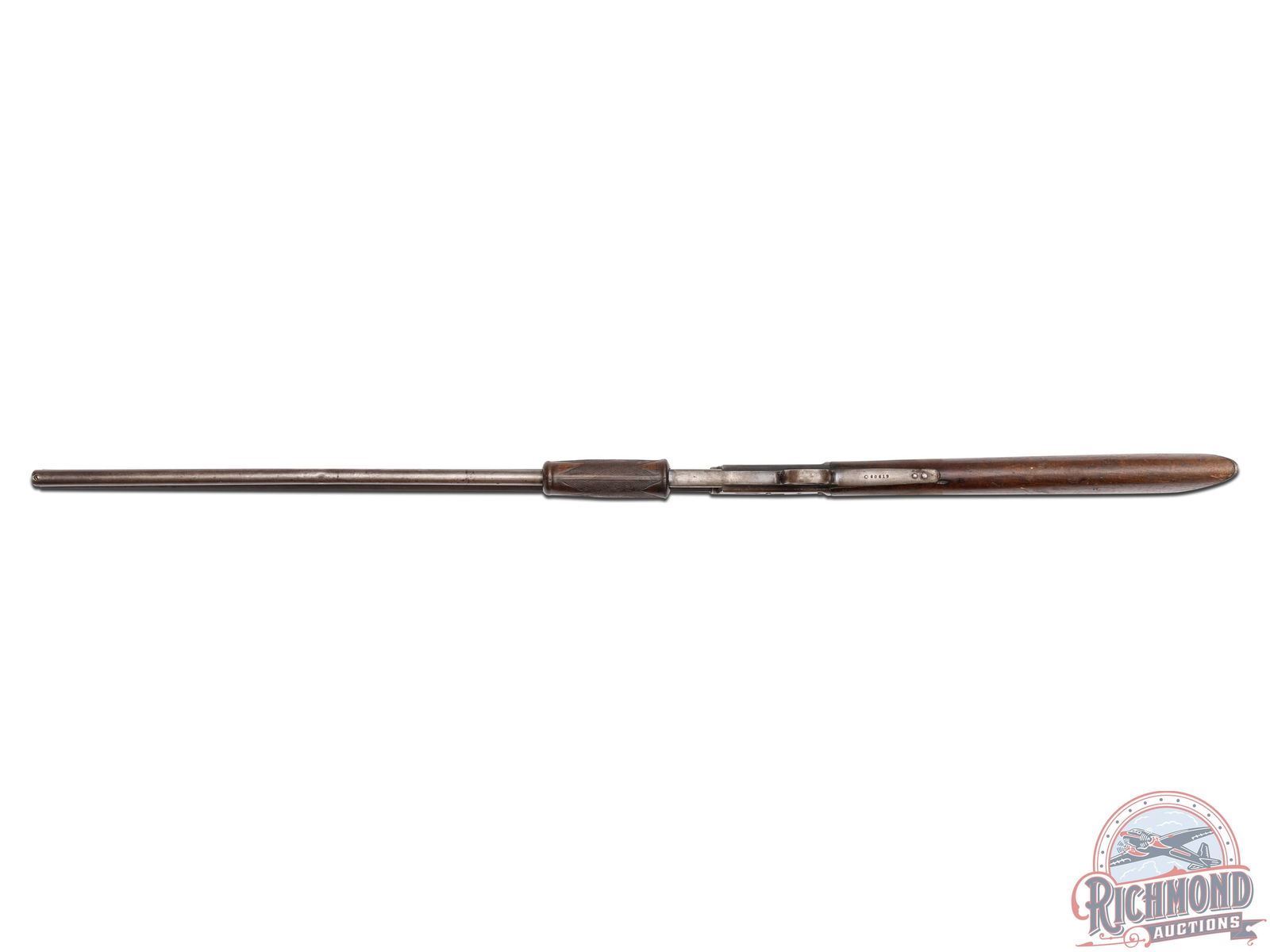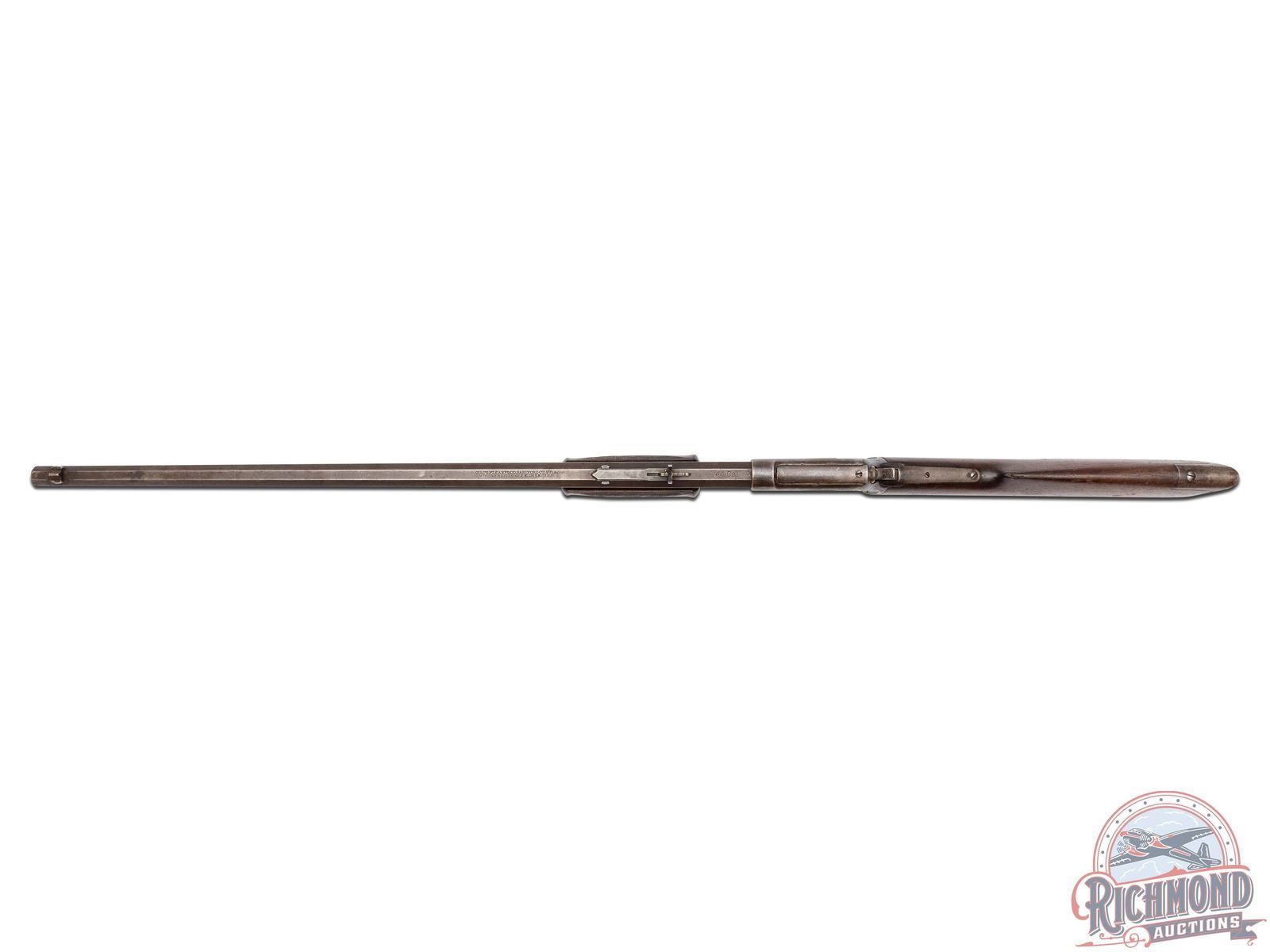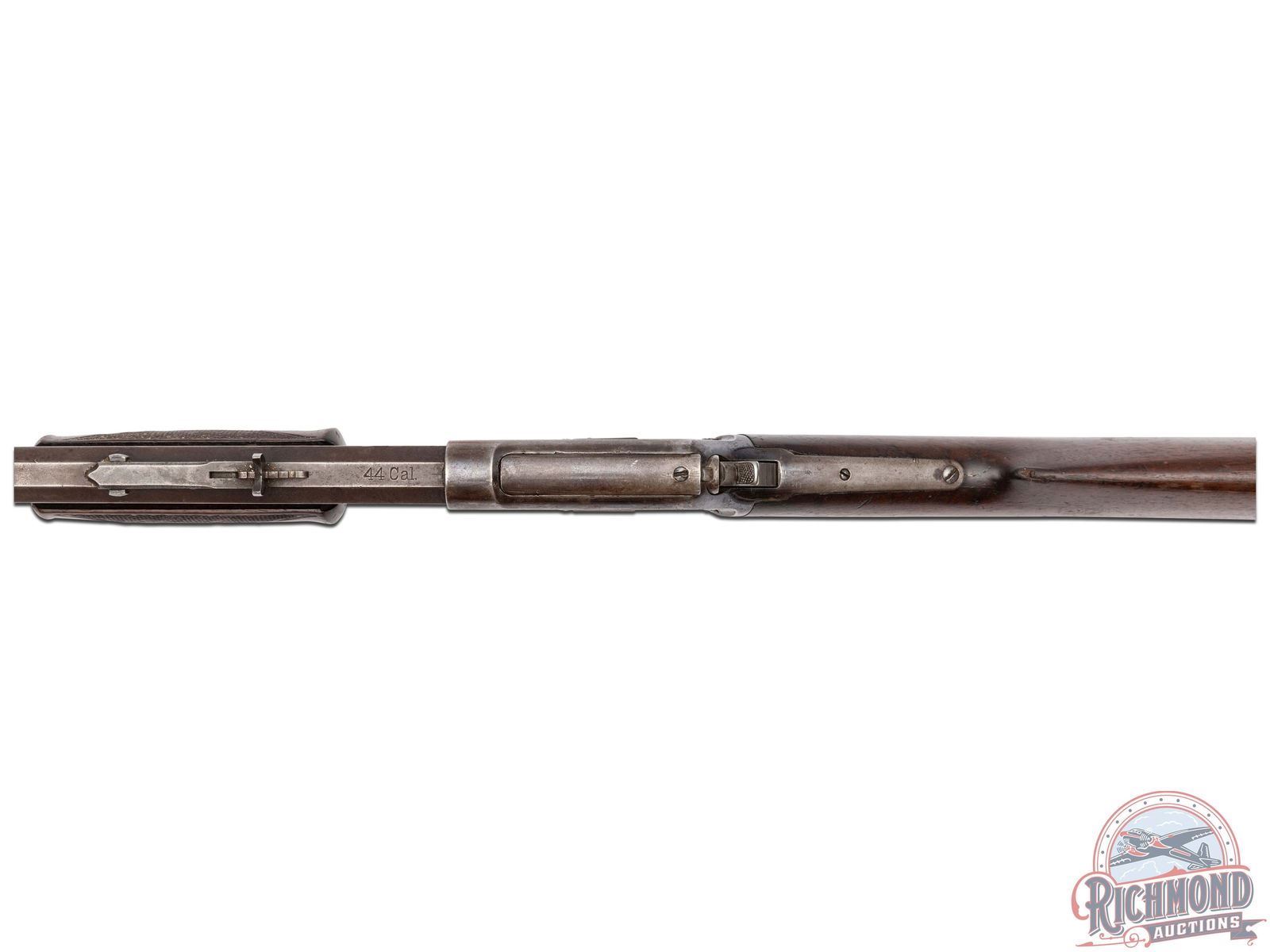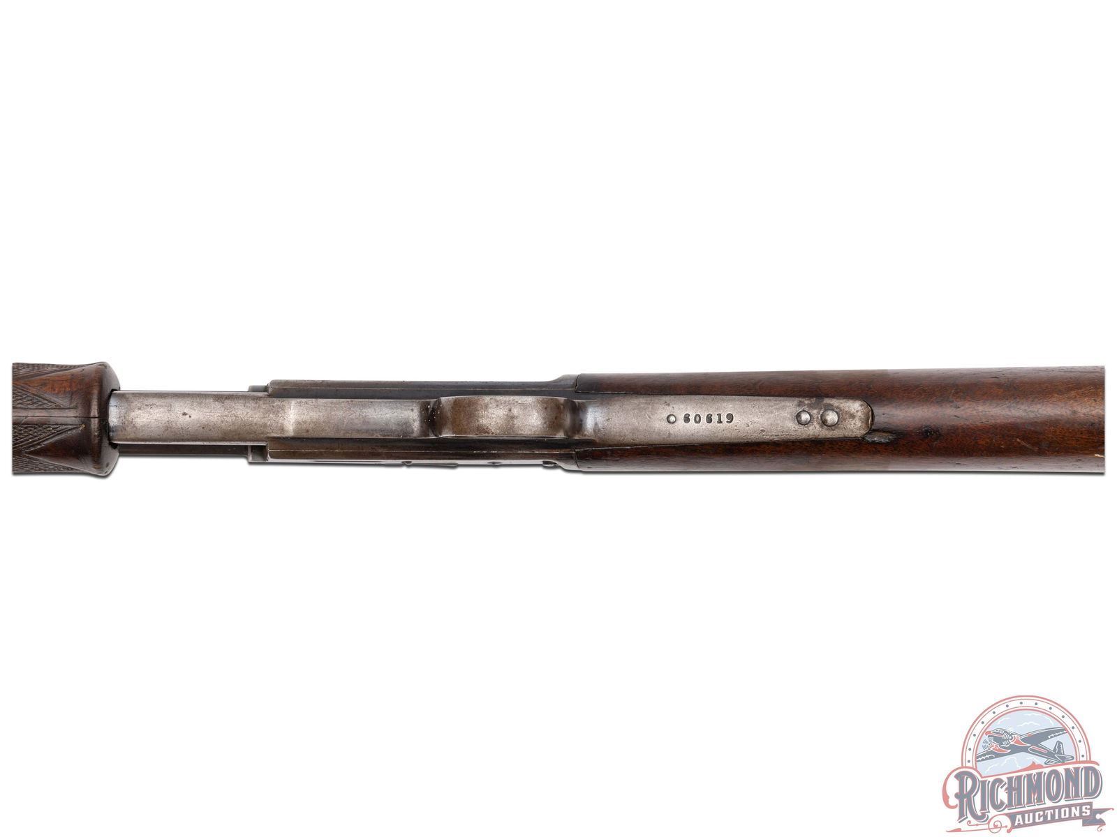 Manufactured in 1891. Features a 26" octagon barrel with period correct rear semi-buckhorn notch sight and blade front. Correct barrel stampings with Colt two-line address and patent dates. Side loading gate with a 15 round full length magazine tube. Blued action with Rampant Colt logo engraved on the left side. Walnut straight grip stock with crescent metal butt plate. Walnut checkered forearm. LOP: 13-1/8". CALIBER: 44-40. S/N: 60619. FFL STATUS: Antique.