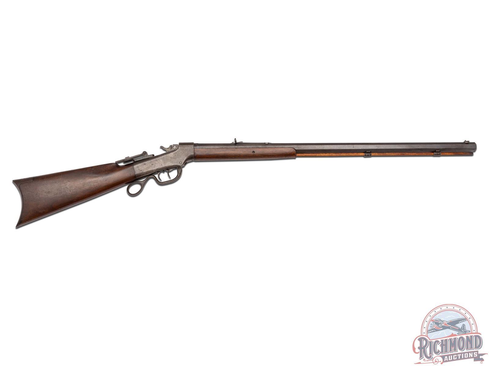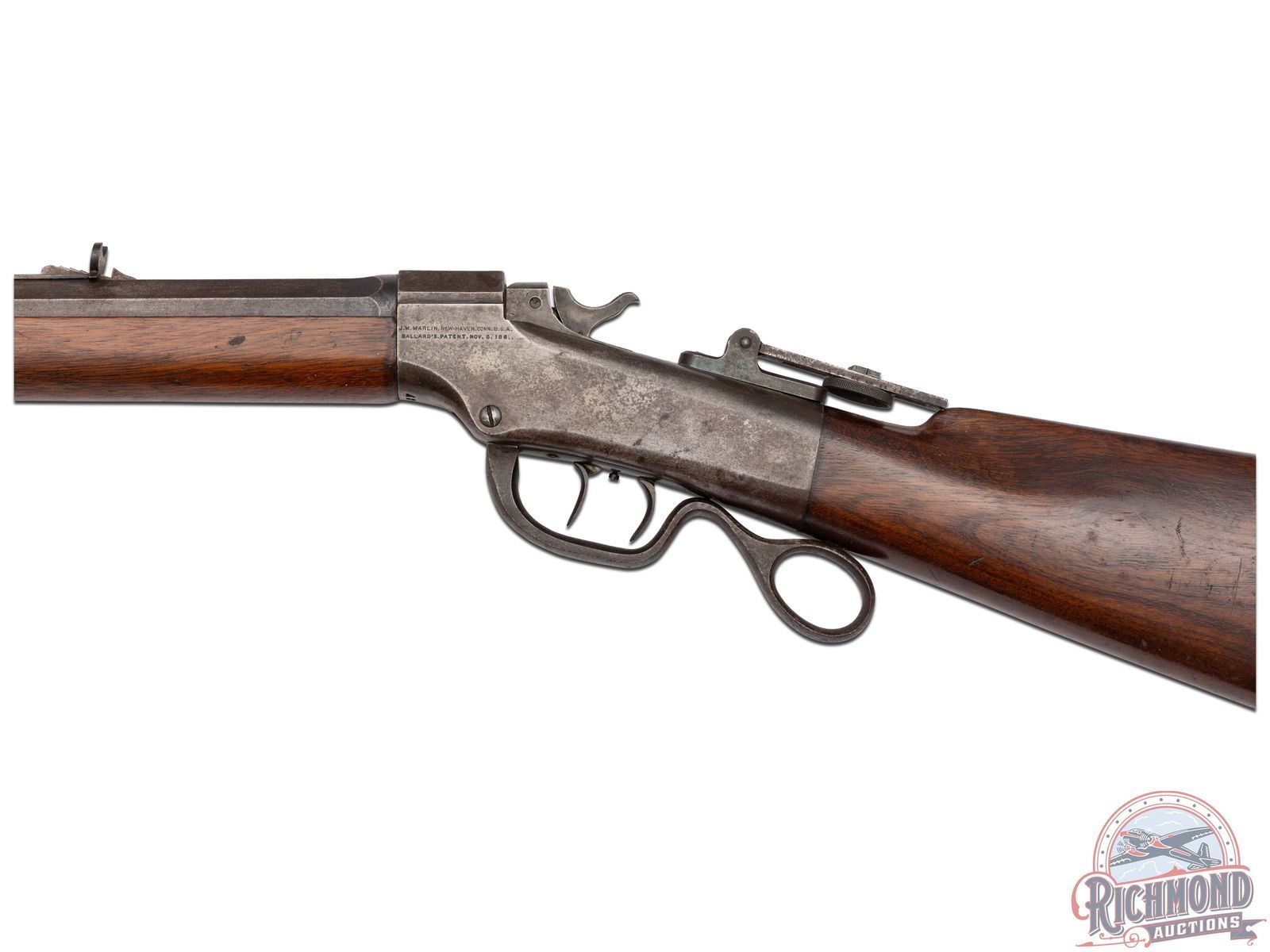 Made by the J.M. Marlin Company in 1890. Blued 30" octagon barrel with Beech front sight and Rocky Mountain rear adjustable sight in 38-55 caliber. Comes with under barrel mounted hardwood ramrod. Case-hardened Marlin two address marked action with factory double set triggers and ring loop lever. Tang has Ballard Vernier sight. Walnut plain standard stocks with steel crescent butt plate. J.T. Livengood Collection. CALIBER: 38-55. S/N: 16837. FFL STATUS: Antique.