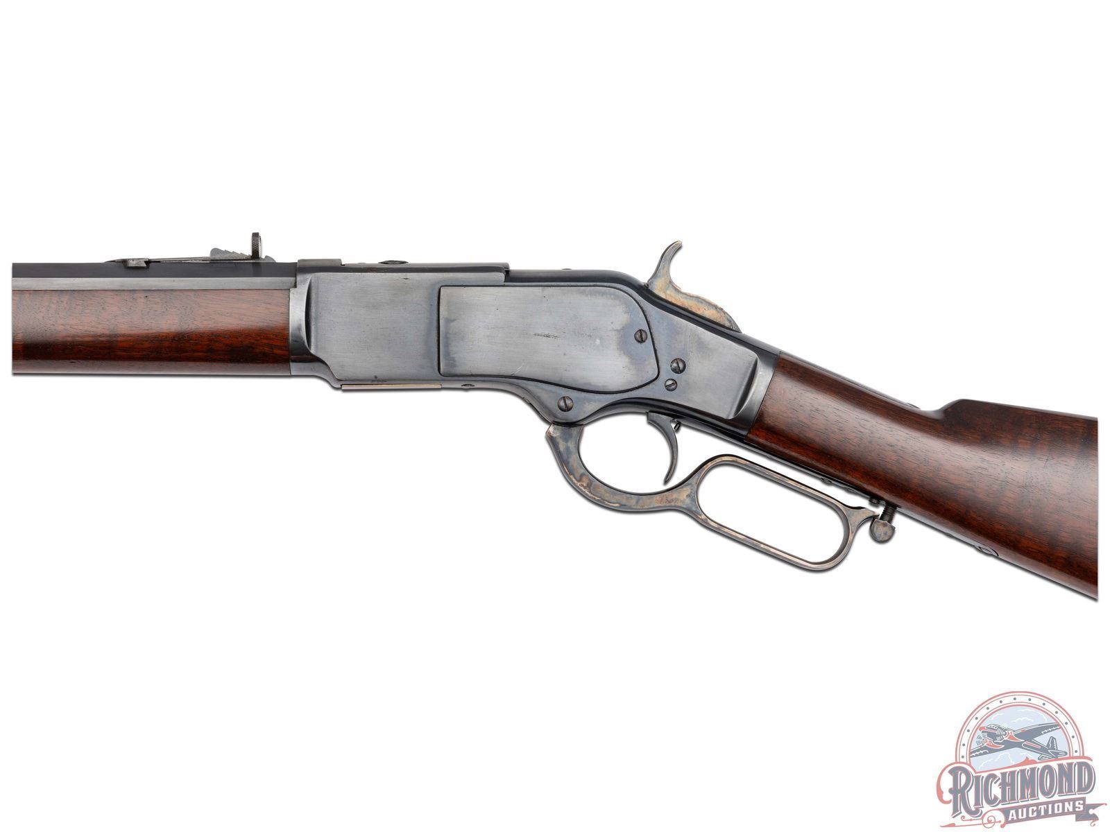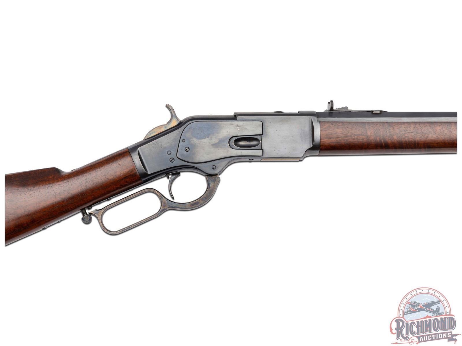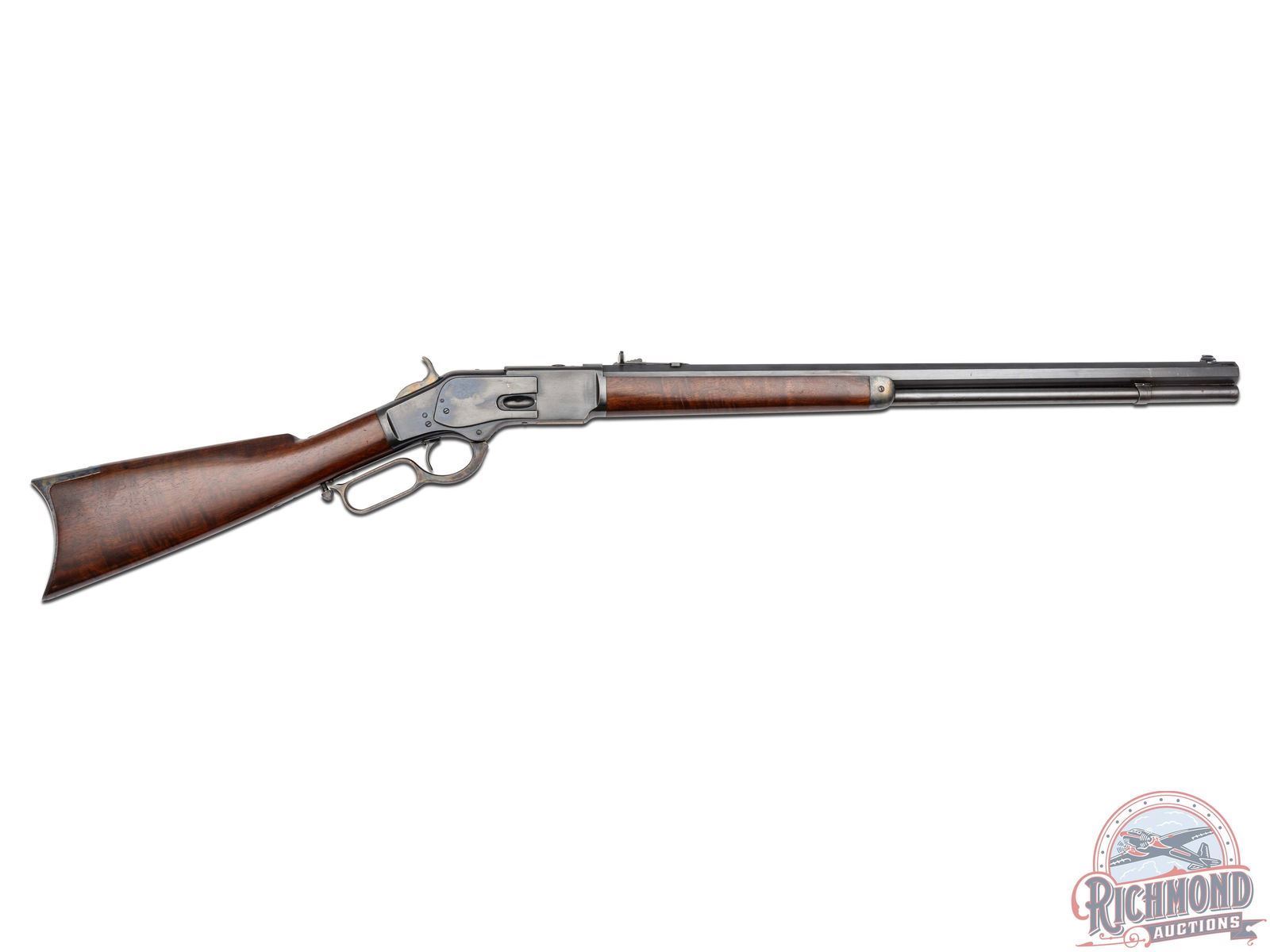 Manufactured in 1874. This professional refurbished rifle features a 24" octagon barrel with full length magazine tube, rear semi-buckhorn notch sight and Marble's blade front sight. Caliber is not marked but barrel gage indicates it is .44, buyer is recommended to have this checked with a professional gunsmith. Blued receiver with case-hardened lever, safety and hammer. Side loading gate and brass gate. Walnut straight grip stock with matching forearm. Fitted with a case-hardened crescent butt plate and forearm tip. LOP: 12-1/2". CALIBER: 44-40. S/N: 1705. FFL STATUS: Antique.