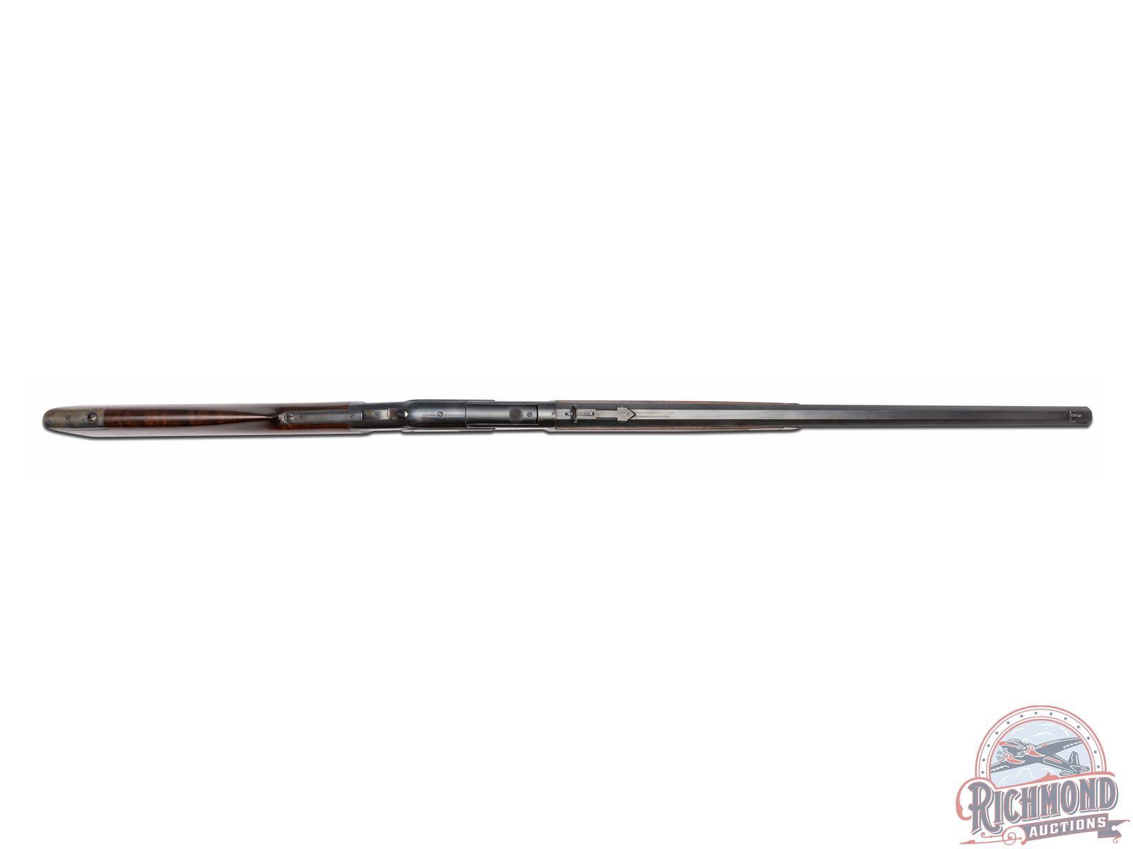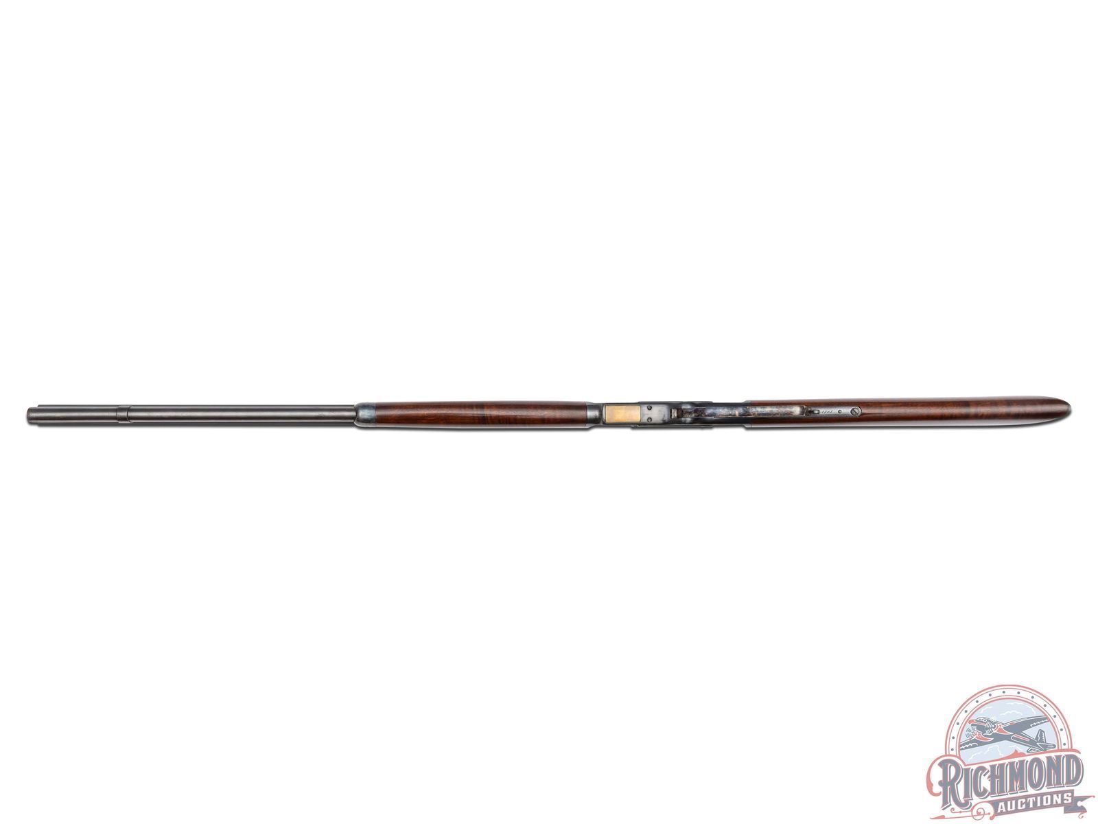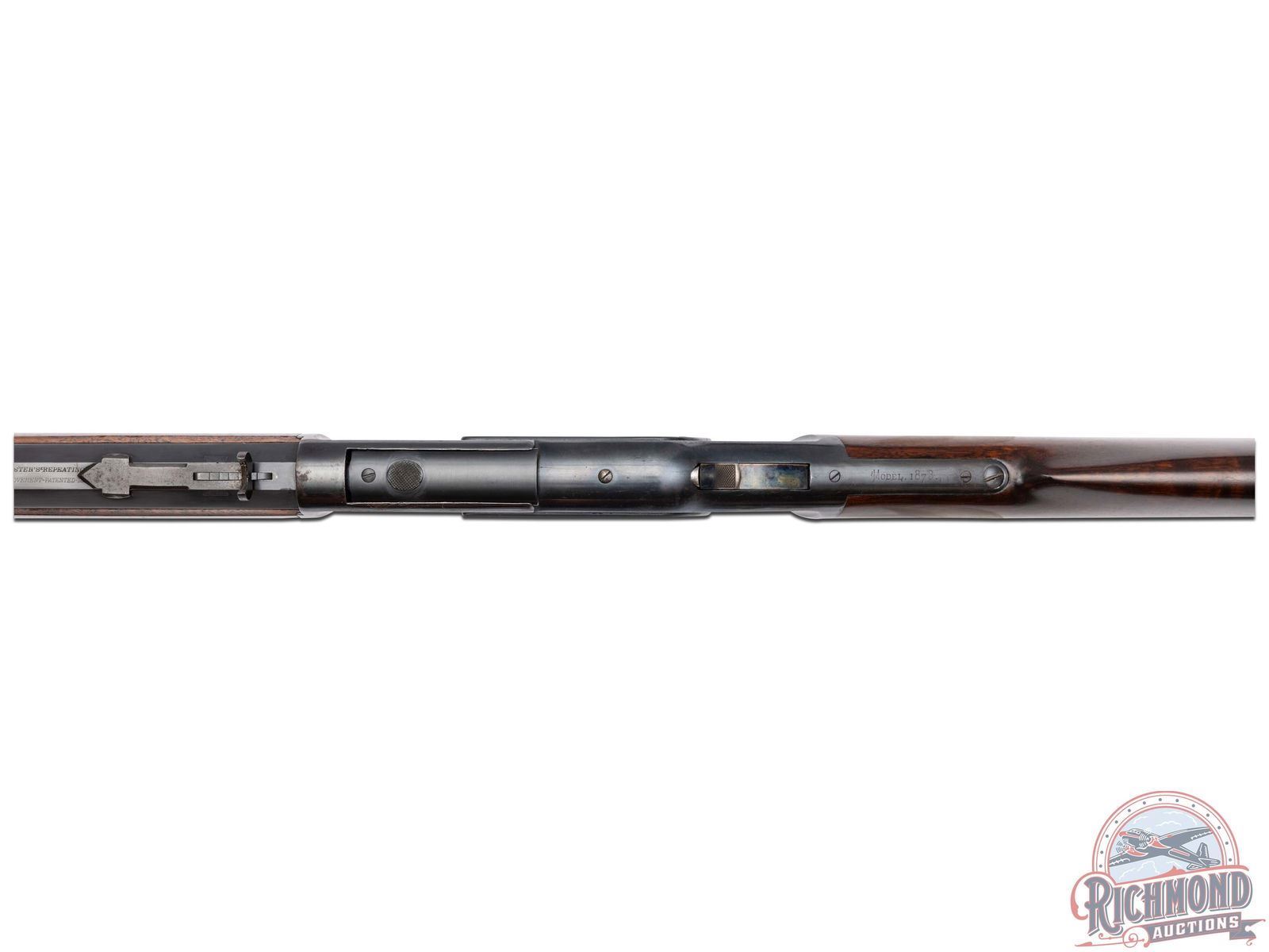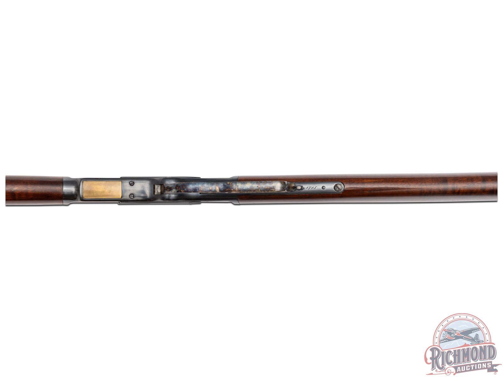 Manufactured in 1874. This professional refurbished rifle features a 24" octagon barrel with full length magazine tube, rear semi-buckhorn notch sight and Marble's blade front sight. Caliber is not marked but barrel gage indicates it is .44, buyer is recommended to have this checked with a professional gunsmith. Blued receiver with case-hardened lever, safety and hammer. Side loading gate and brass gate. Walnut straight grip stock with matching forearm. Fitted with a case-hardened crescent butt plate and forearm tip. LOP: 12-1/2". CALIBER: 44-40. S/N: 1705. FFL STATUS: Antique.