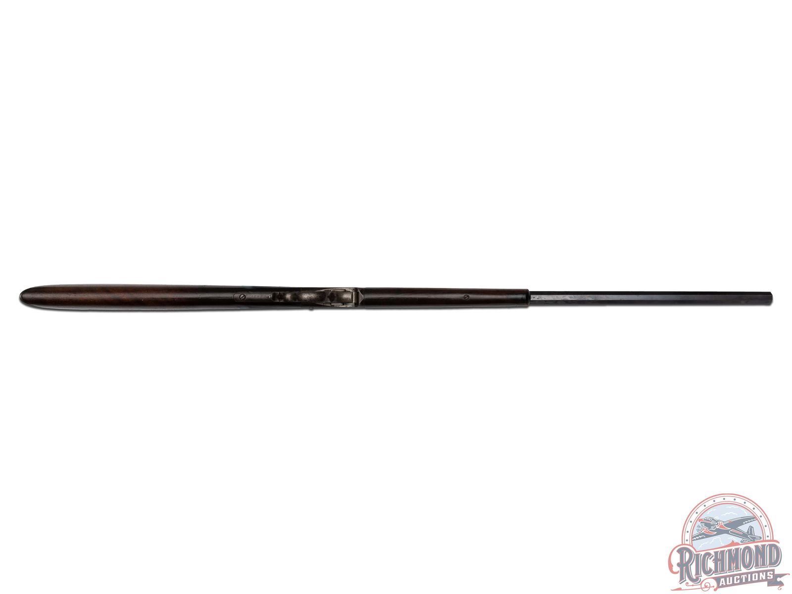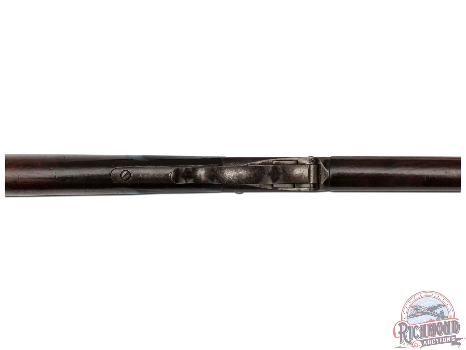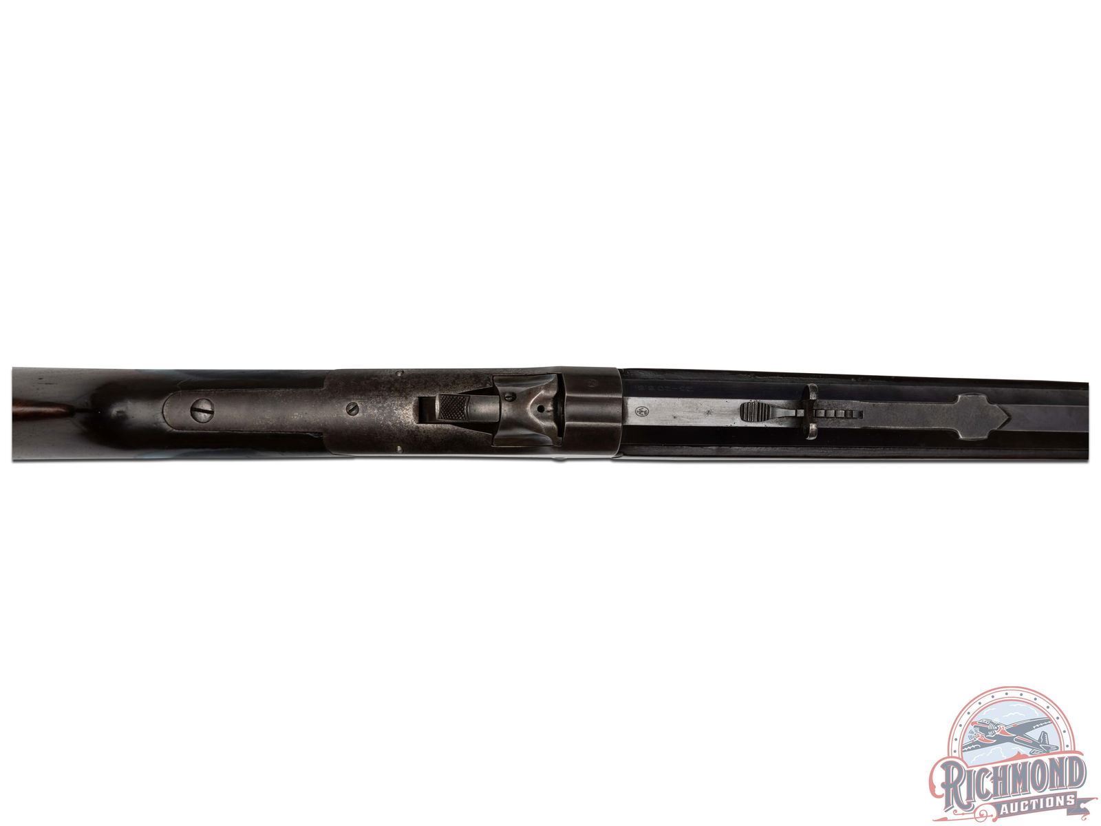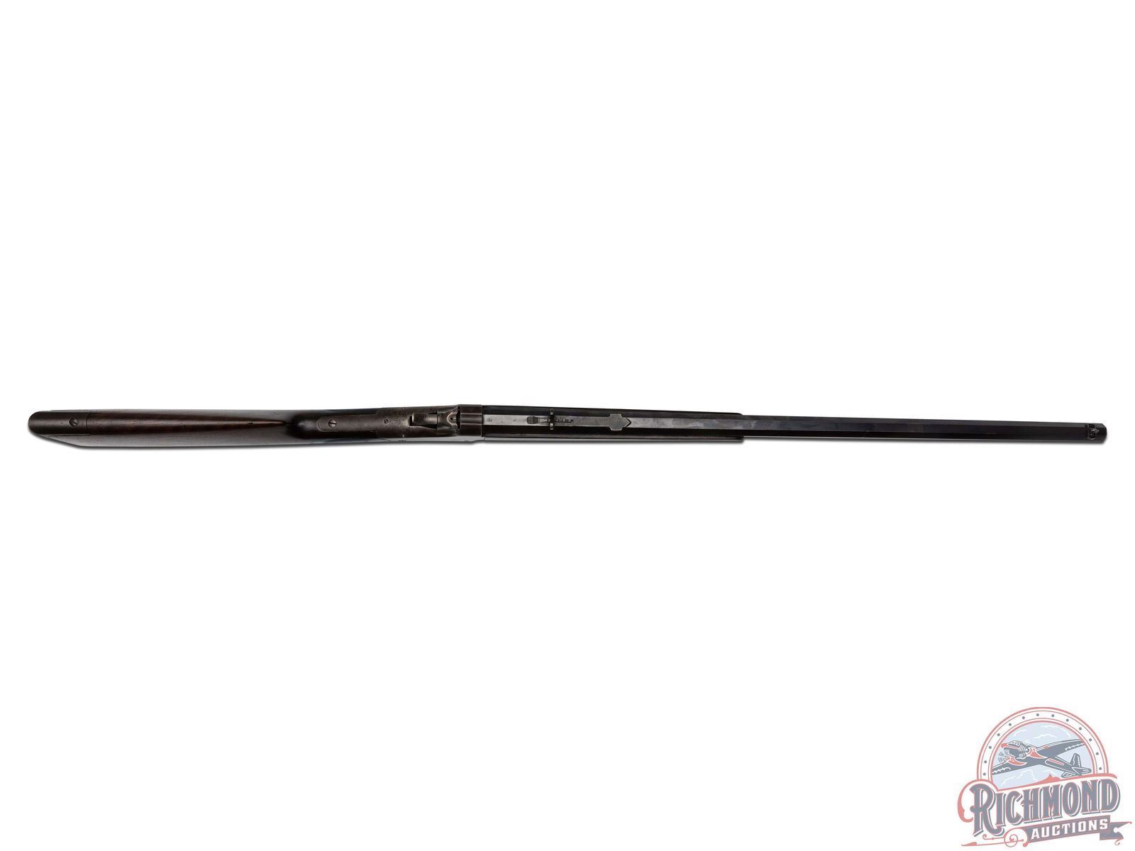 Manufactured in 1893. This antique low wall features a 26" blued octagon barrel chambered for the .25-20 Single Shot cartridge. Barrel weight No. 1, stamped on the bottom. Two-line Winchester address stamped on the left barrel flat and Winchester proof marks stamped on both the barrel and receiver. Rear adjustable semi-buckhorn sight and blade front sight. Straight walnut stock fitted with original crescent metal butt plate. Matching wood forearm with Schnabel tip. Cody Museum quick check letters as a 22 WCF caliber, but does show a return and repair dated January 5, 1914. It is factory stamped "REBORE" under the forearm with JPP inspection marks. LOP: 13". CALIBER: 25-20 SS. S/N: 63457. FFL STATUS: Antique.